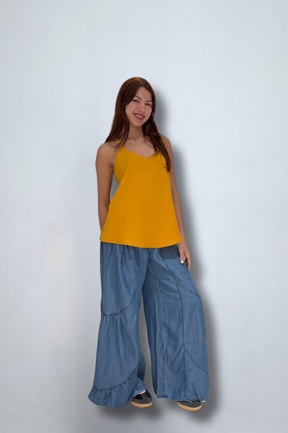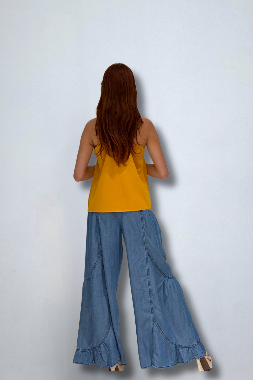 Wide leg palazzo silhouette with flare hem