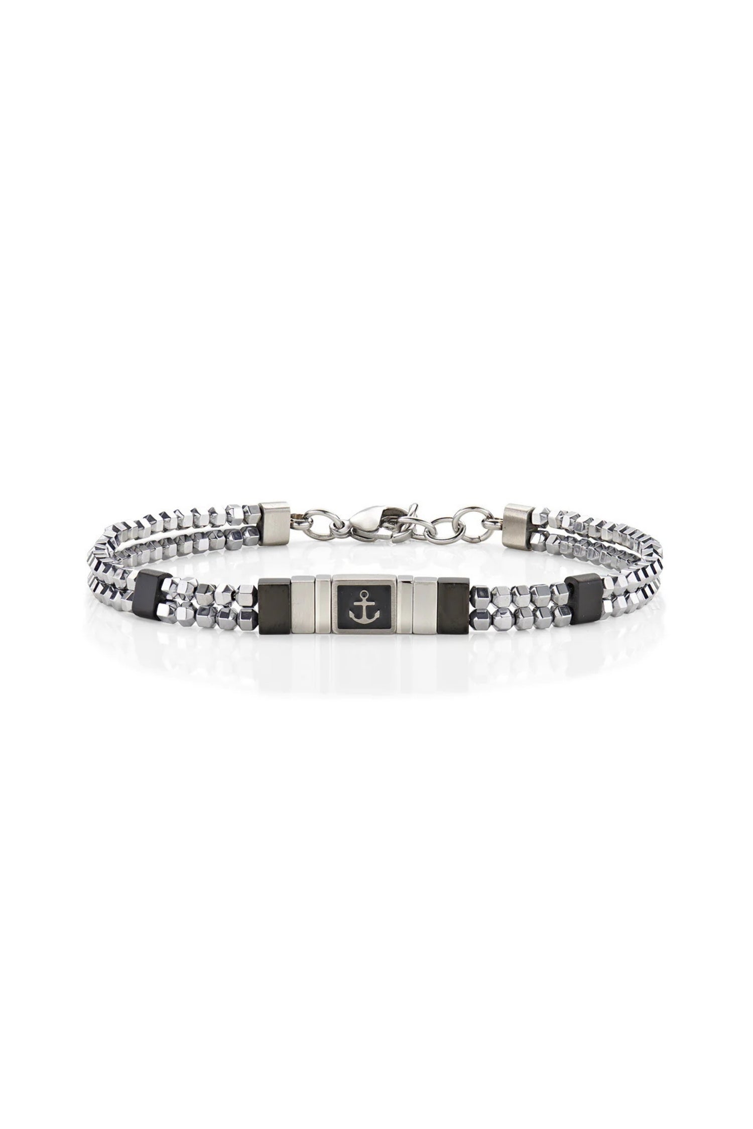 Men’s bracelet in stainless steel with hematite and black enamelled elements. A central anchor detail. Adjustable length from 19 to 22 cm with lobster clasp.