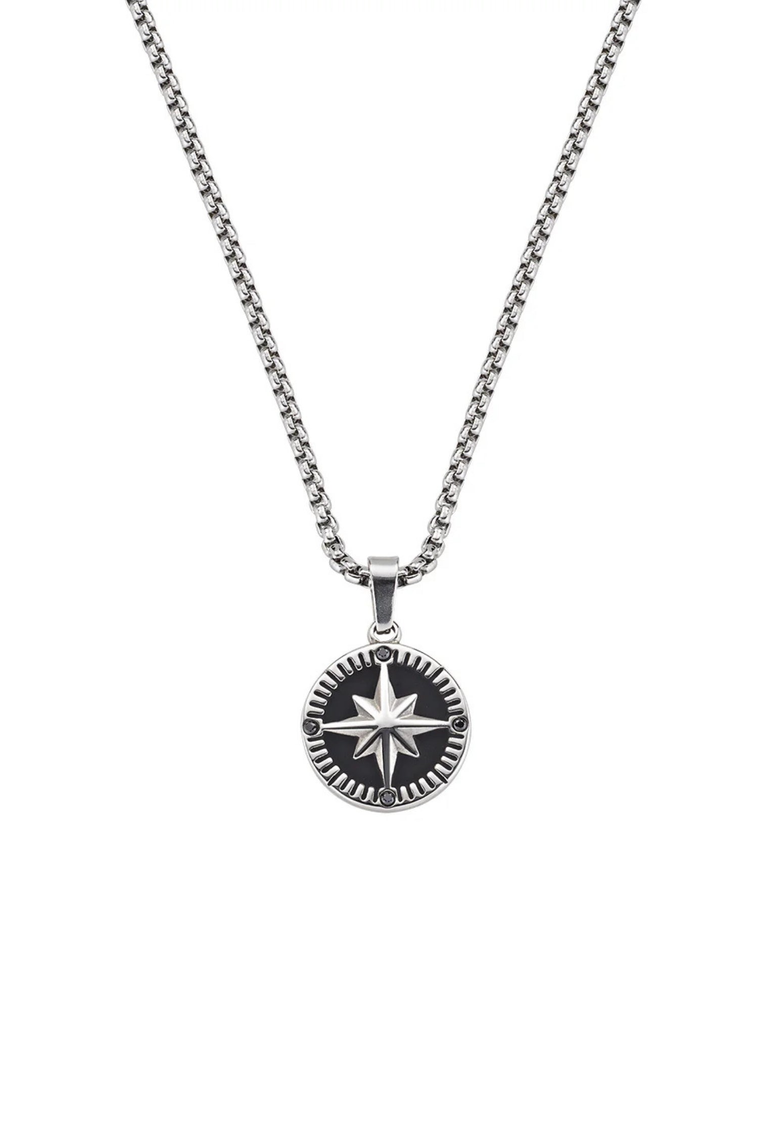 Men’s necklace in stainless steel featuring a box chain and a pendant medal with an eight-point compass rose and four black zirconia stones marking the cardinal points. Dual finish in polished and antiqued steel, adjustable length from 50 to 55 cm with lobster clasp.