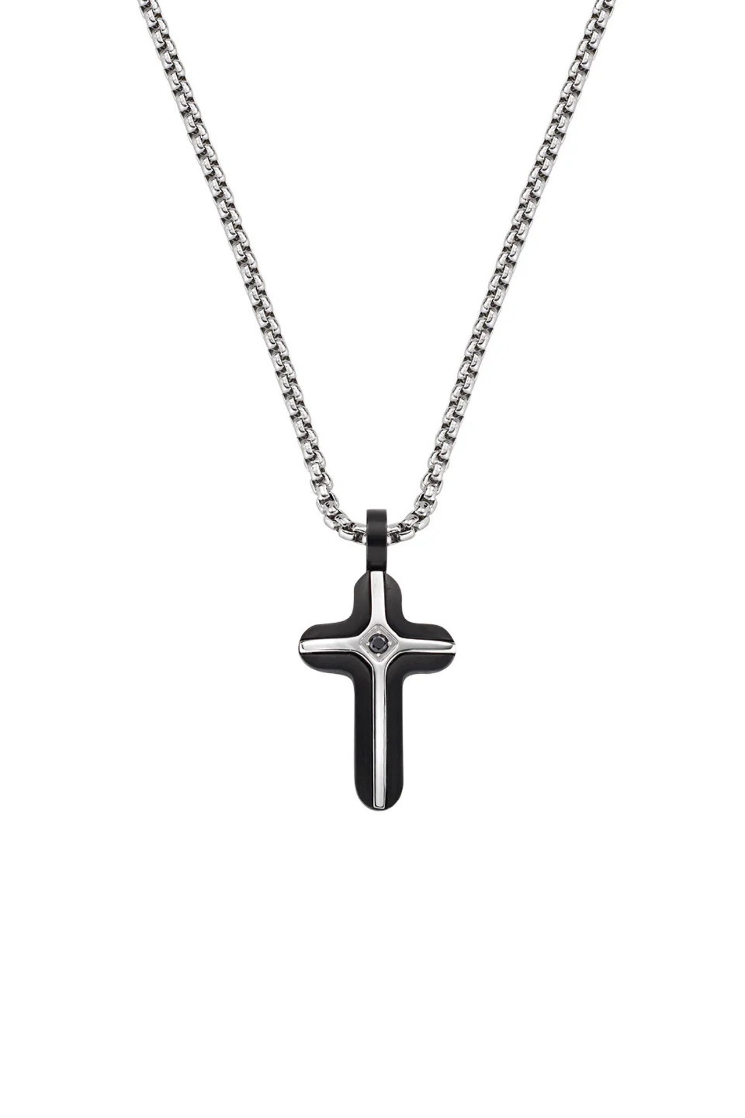 Men’s necklace in stainless steel featuring a box chain and a cross pendant with a black zircon set in the center. Dual finish in polished steel and black PVD, adjustable length from 50 to 55 cm with lobster clasp.