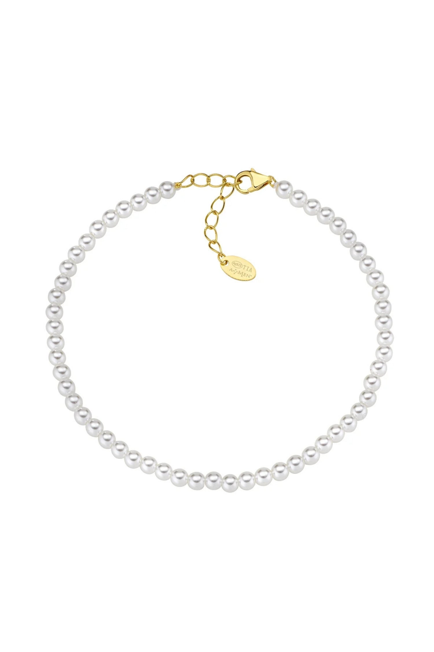 3 mm crystal pearls bracelet with yellow gold-plated sterling silver. Length can be adjusted from 16 to 19 cm. These small and delicate pearls are perfect to match with other bracelets or to wear alone for a pure and simple look.