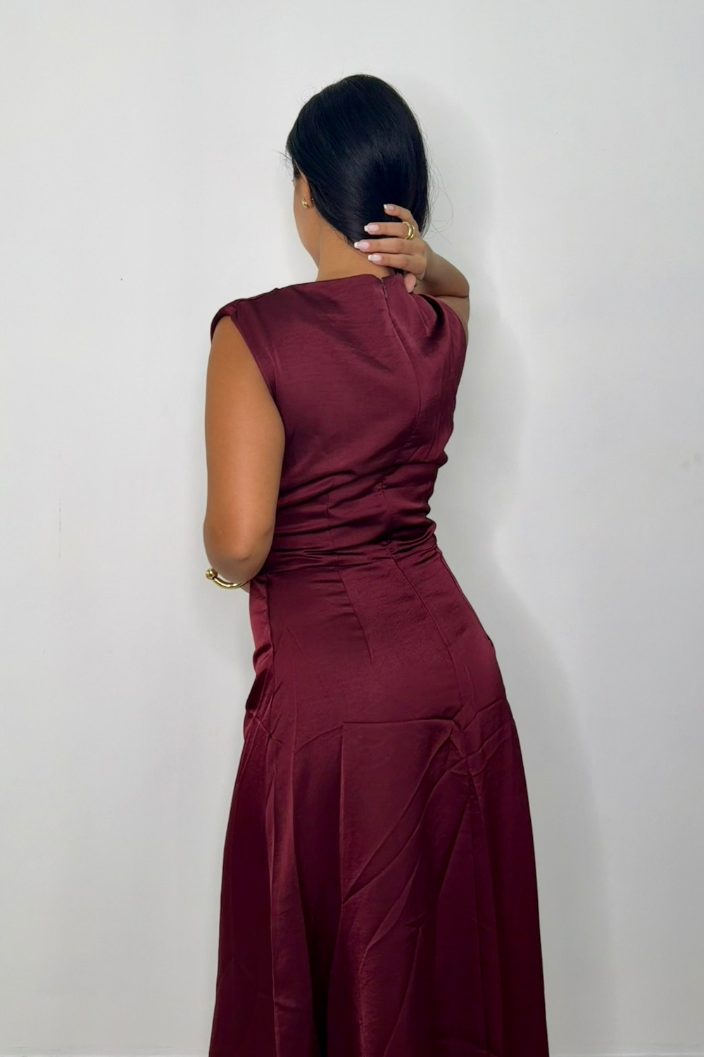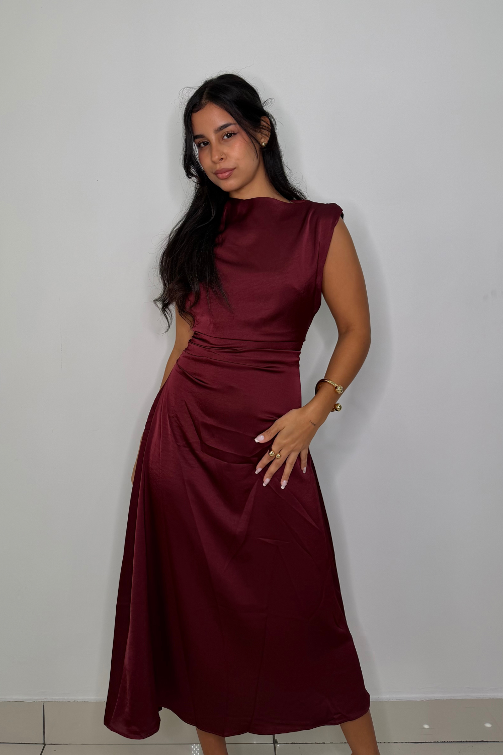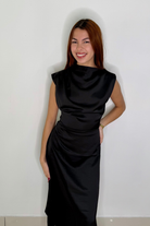 This is an elegant satin midi dress, designed to make a refined statement. It features structured shoulders, a high neckline, and delicate side ruching that enhances the waistline while providing a flattering fit.