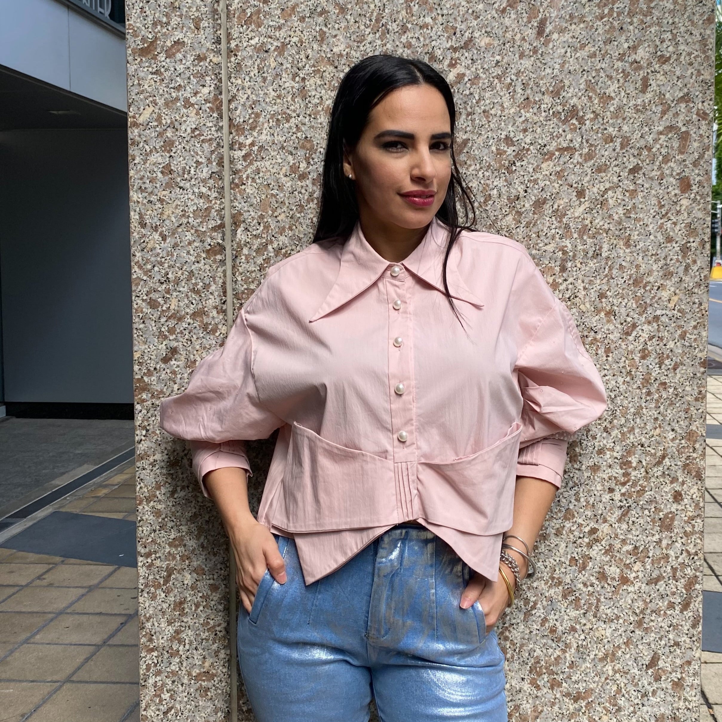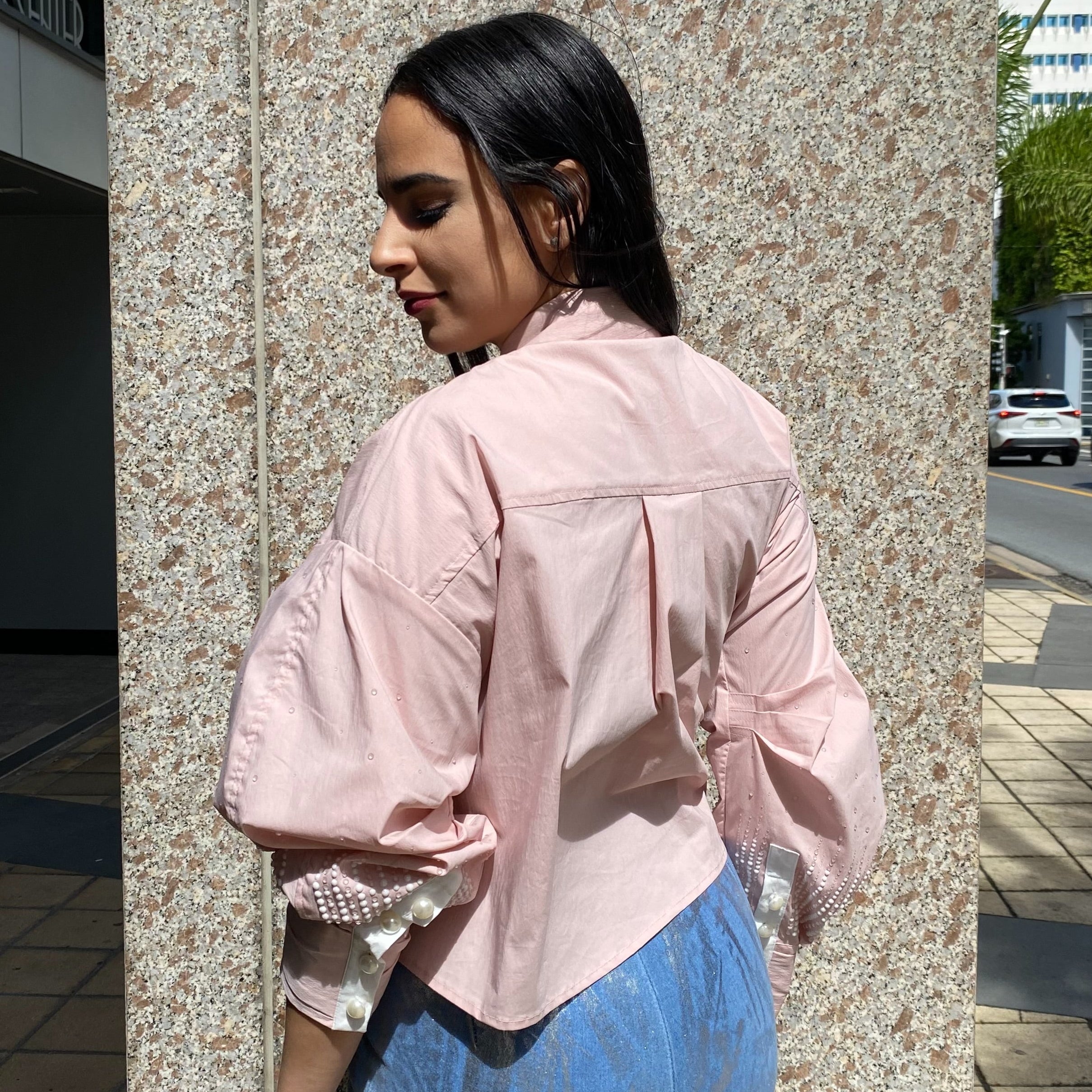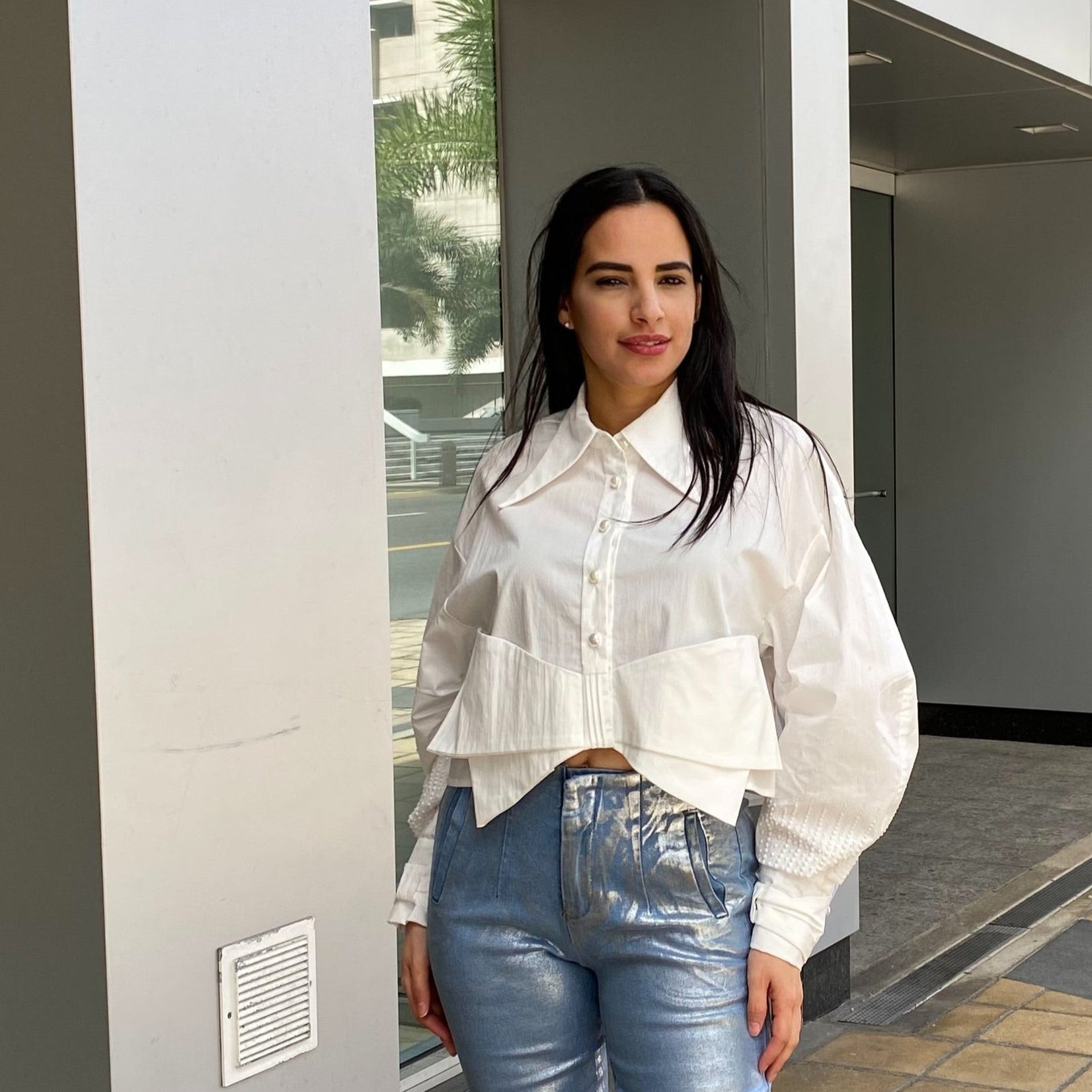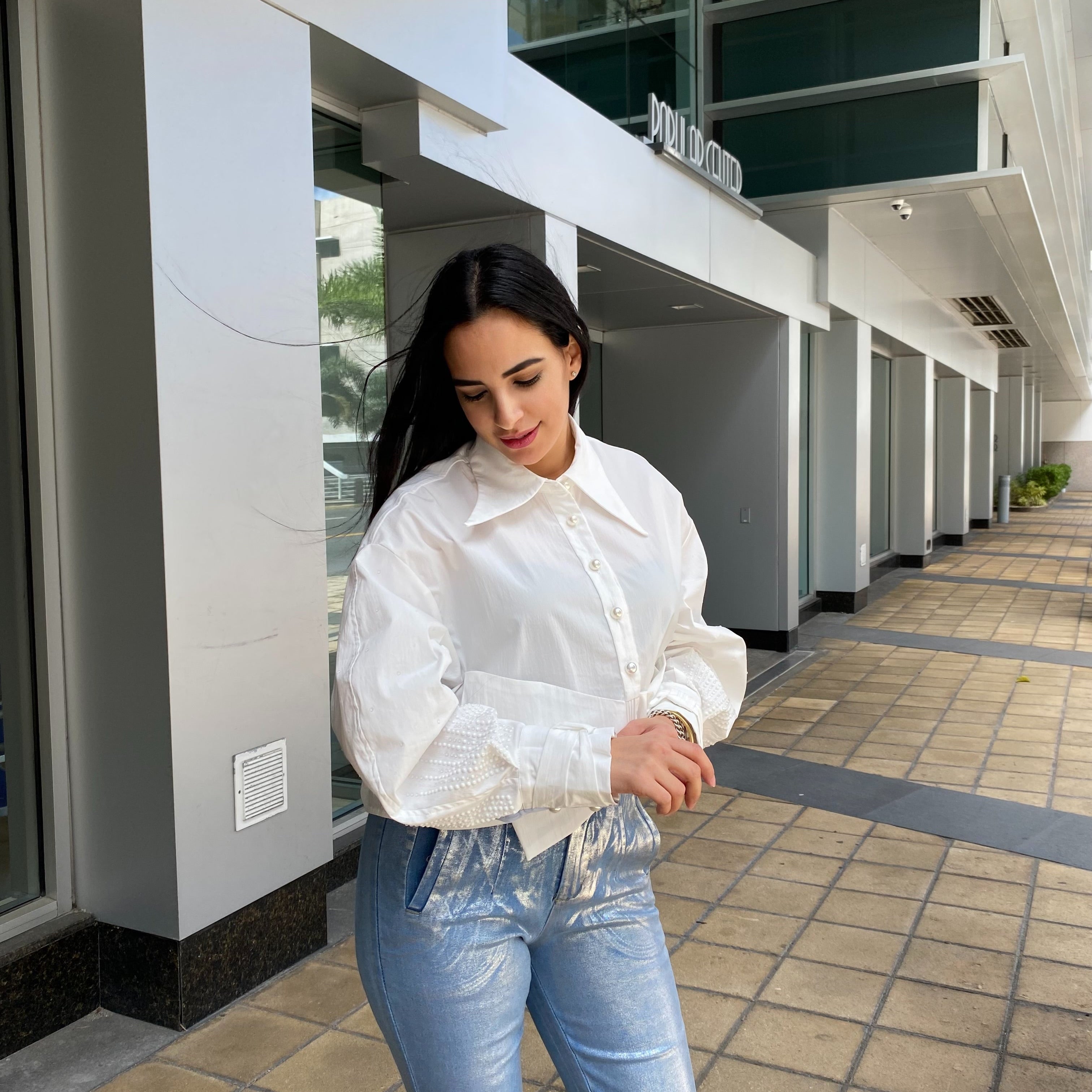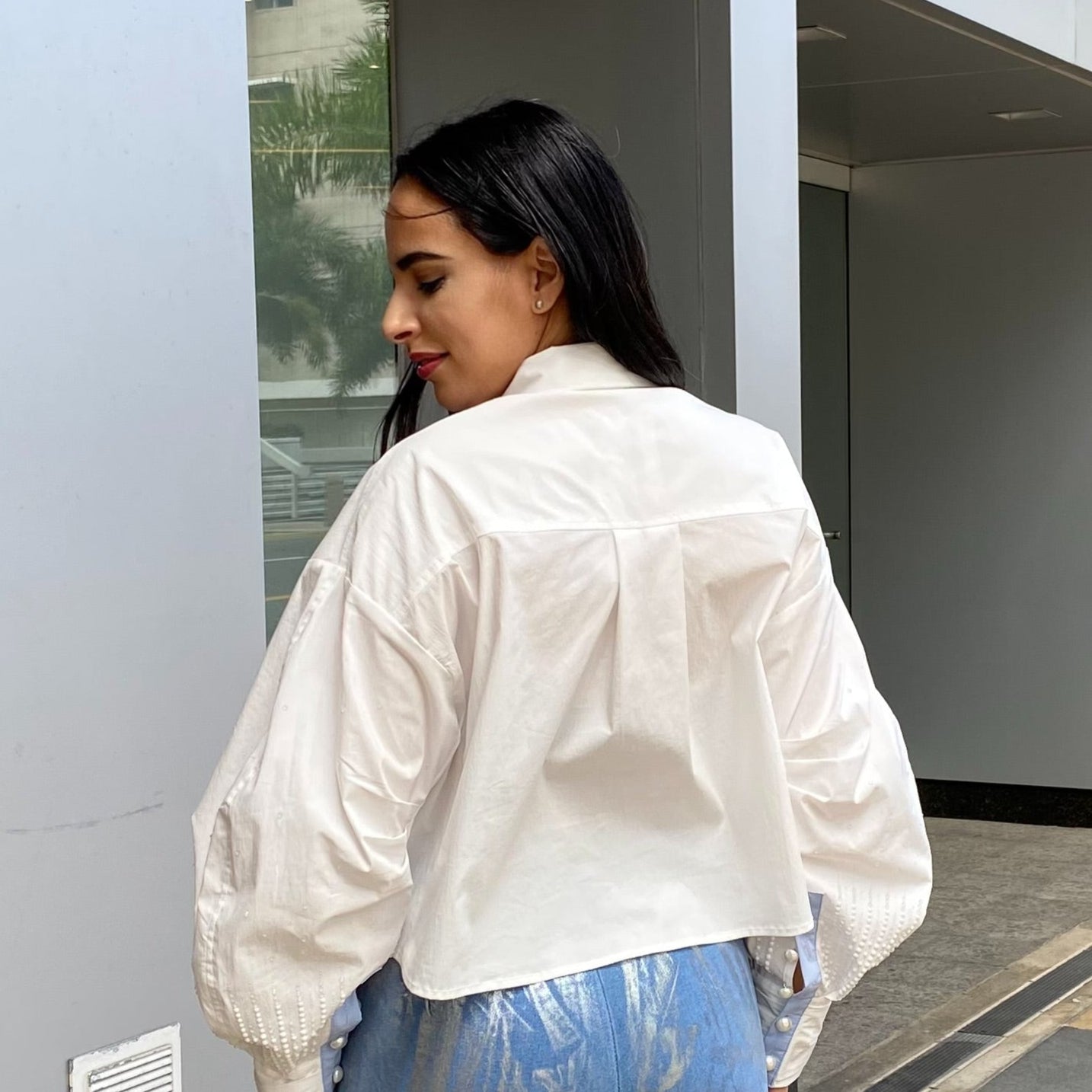 Ribbon-Detail Structured Cropped Shirt -Pointed collar with button-down front closure - Pearl button detailing for an elegant touch -Asymmetrical cropped hemline with ribbon-inspired detailing for a feminine and stylish look -Long sleeves featuring contrasting cuff accents -Voluminous sleeves with textured dot patterns for added visual interest