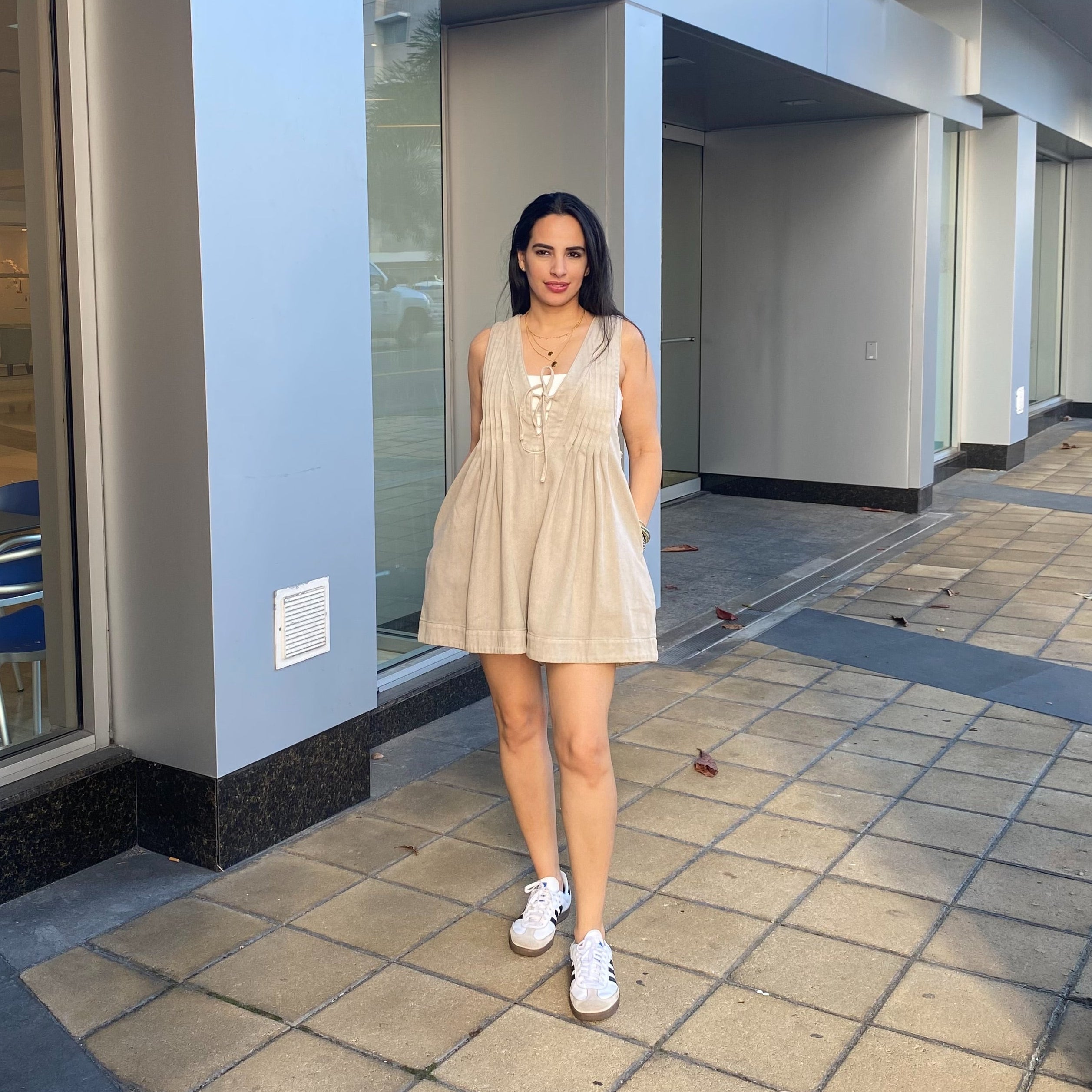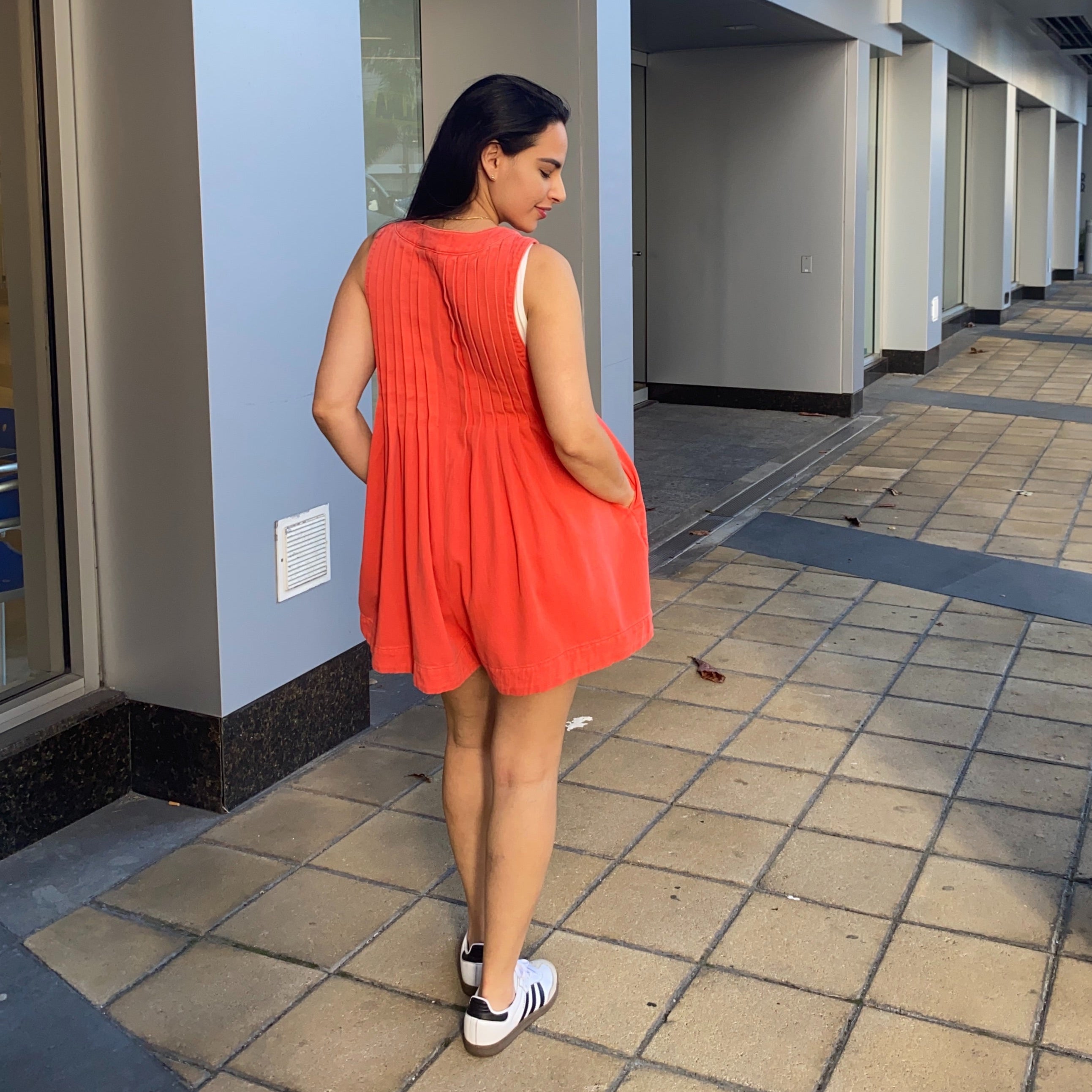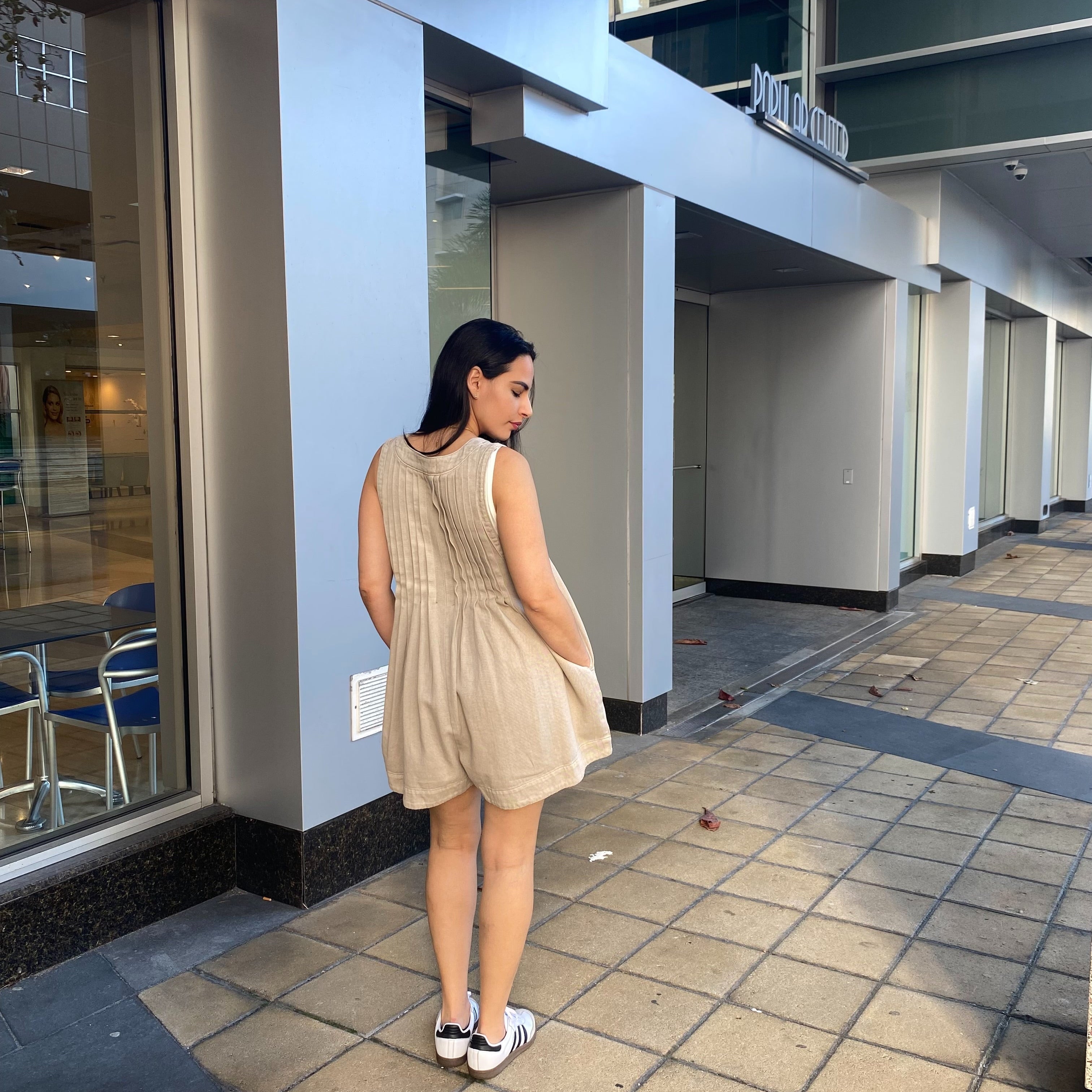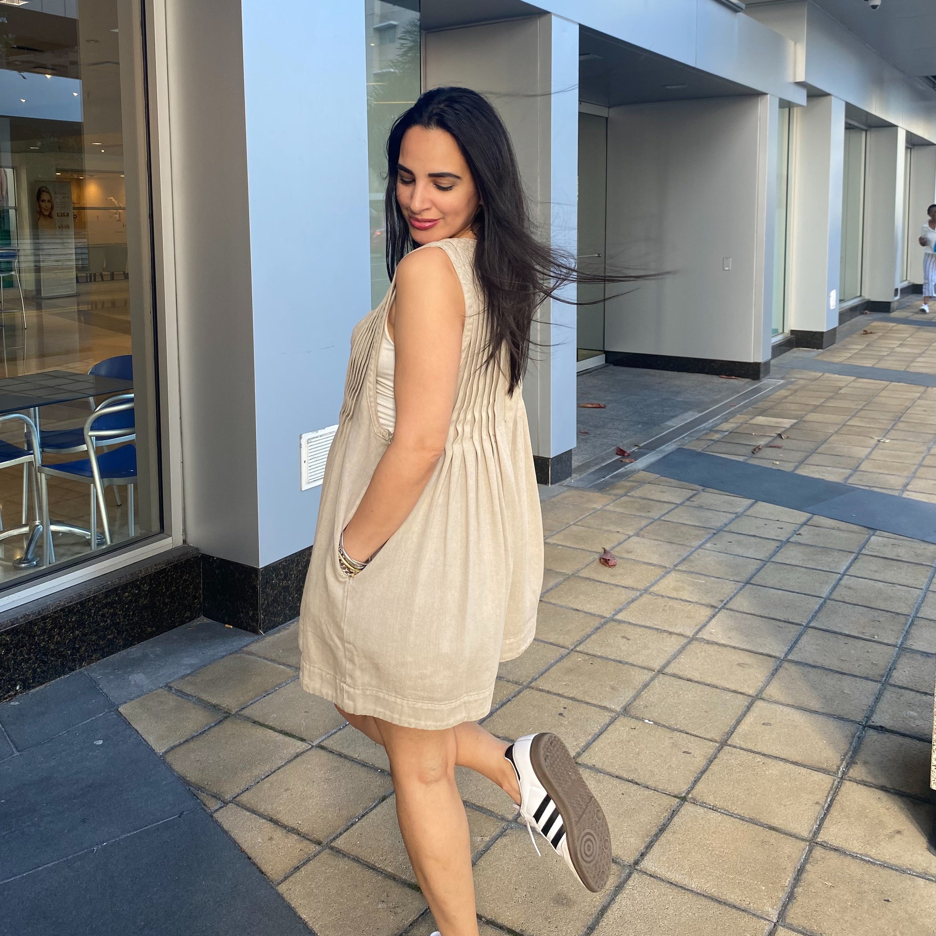 Washed denim -Deep v-neck with string tie -Pleated detail back -Sleeveless -Side pocket -Mini length -