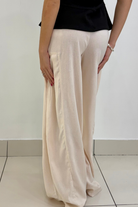 These are high-waisted wide-leg pants in a soft color. They feature a self-tie belt at the waist for a flattering and adjustable fit, along with side pockets that add both style and functionality. The design includes elegant side pleatsor panels that give the pants a flowing, relaxed silhouette, ideal for creating a chic yet comfortable look.