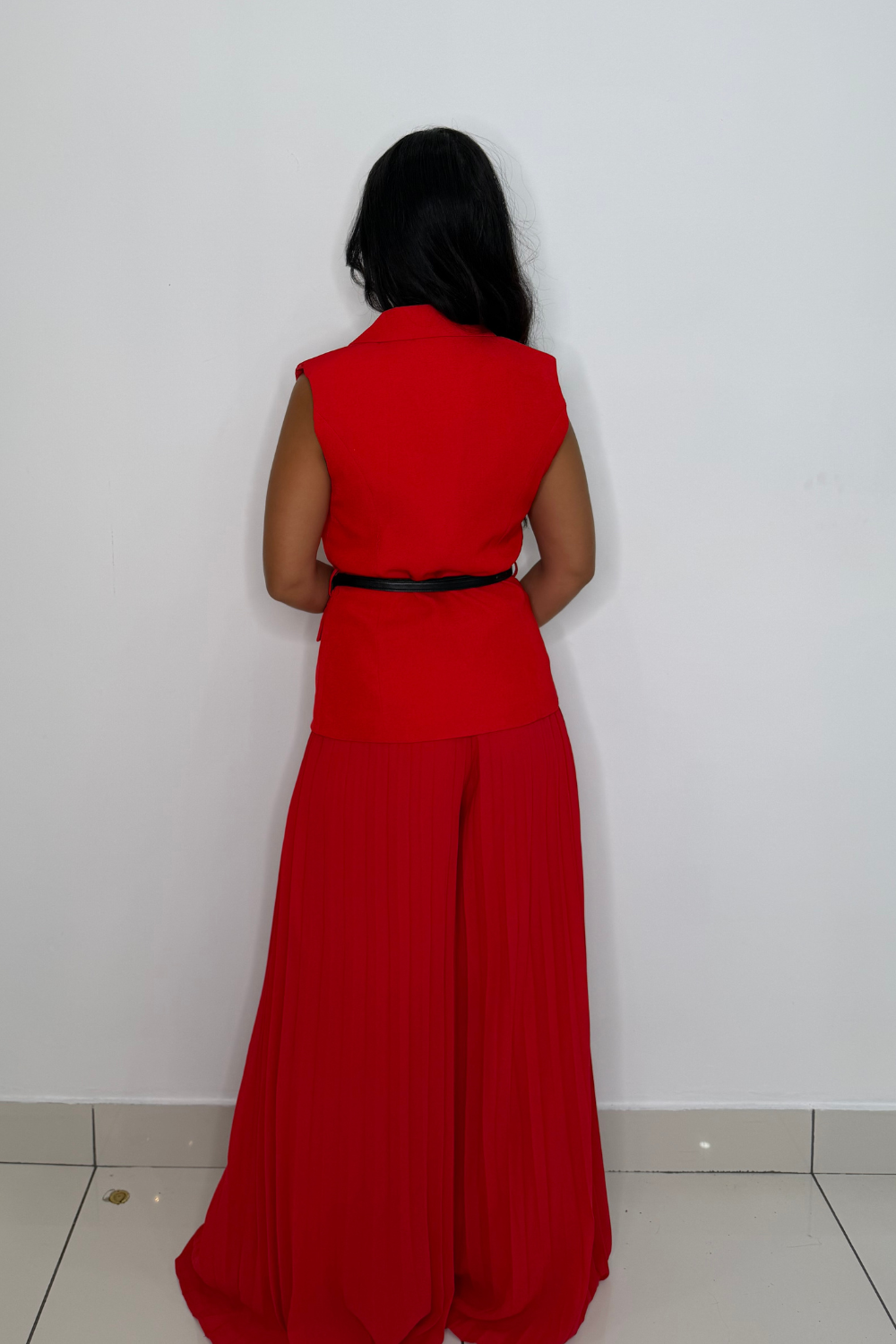 This striking pleated set exudes elegance and confidence. It features a sleeveless double-breasted blazer-style top with flap pockets and button details, paired with wide-leg pleated pants that flow beautifully with every step. The look is finished with a slim black belt to define the waist and add contrast.