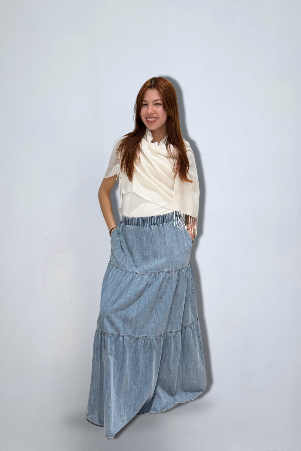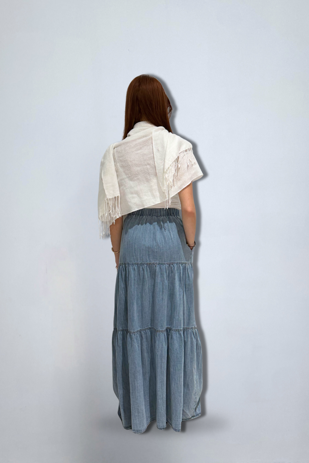Washed denim tiered long skirt with back elastic waist band and pockets