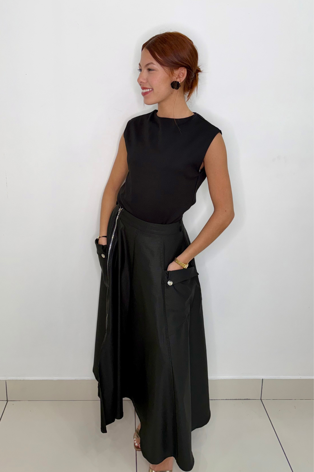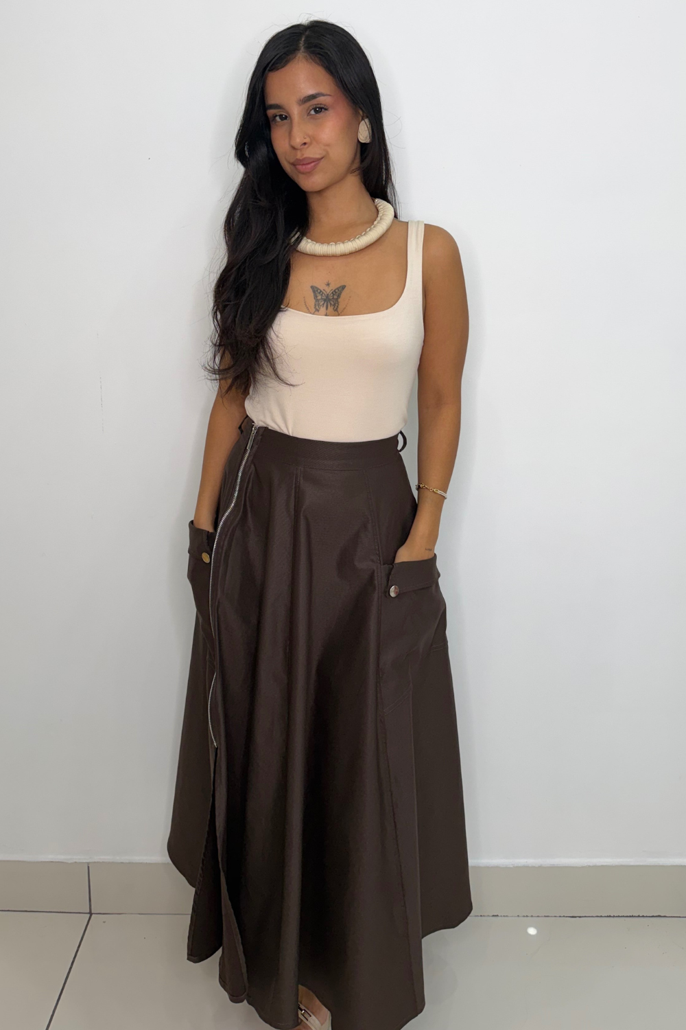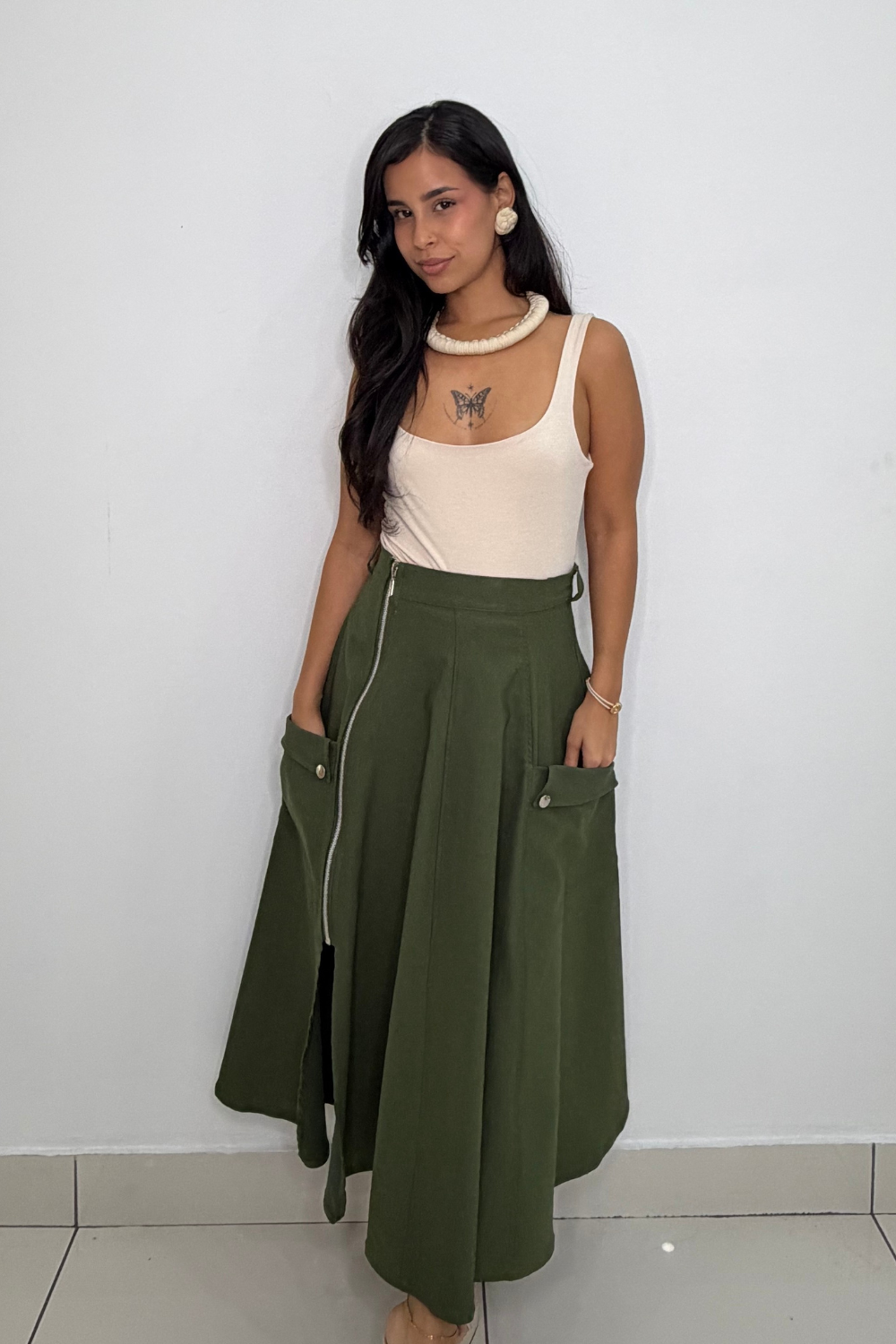 Midi skirt with a side zipper and side pockets, perfect for any occasion. Its versatile design combines elegance and functionality, adapting to different styles.