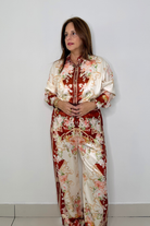 A two-piece satin set featuring a long-sleeve button-down shirt and matching wide-leg pants. The design showcases an ornate baroque-inspired print in rich burgundy, ivory, and soft blush tones with floral and scroll details. The pants include an elastic waistband with stripe accents for comfort and style, while the coordinated shirt can be worn tucked in or open for a relaxed look.