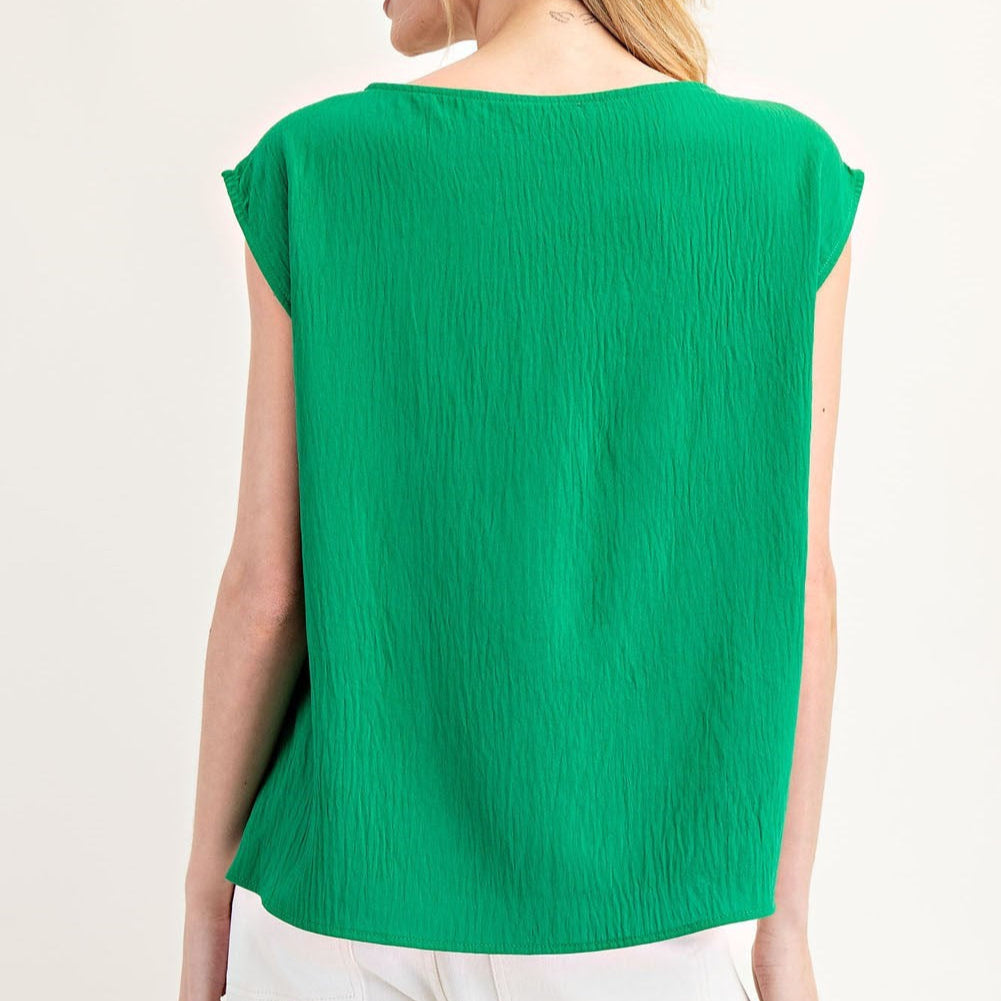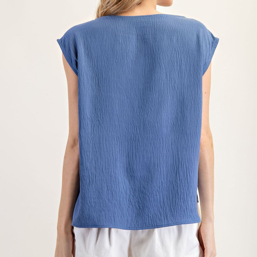This sleeveless top showcases a breezy, crinkled texture, a relaxed boxy silhouette, subtle cap sleeves, and a wide round neckline, complemented by a high-low hem with small side slits for effortless movement and a contemporary, casual-chic appeal.