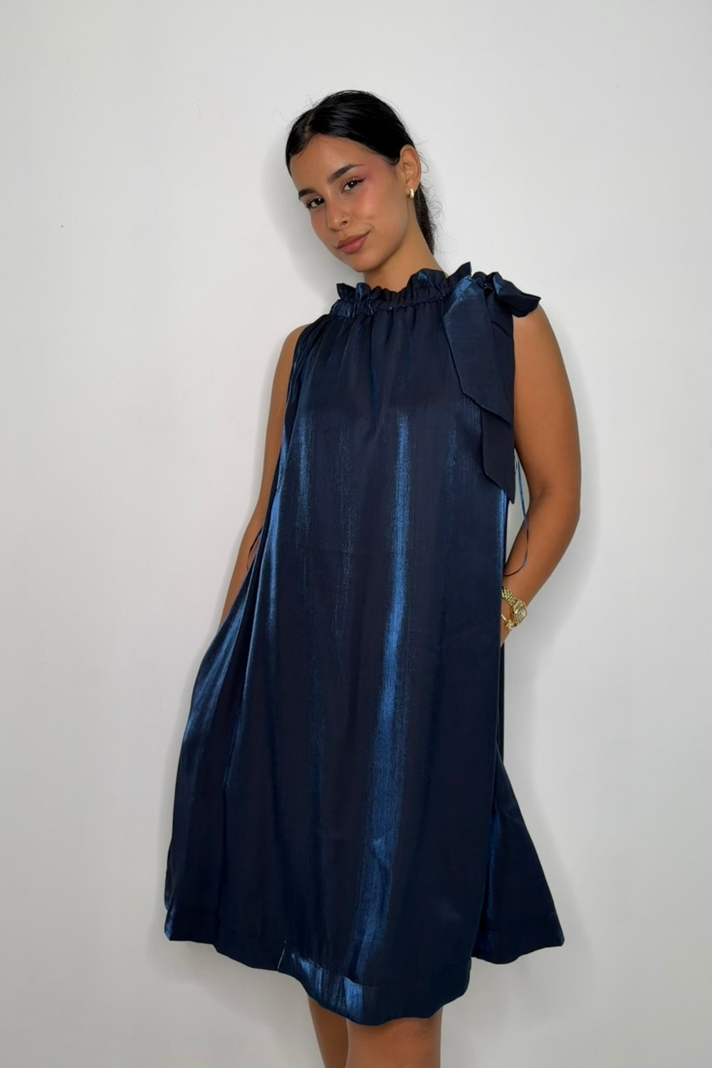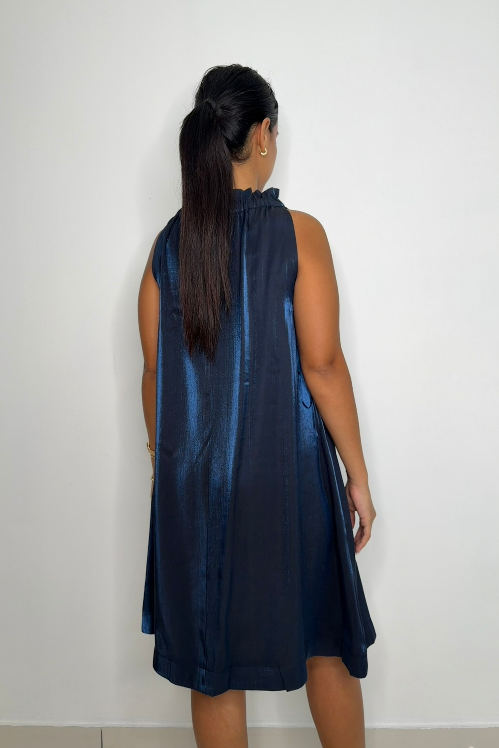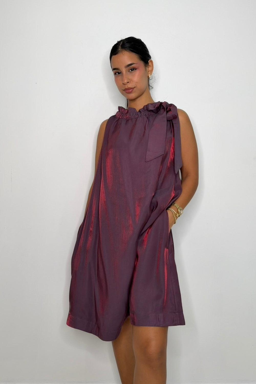 Lurex Pleats Long Sleeve Tiered Belted Dress