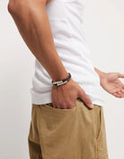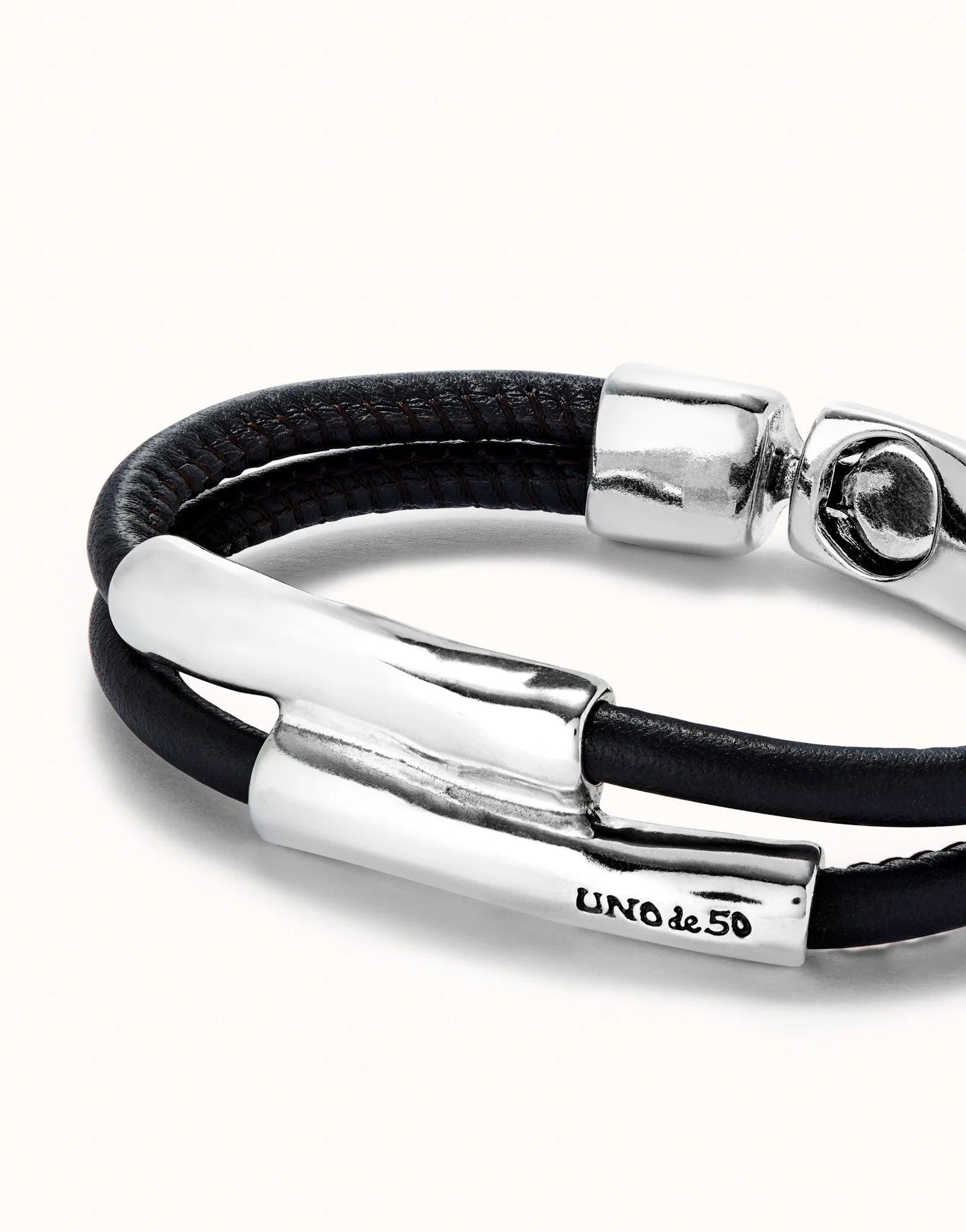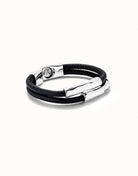 Double brown leather bracelet with two central sterling silver-plated tubes. Made in Spain with a 100% handmade process.Genderless jewelry collection that combines leather with tube-shaped, silver-plated and organic finish pieces. Discover the collection ser natural.