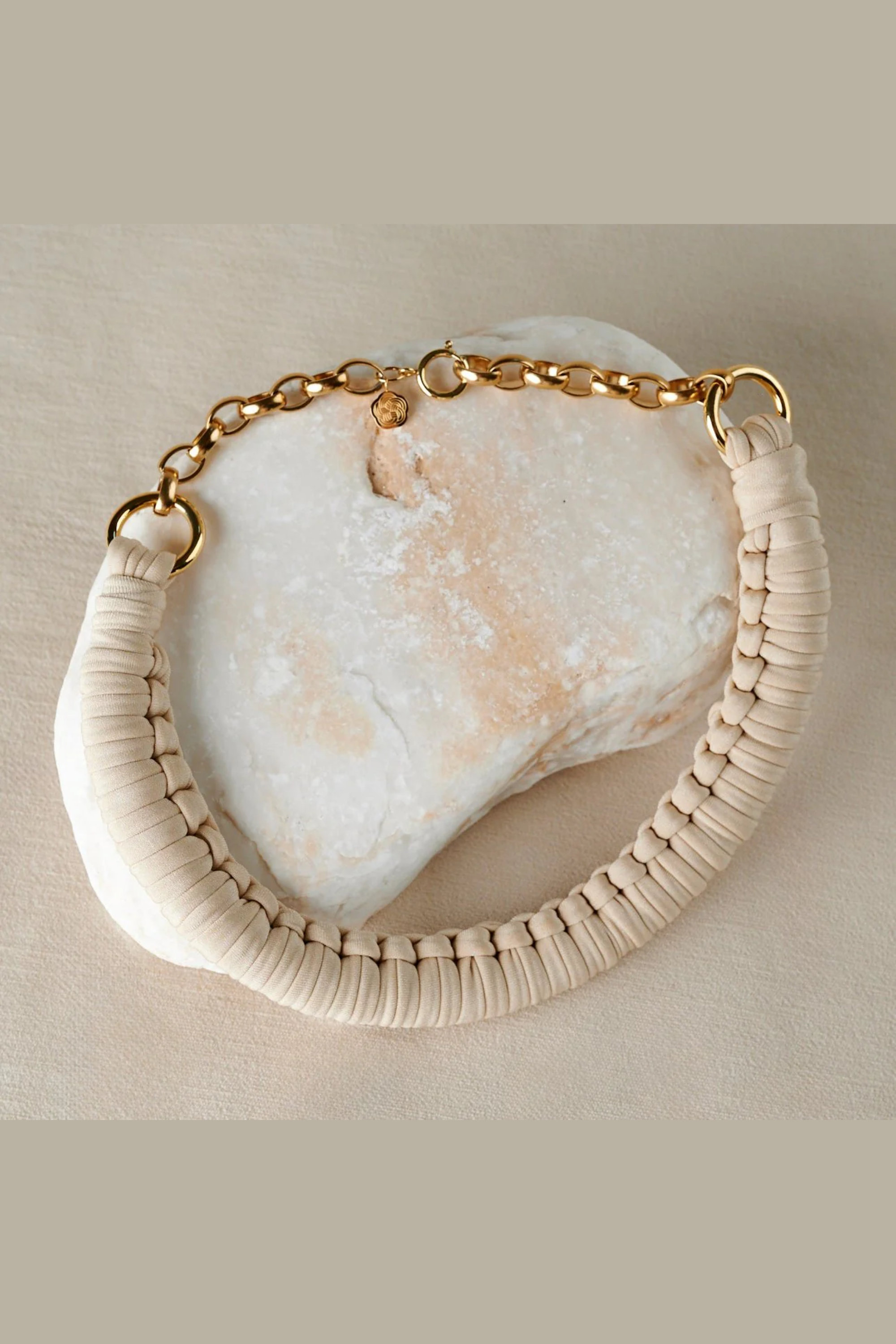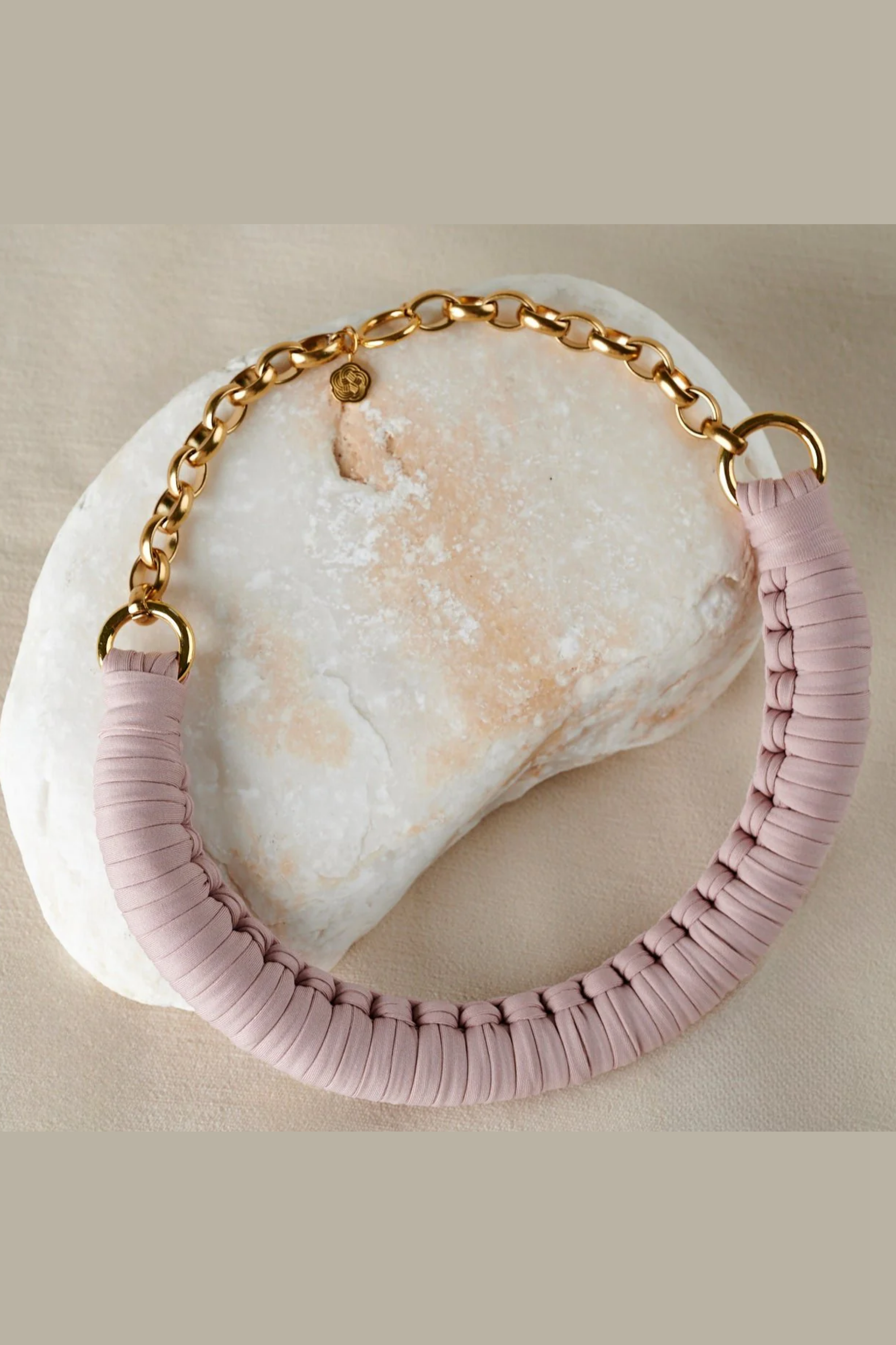 This attractive statement piece is a showcase of craftsmanship. Our statement necklace is crafted from a carefully selected fabric using macramé technique combined with elegant brass closures.