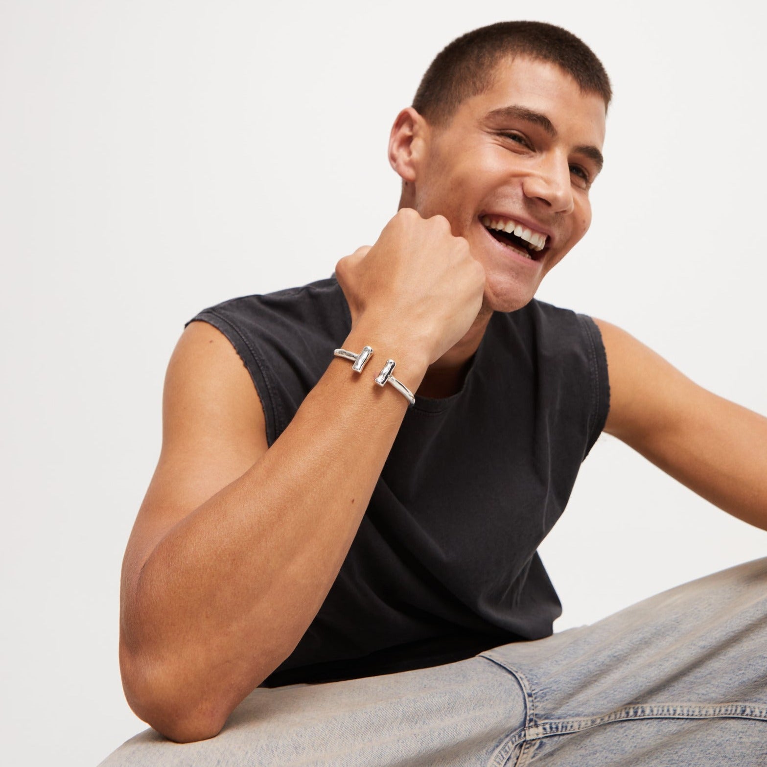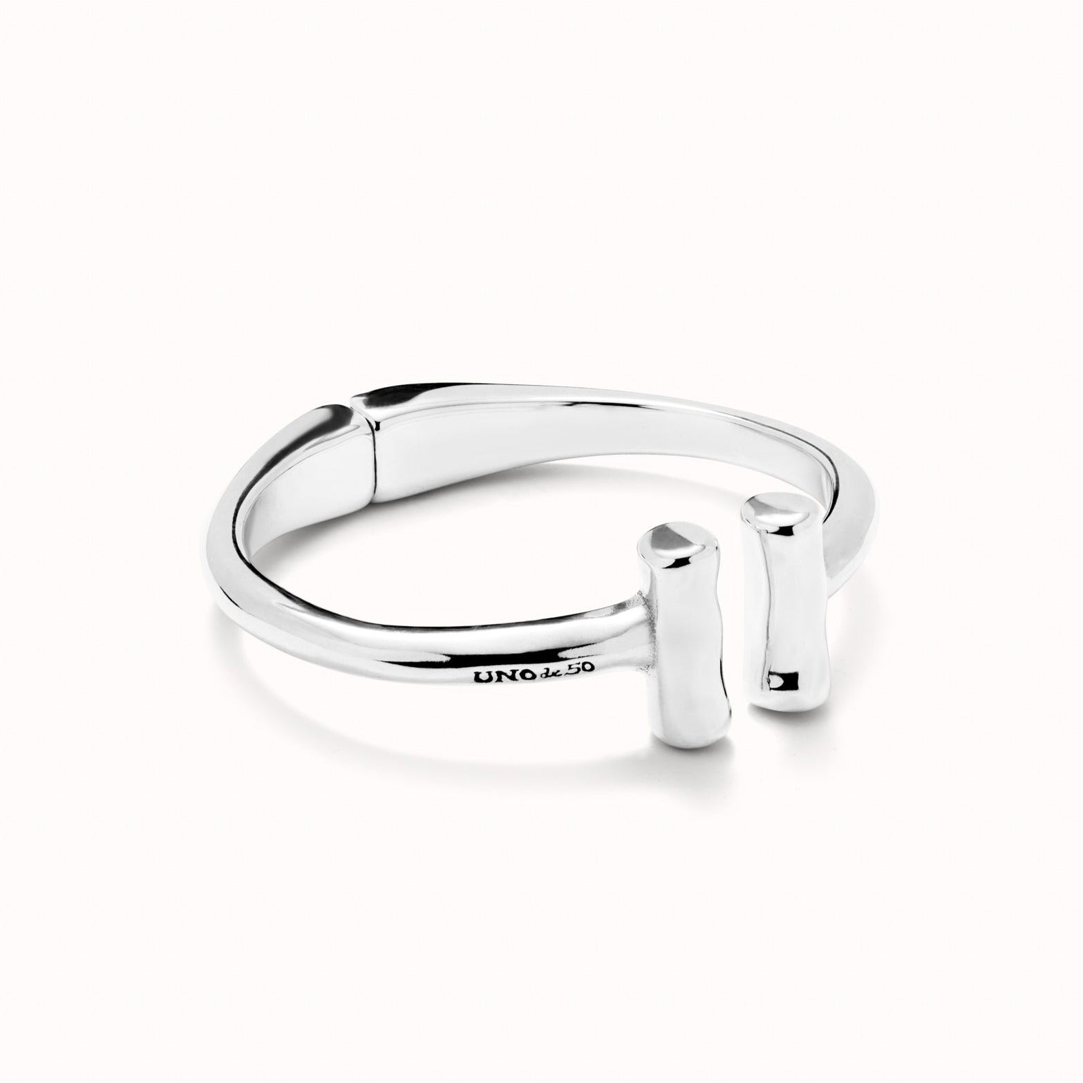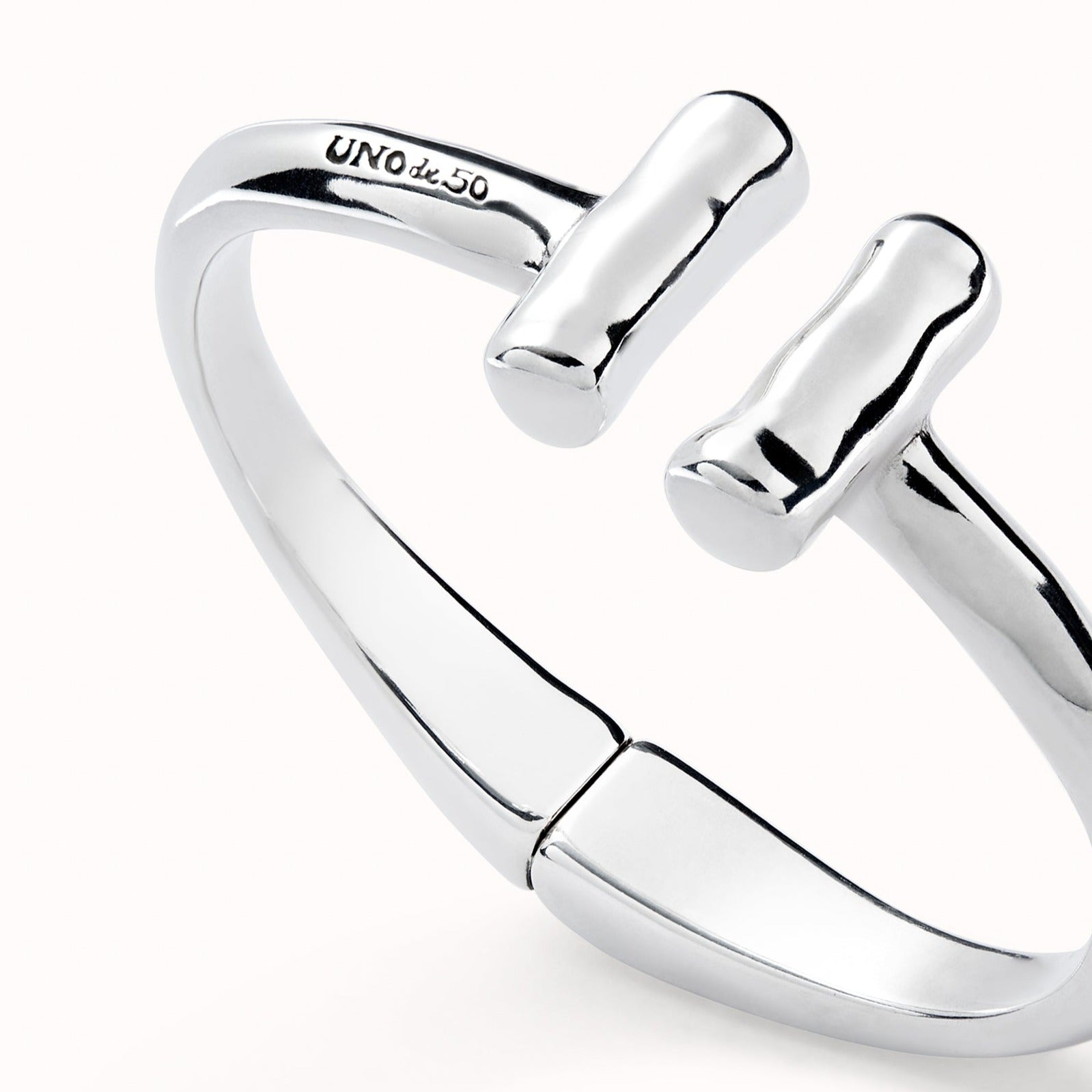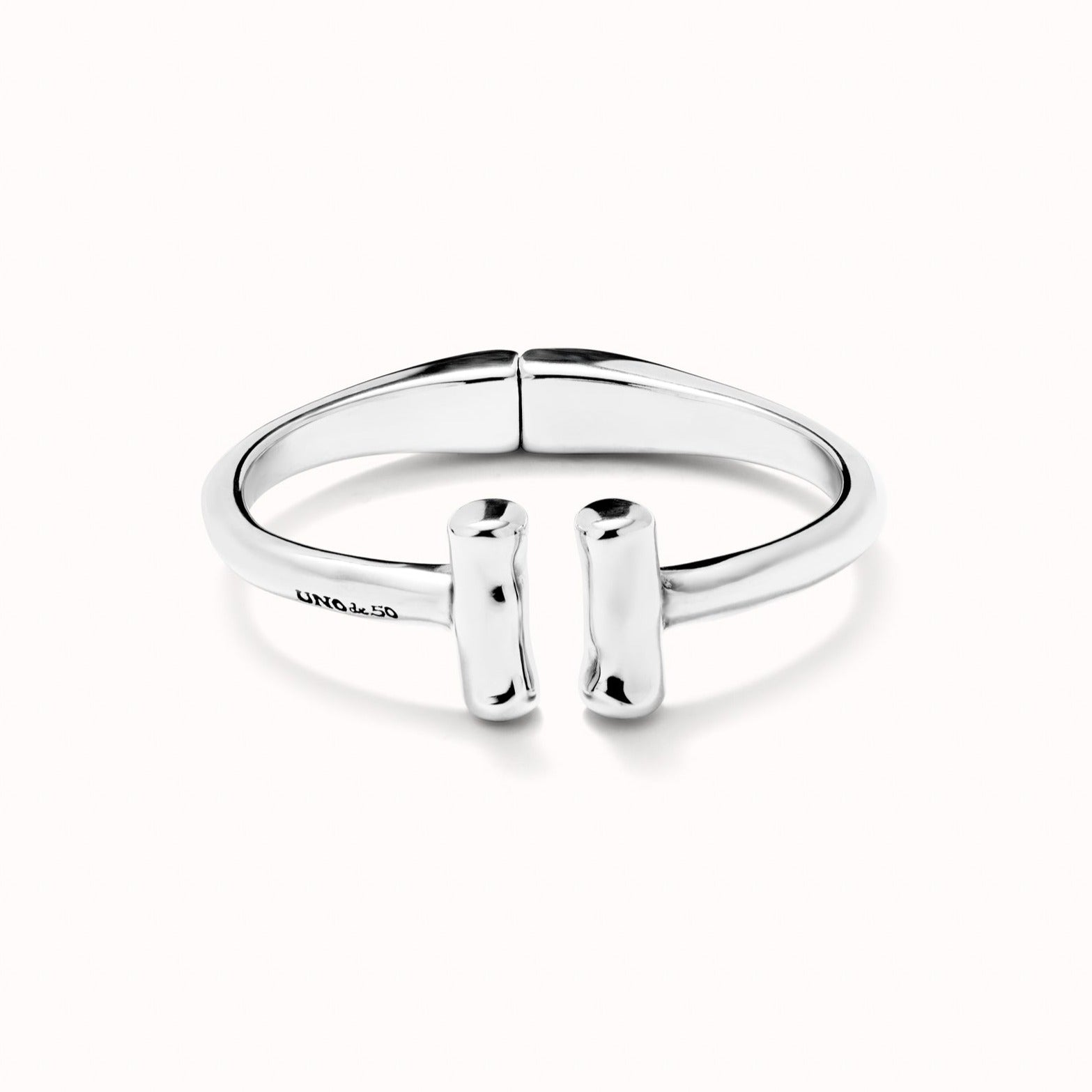 Open rigid sterling silver-plated bracelet with two tubes at the ends. Made in Spain with a 100% handmade process.Genderless jewelry collection that combines leather with tube-shaped, silver-plated and organic finish pieces. Discover the collection ser natural.