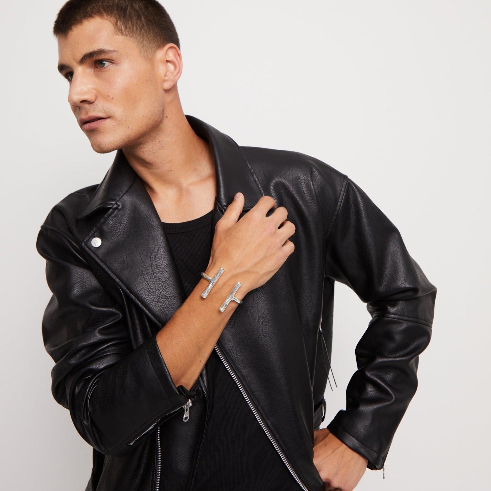 Open rigid sterling silver-plated bracelet with two long tubes at the ends. Made in Spain with a 100% handmade process.Genderless jewelry collection that combines leather with tube-shaped, silver-plated and organic finish pieces. Discover the collection ser natural.