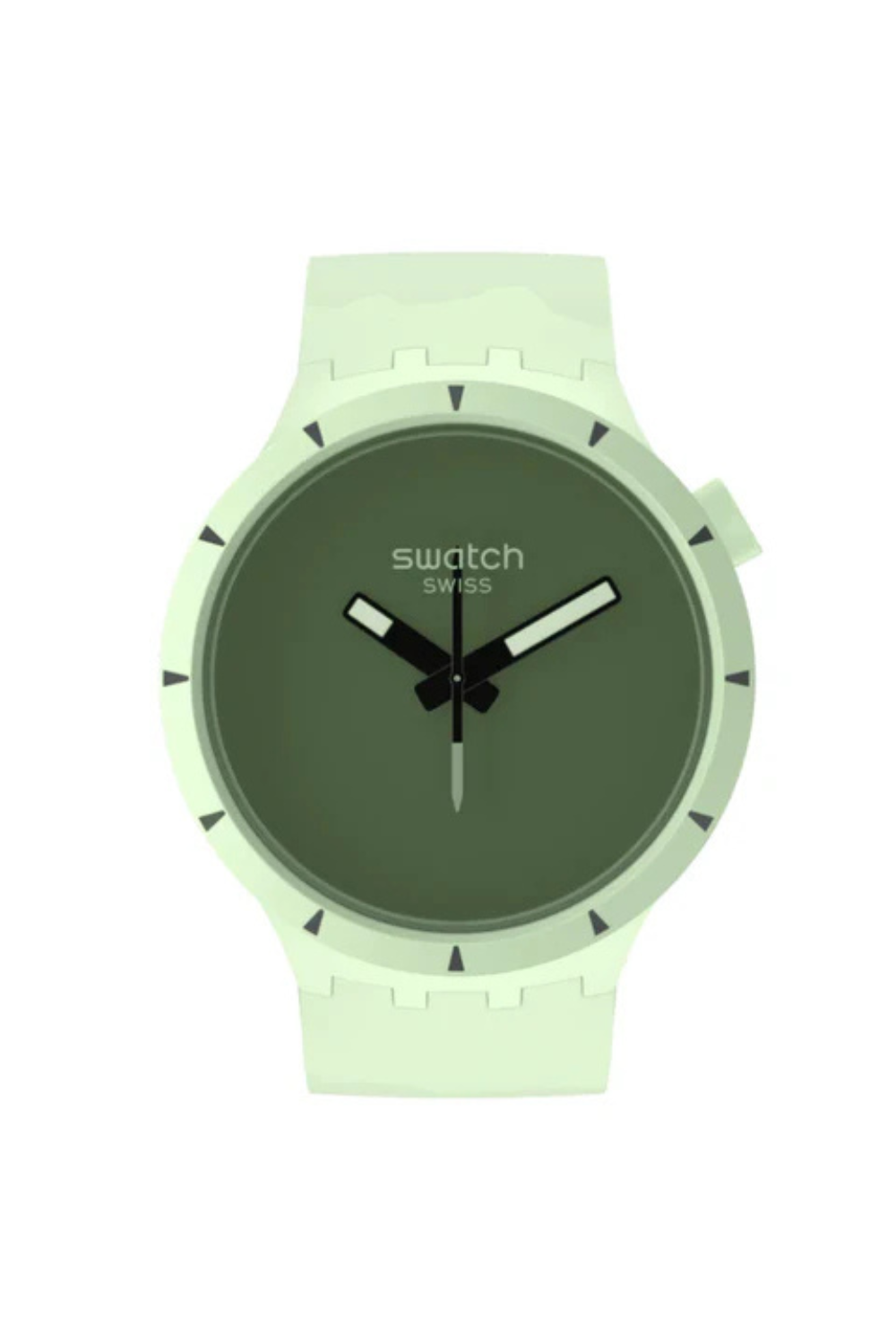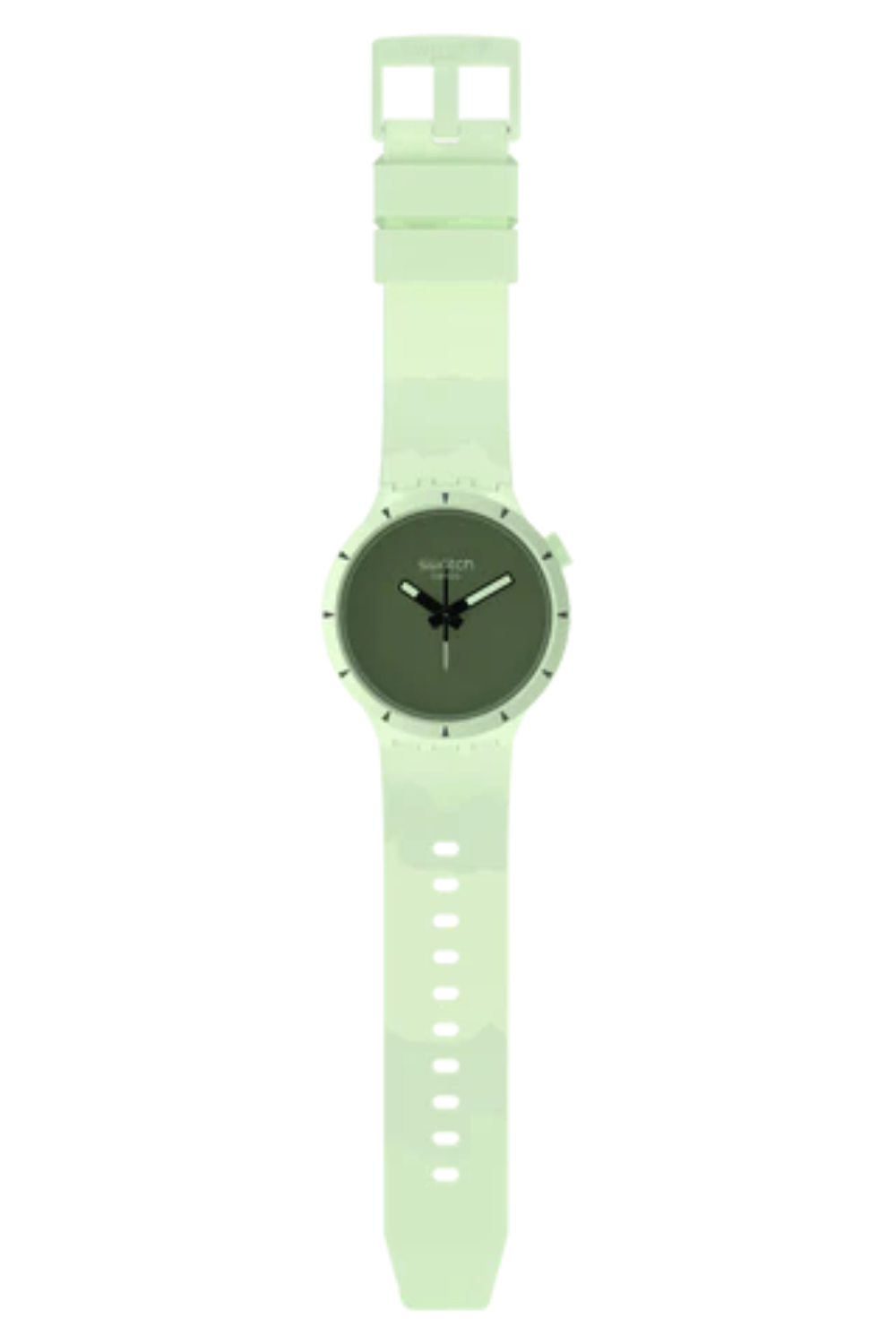 This BIG BOLD BIOCERAMIC oversized watch features a solid matte green silicone strap with light green print and solid matte green BIOCERAMIC case and bezel. The solid dark green dial accentuates the white superlight feature on the black hands. Inspired by a compass needle, the second hand amplifies the sense of adventure.