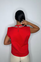 Embellished muscle tee top in stretch knit fabric. This style features a round ribbed neck with crystal embellishment and a relaxed fit.