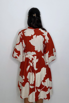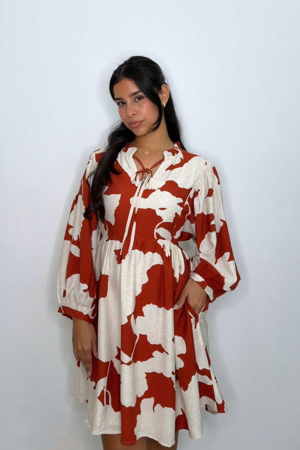 This flowy, mini babydoll dress features a bold abstract print in warm rust and cream tones, bringing a modern, artistic touch to your look.