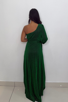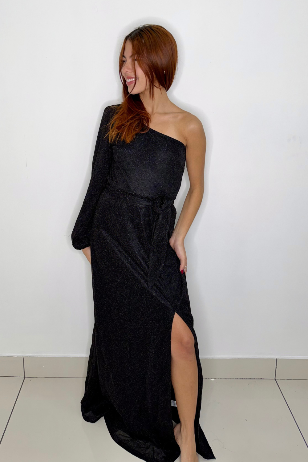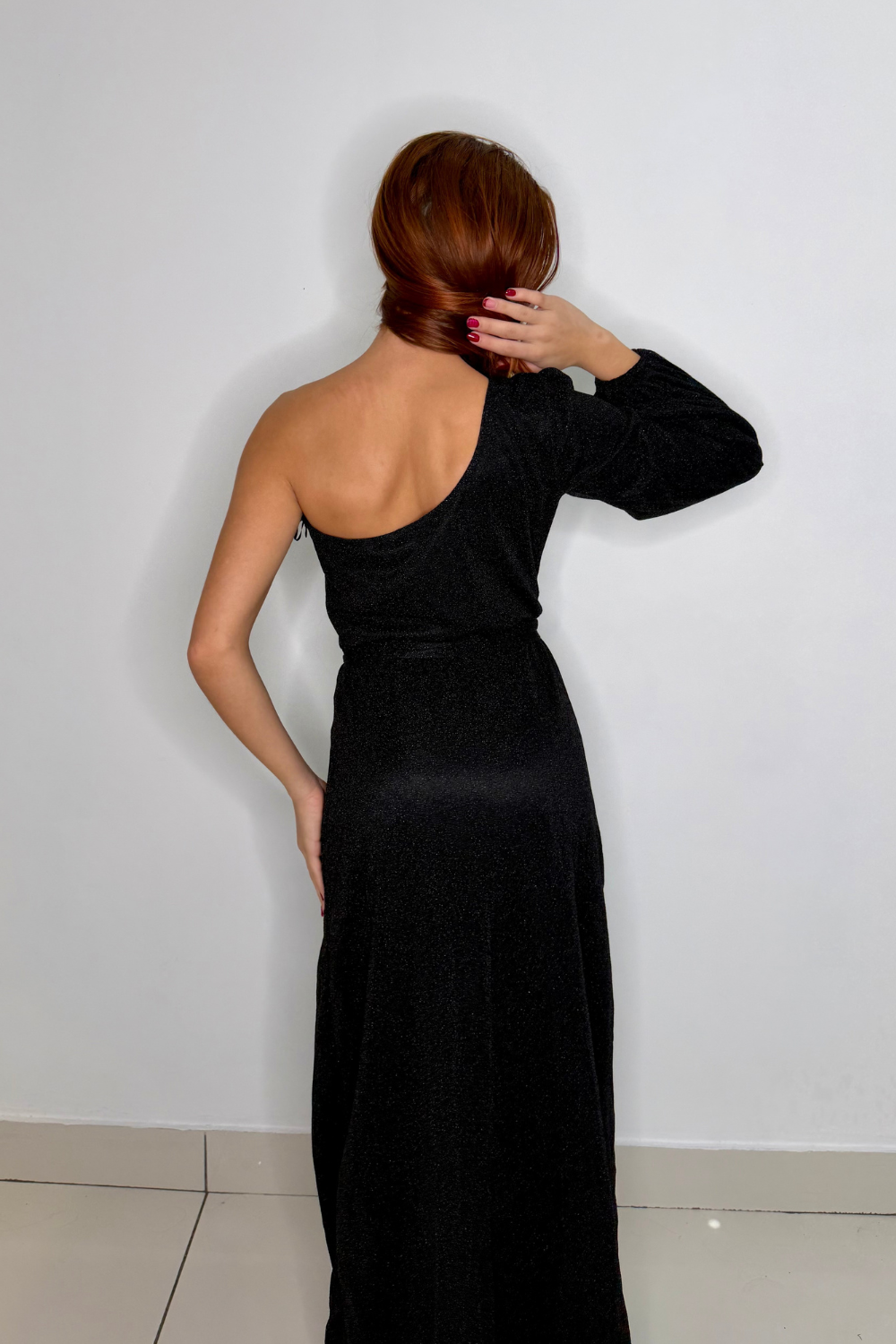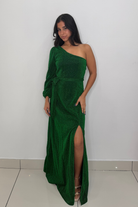 This stunning gown is designed to make a statement. Featuring a chic one-shoulder neckline and a single long sleeve with subtle volume at the cuff, it blends sophistication with modern style. The shimmering fabric adds a glamorous touch, perfect for evening events or special occasions. A matching waist tie accentuates the silhouette, while the thigh-high slit offers a feminine and alluring finish. Ideal for formal celebrations, holiday parties, or any night you want to stand out with elegance.