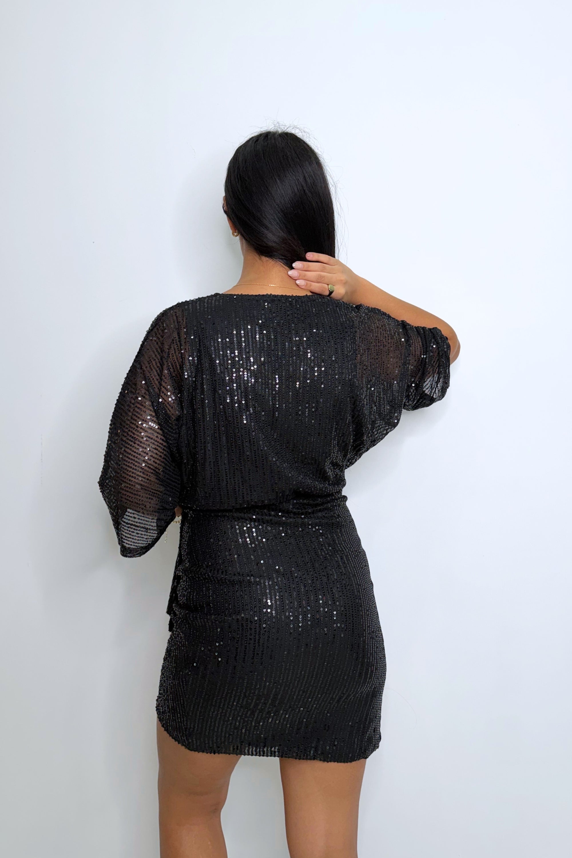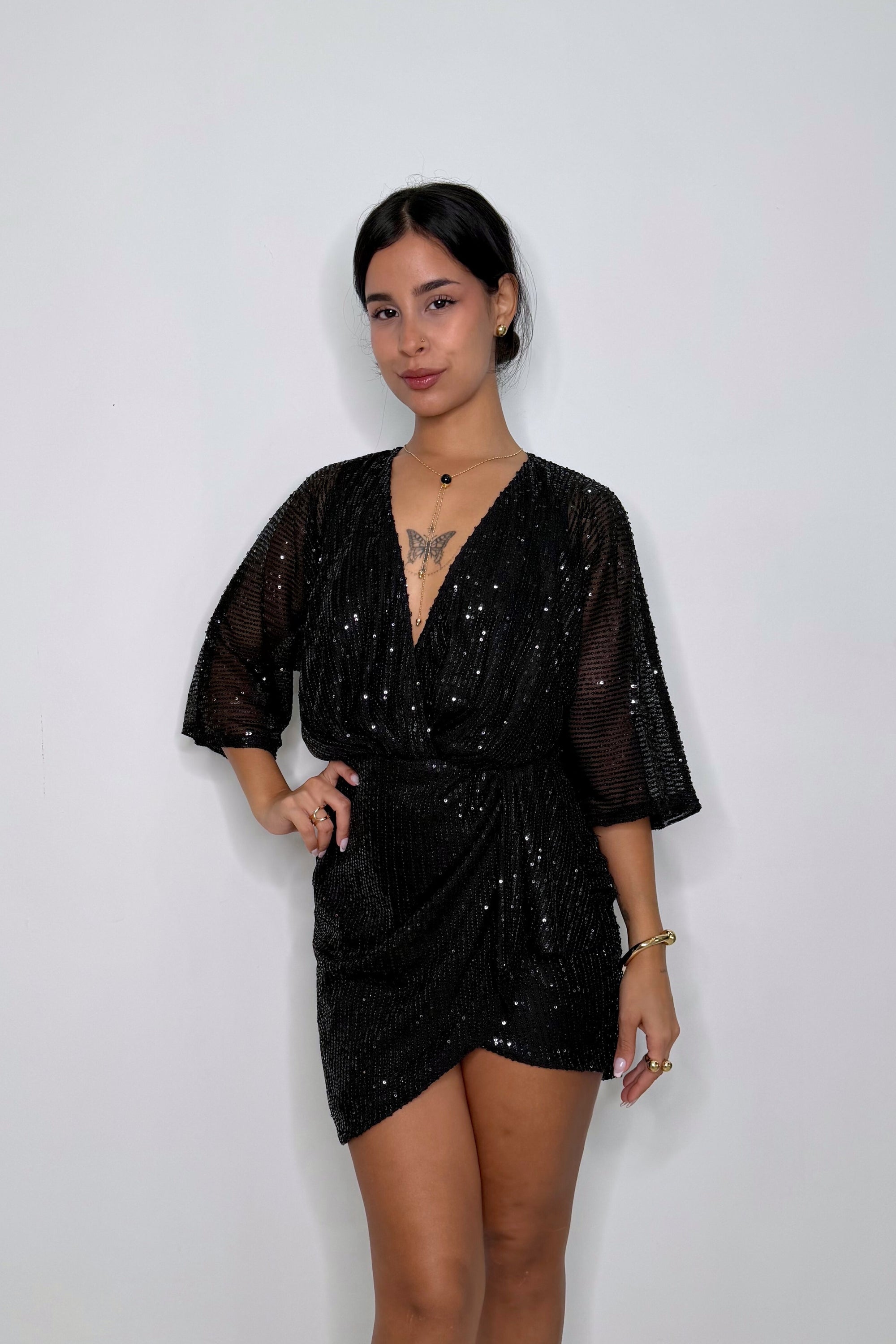 This elegant black mini dress features a modern, chic design with a subtle yet eye-catching shine. Made with fine sequin detailing, it offers a glamorous look without being over the top. The dress includes a deep V wrapped neckline, three-quarter mesh sleeves with shimmering accents, and a front draped waist that enhances the silhouette. The skirt has a slightly asymmetric wrap-style hem, adding movement and sophistication.