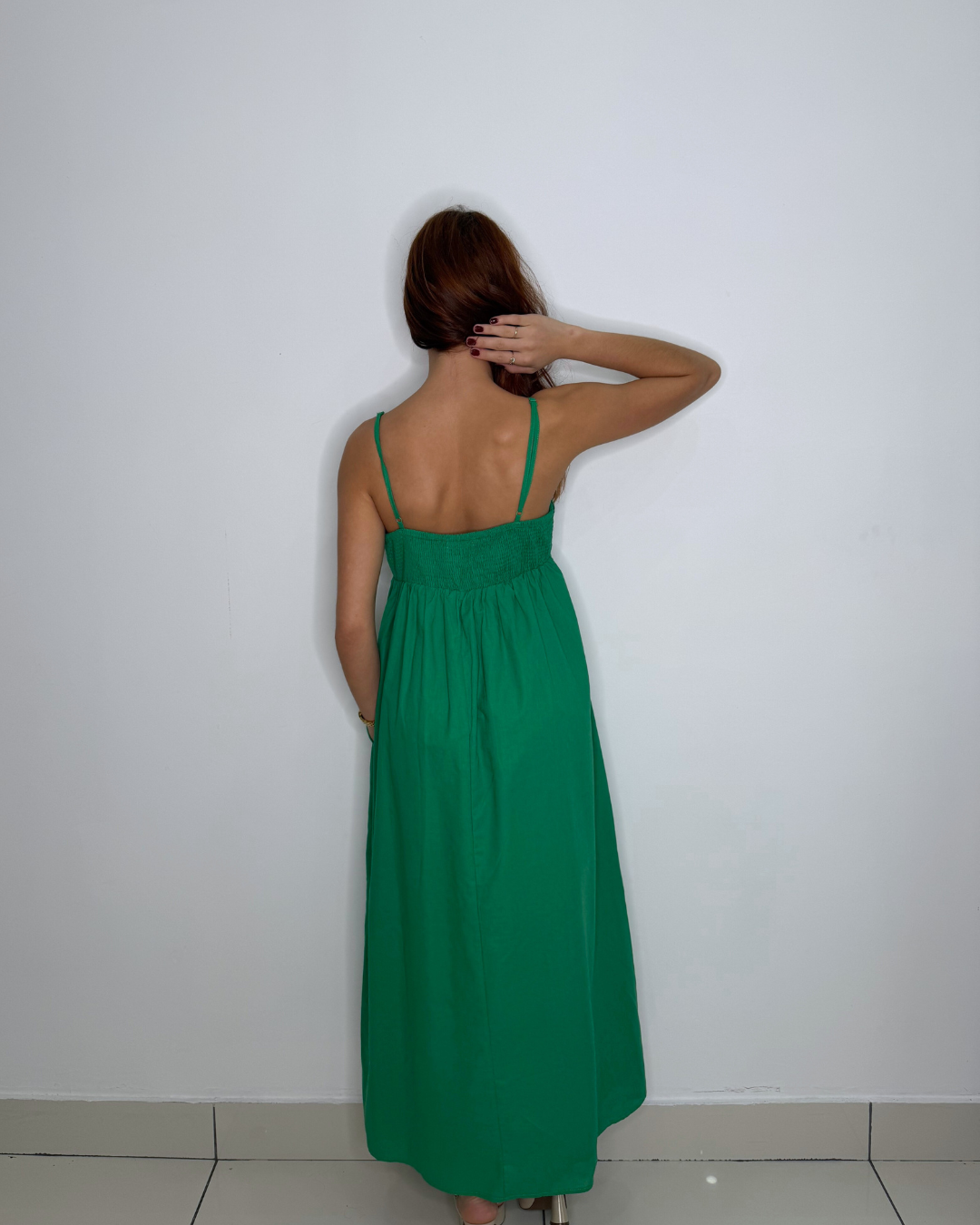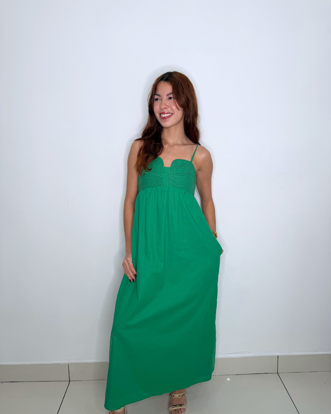Matelasse top stitched embroidery midi dress in linen cotton blend fabric. This empire long dress features a quilted top-stitch detail bustier, side pockets, sweetheart neckline, adjustable straps, smocking elastic at back bodice, hidden zipper closure, midi skirt, and lining.