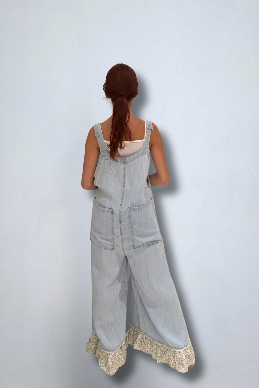 Wide overalls crafted in printed woven fabric, featuring lace ruffles, handmade patch details, front pockets, adjustable straps, and raw edges. Finished with vintage washing in a charming floral pattern, these overalls offer a playful, feminine, and effortlessly stylish look.