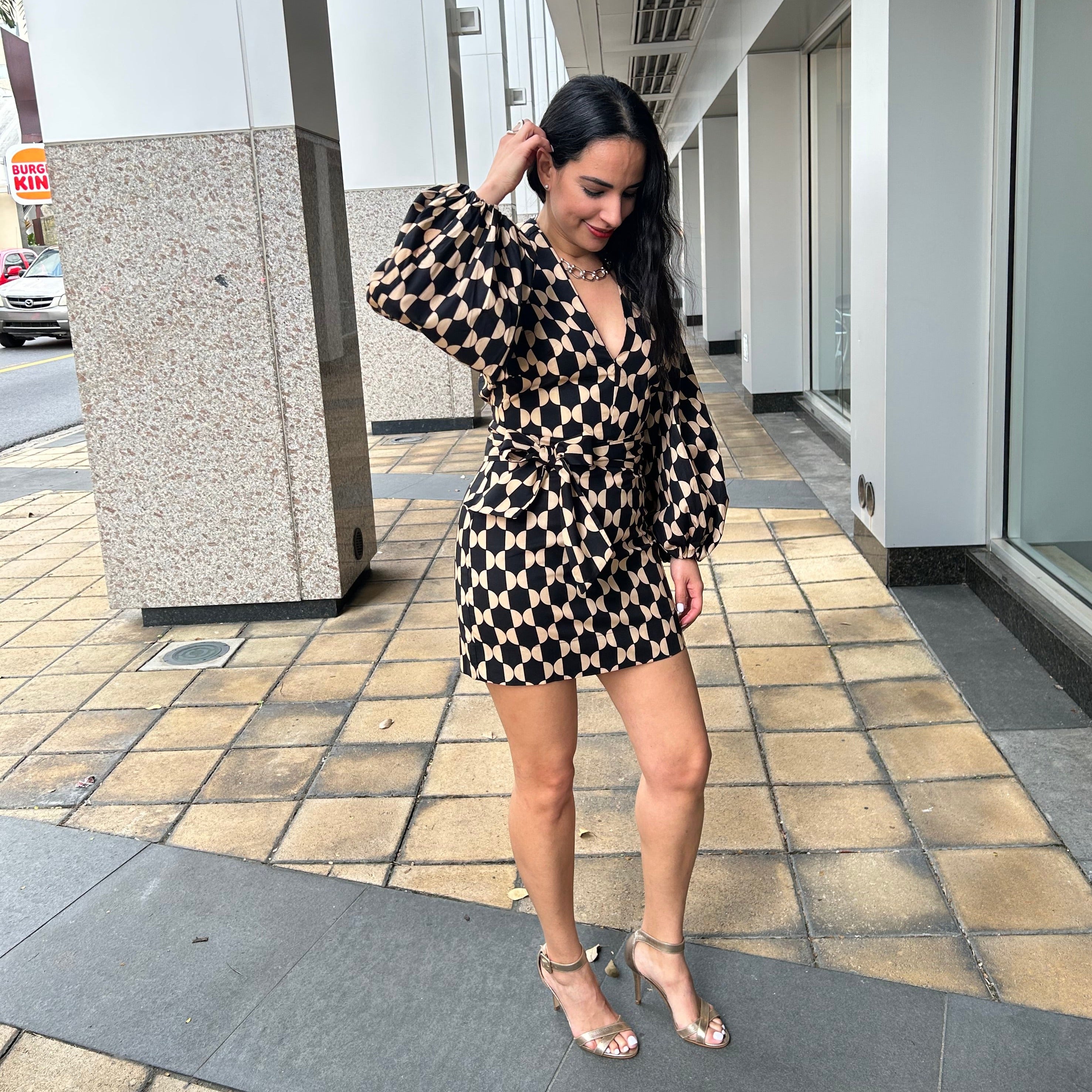 For antennae and stylish women. Our dress has a V-neck, puffy sleeve, tie at the waist, cutout on the back and short length