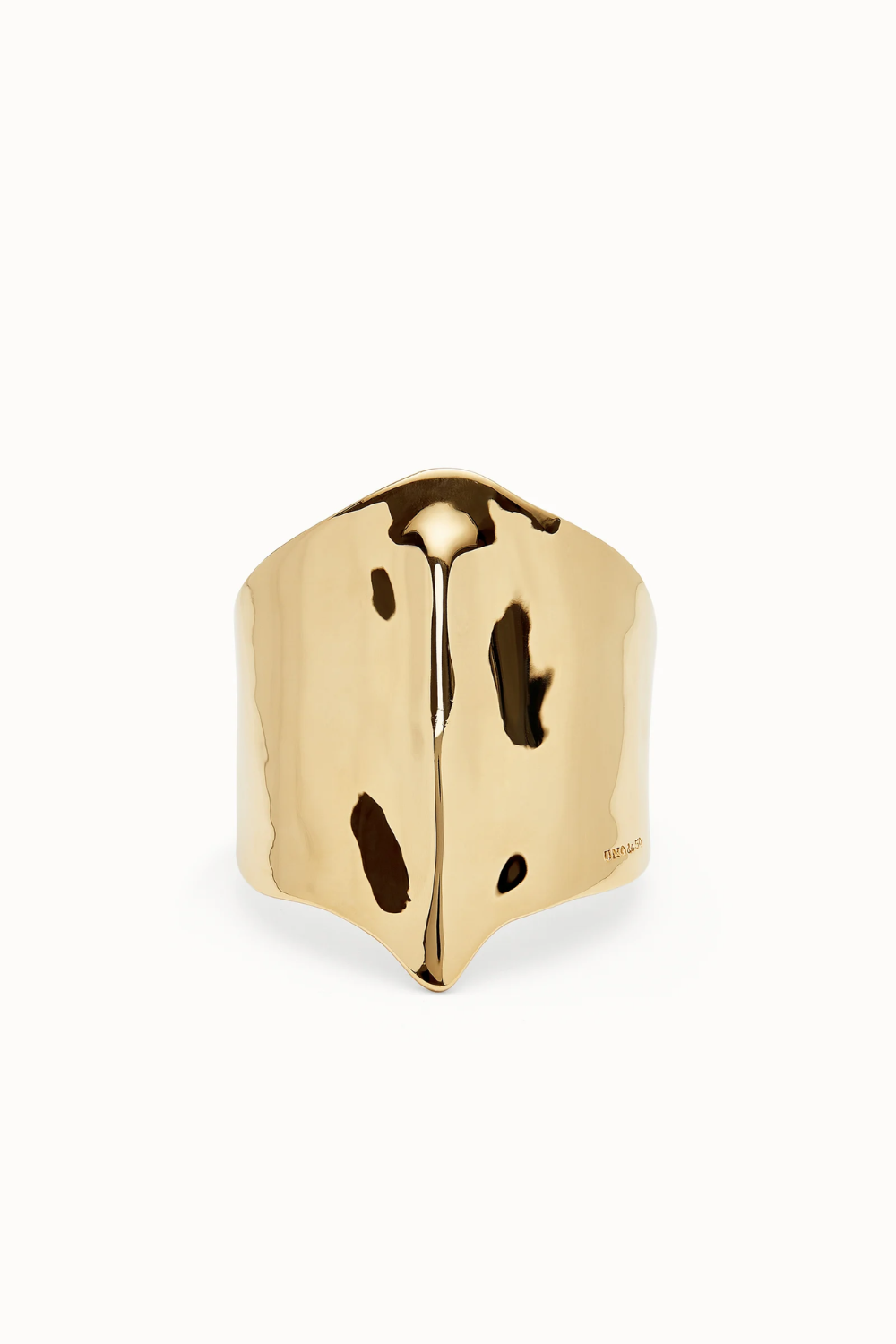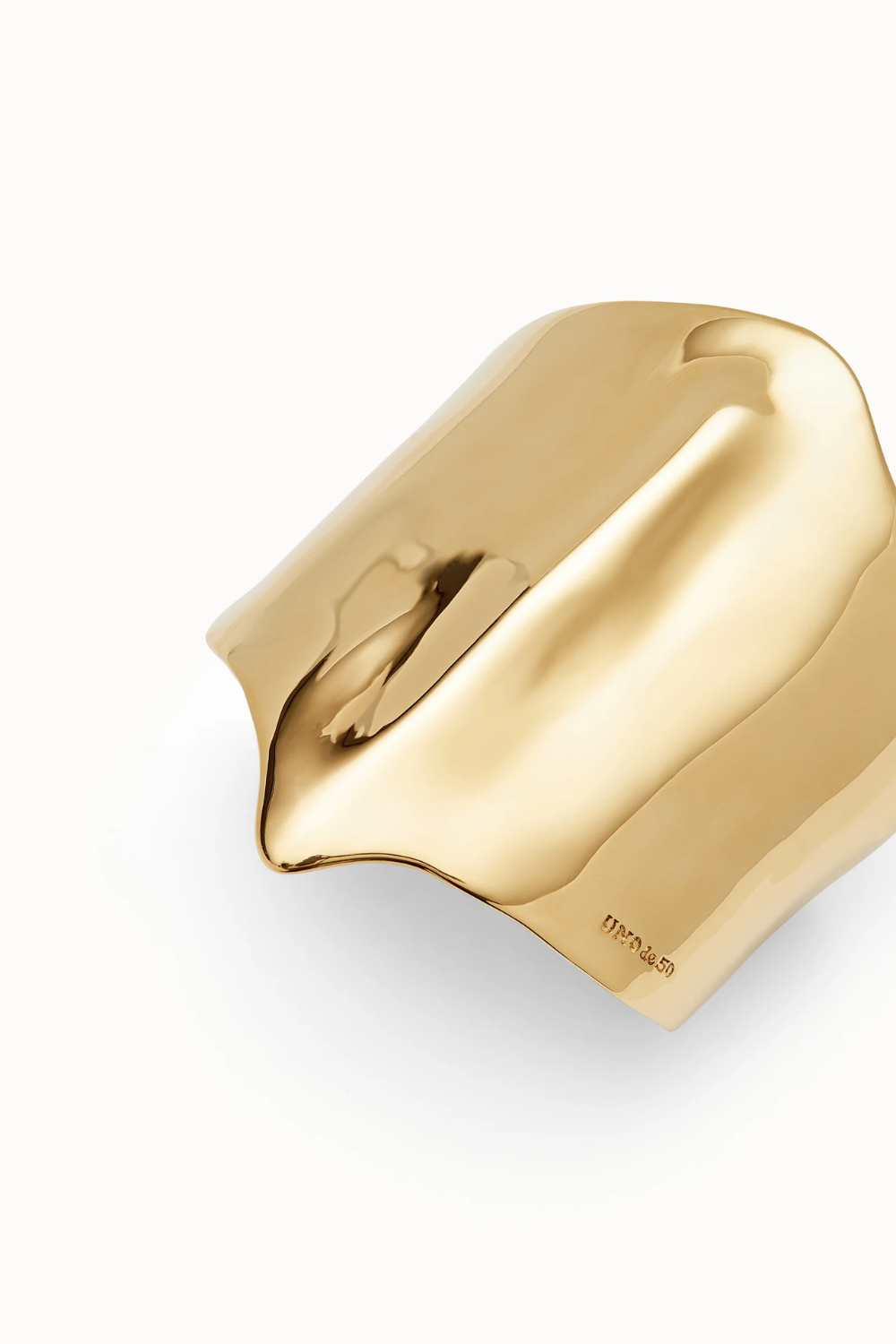 Wide 18K gold-plated bracelet with manta ray structure. Discover the elegance of Ser Majestuosa, a collection that evokes the dance of the manta ray across the sea and a tribute to Puerto Rico island and its people.