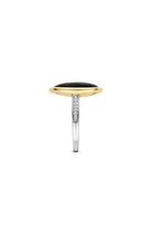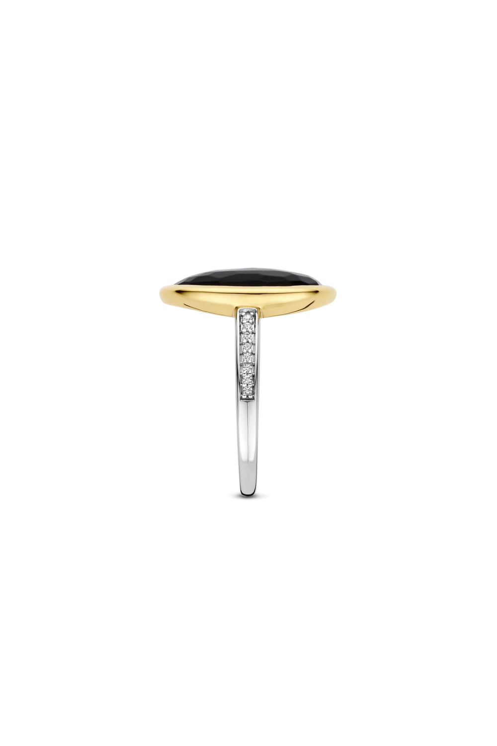 Discover midnight allure with this TI SENTO gold-plated silver Ring 12386BY. Crafted from 925 sterling silver and sealed with a mirror-bright platinum finish, the slender band leads the eye to an organically shaped jet-black stone whose faceted “pebble” surface flickers with subtle flashes of light. A smooth yellow-gold rim frames the gemstone, while a tapering row of pavé-set white cubic zirconia along one shoulder adds refined sparkle without stealing the spotlight. Wear it solo for bold contrast, or stack it with slender metallic rings to build a curated glow. Nickel-free and hypoallergenic, this piece stays skin-friendly all day long.