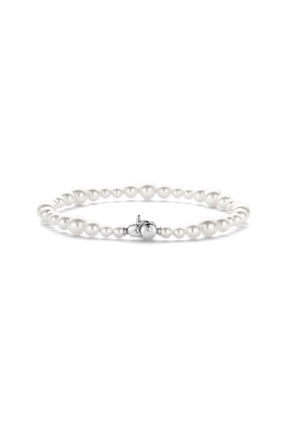 This TI SENTO Silver Pearl Bracelet 23074PW is a modern ode to classic elegance, reimagined with a playful, contemporary rhythm. Expertly crafted from 925 sterling silver and plated with luminous platinum for lasting brilliance, this bracelet is strung with a captivating sequence of lustrous white pearls. What sets this design apart is the way the pearls flow in different sizes—starting with small, delicate pearls, gradually growing into larger, eye-catching ones, and then gently returning to their smaller, dainty size again.This undulating pattern creates a dynamic, flowing silhouette that feels both timeless and refreshingly modern. Finished with the signature TI SENTO clasp, this piece is a celebration of balance and movement—perfect for elevating daytime looks or adding subtle glamour to evening wear. Nickel-free and hypoallergenic, it offers enduring comfort and effortless sophistication. A true statement of grace, this bracelet lets the timeless beauty of pearls dance elegantly around your wrist.