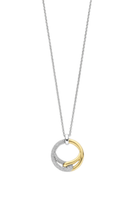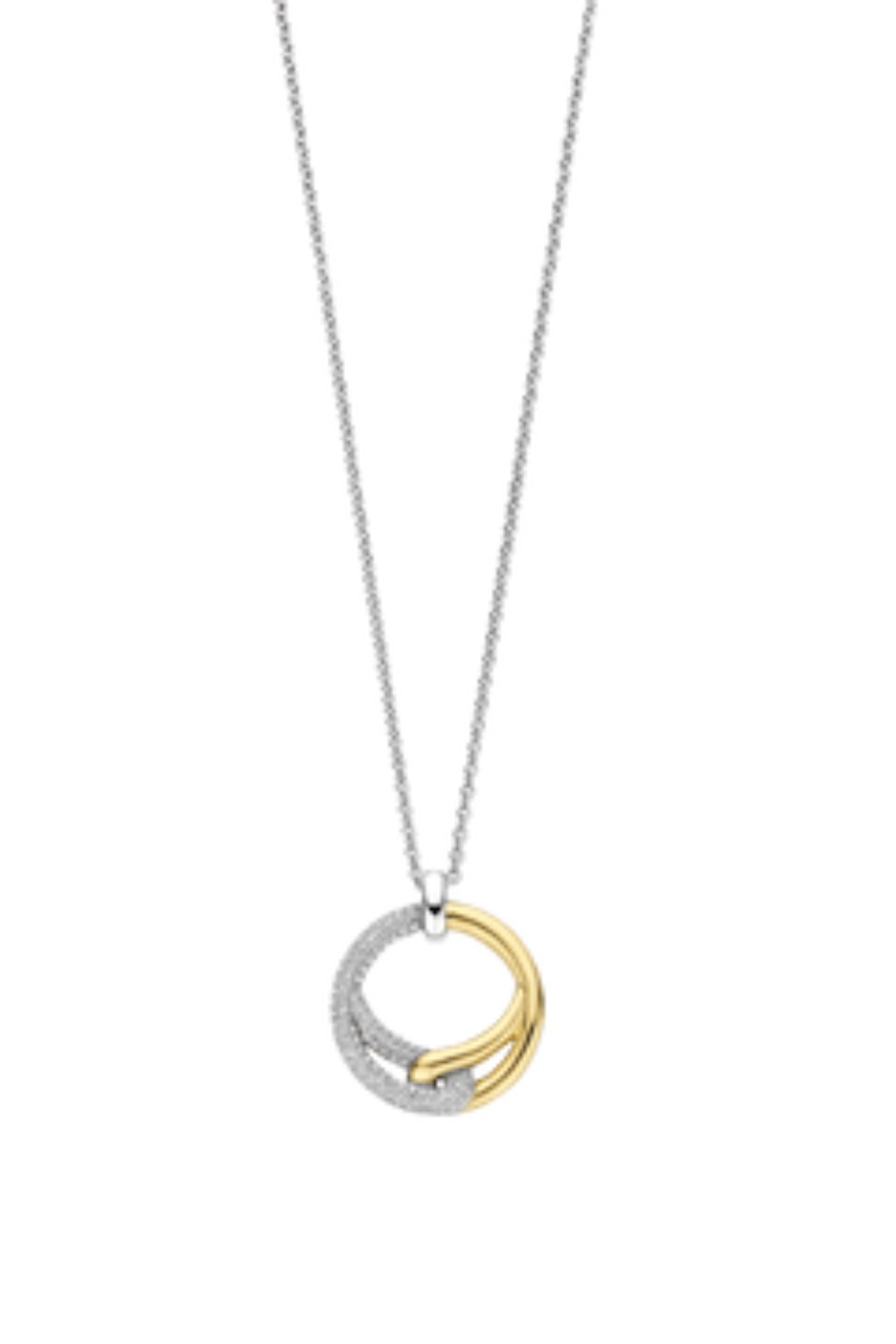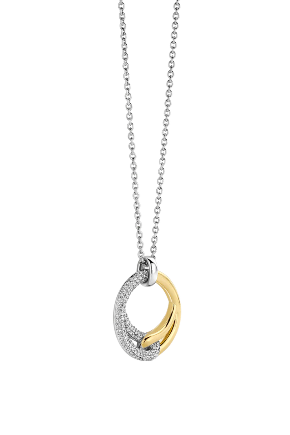 Elevate every look with this TI SENTO gold-plated silver Necklace 34107ZY. The pendant’s graceful circular design is crafted from premium 925 sterling silver and enriched with a radiant layer of yellow gold. Three flowing ribbons—two of pavé-set white cubic zirconia and one polished gold—intertwine to form an elegant loop, symbolising harmony and infinite beauty. At 24mm in diameter, the pendant makes a refined yet eye-catching statement, suspended from a delicate silver chain that sits comfortably along the neckline. The brilliant pavé setting captures and reflects light from every angle, adding luminous sparkle to both casual and occasion wear. This luxury necklace combines classic round shapes with contemporary fluid lines, making it a perfect jewellery gift for her or an elegant addition to your own jewellery collection. Style it solo for a modern statement or layer it with minimalist chains for a curated mix. Nickel-free and hypoallergenic, it’s designed for all-day comfort and enduring wear.