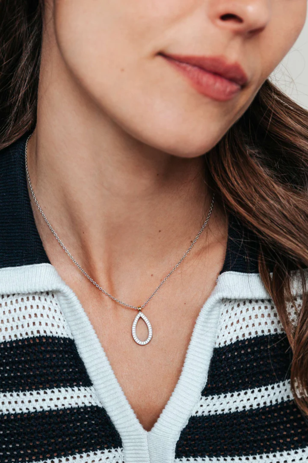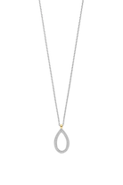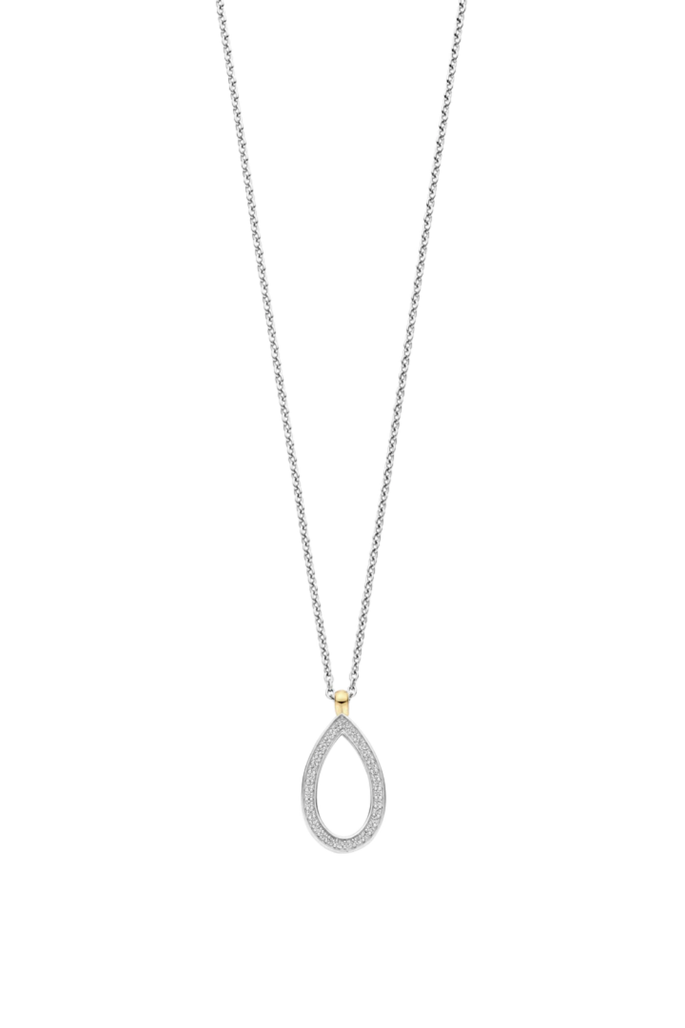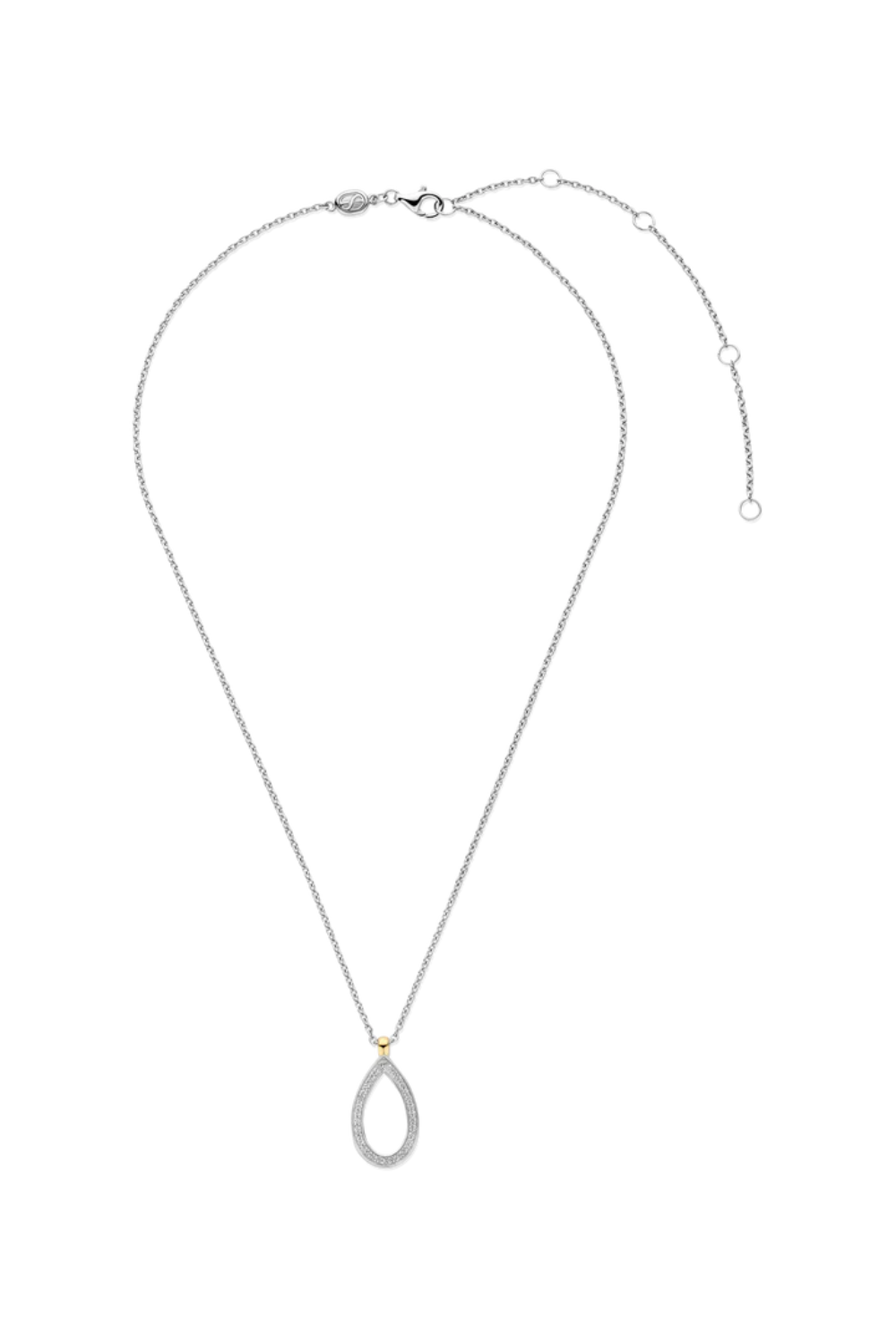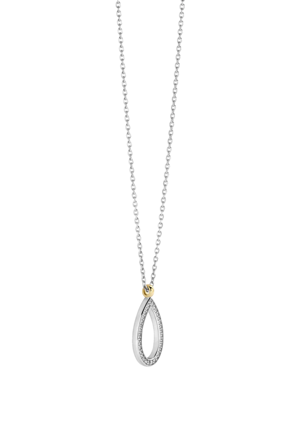 Celebrate refined simplicity with this TI SENTO gold-plated silver Necklace 34110ZY. A sleek teardrop silhouette, outlined in a halo of hand-set white cubic zirconia, catches the light with every movement. The warm yellow gold-plated bail adds a gentle contrast, elevating the pendant’s elegant curves. Crafted from premium 925 sterling silver and finished with platinum plating for lasting brilliance, this necklace is a sophisticated essential in any jewellery wardrobe. The open teardrop design evokes softness and flow, making it a subtle statement of grace and femininity. Perfect for layering with fine chains or wearing solo, this necklace transitions effortlessly from casual elegance to formal chic. Style it with matching earrings or stack it with other TI SENTO necklaces for a curated look. Nickel-free and hypoallergenic, it offers luxurious comfort for everyday wear.