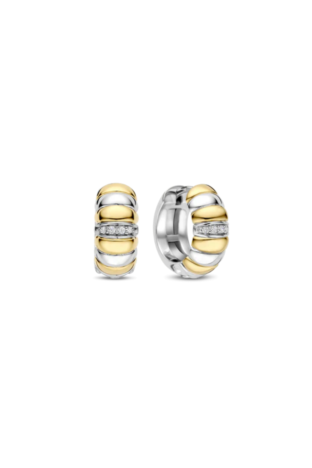Indulge in sculptural elegance with these TI SENTO gold-plated silver Earrings 78024ZY. Crafted from 925 sterling silver, each earring features a rhythmic sequence of yellow-gold plating and platinum-finished links, highlighted by a central band of pavé-set white cubic zirconia. Their refined geometry plays with light and texture, echoing the fluid motion of architectural forms. Bold yet wearable, they elevate both sleek tailoring and flowing silks with understated opulence. Pair them with the matching bracelet or ring for a cohesive, high-impact look. Nickel-free and hypoallergenic, they promise luxurious comfort day to night.