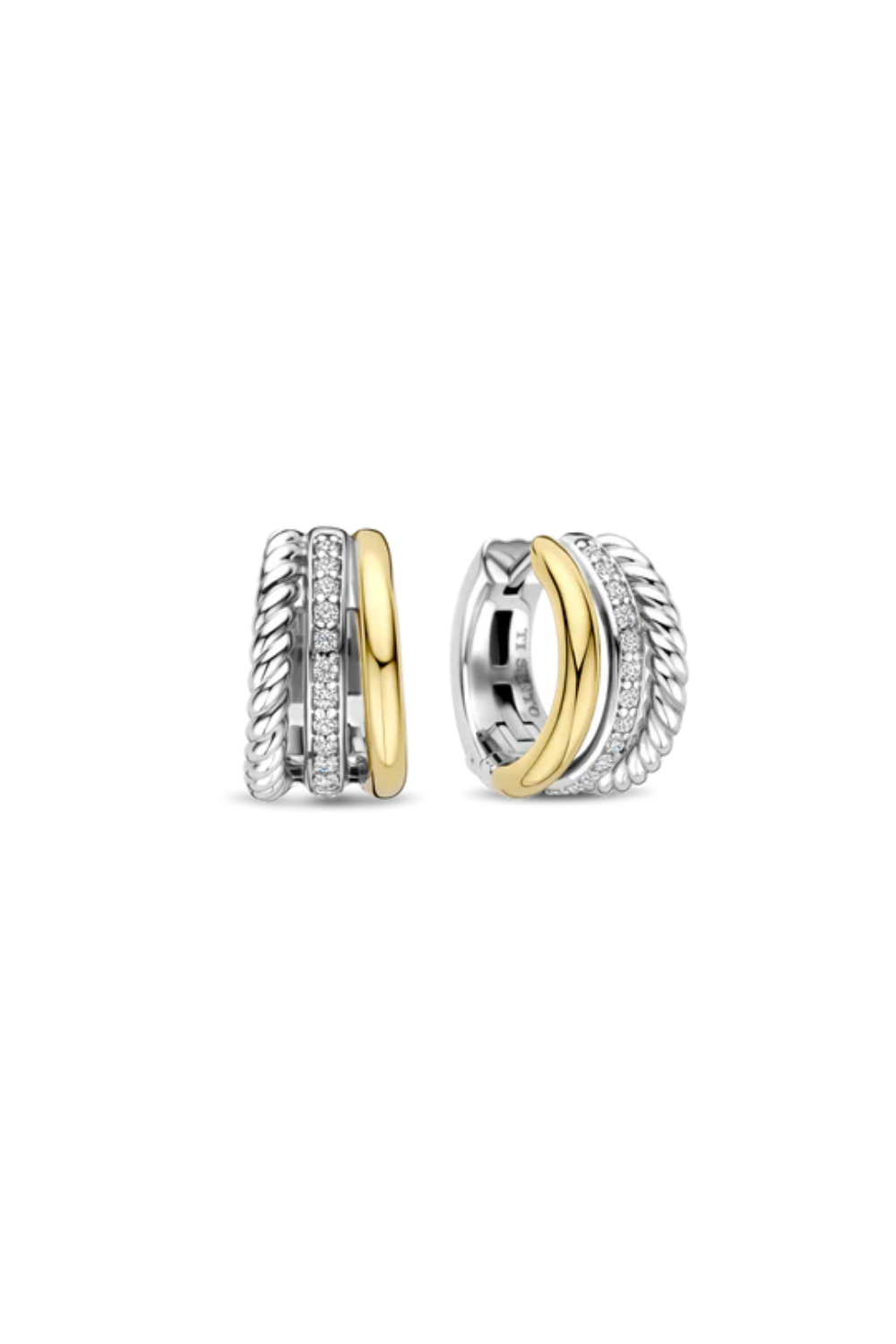 Embrace sculptural elegance with these TI SENTO gold-plated silver Earrings 78025ZY. Crafted from 925 sterling silver and finished with a radiant yellow-gold plating, their triple-band design interweaves twisted, smooth and pavé-set textures into one harmonious silhouette. This layered composition creates a bold, refined effect—rich in detail, yet effortless in feel. Whether worn with a crisp blazer or silk blouse, they lend dimensional brilliance to any look. Nickel-free and hypoallergenic, made for comfort and wearability all day long.