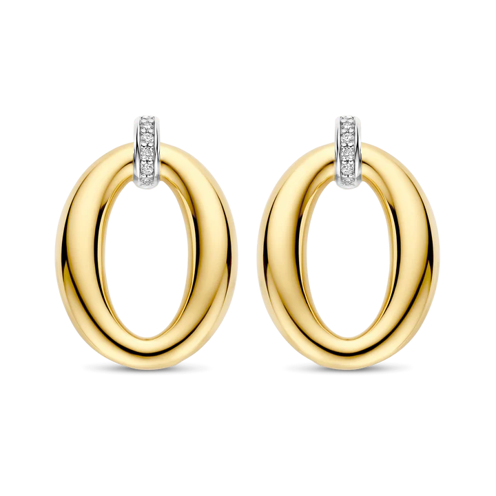 These TI SENTO Gold-Plated Silver Oval Earrings 78013ZY bring a bold, contemporary spin to effortless elegance. Crafted from premium 925 sterling silver, these earrings feature a smooth, yellow gold-plated oval link suspended from a pavé-set cubic zirconia connector, delivering just the right amount of shimmer. The mix of warm golden tones and cool platinum-plated accents creates a striking contrast, blending modern edge with timeless appeal. A statement of connection and strength, these interlocking ovals symbolise the seamless harmony between boldness and beauty. Designed to elevate everything from a power suit to an evening ensemble, these earrings add an instant touch of sophistication. Nickel-free and hypoallergenic, they promise luxurious comfort with every wear. Whether styled with a sleek ponytail or tousled waves, these versatile beauties are a refined essential for any jewellery collection.
