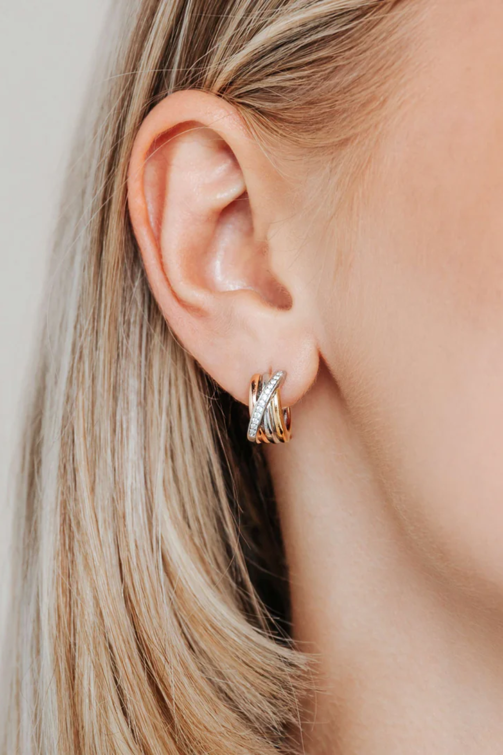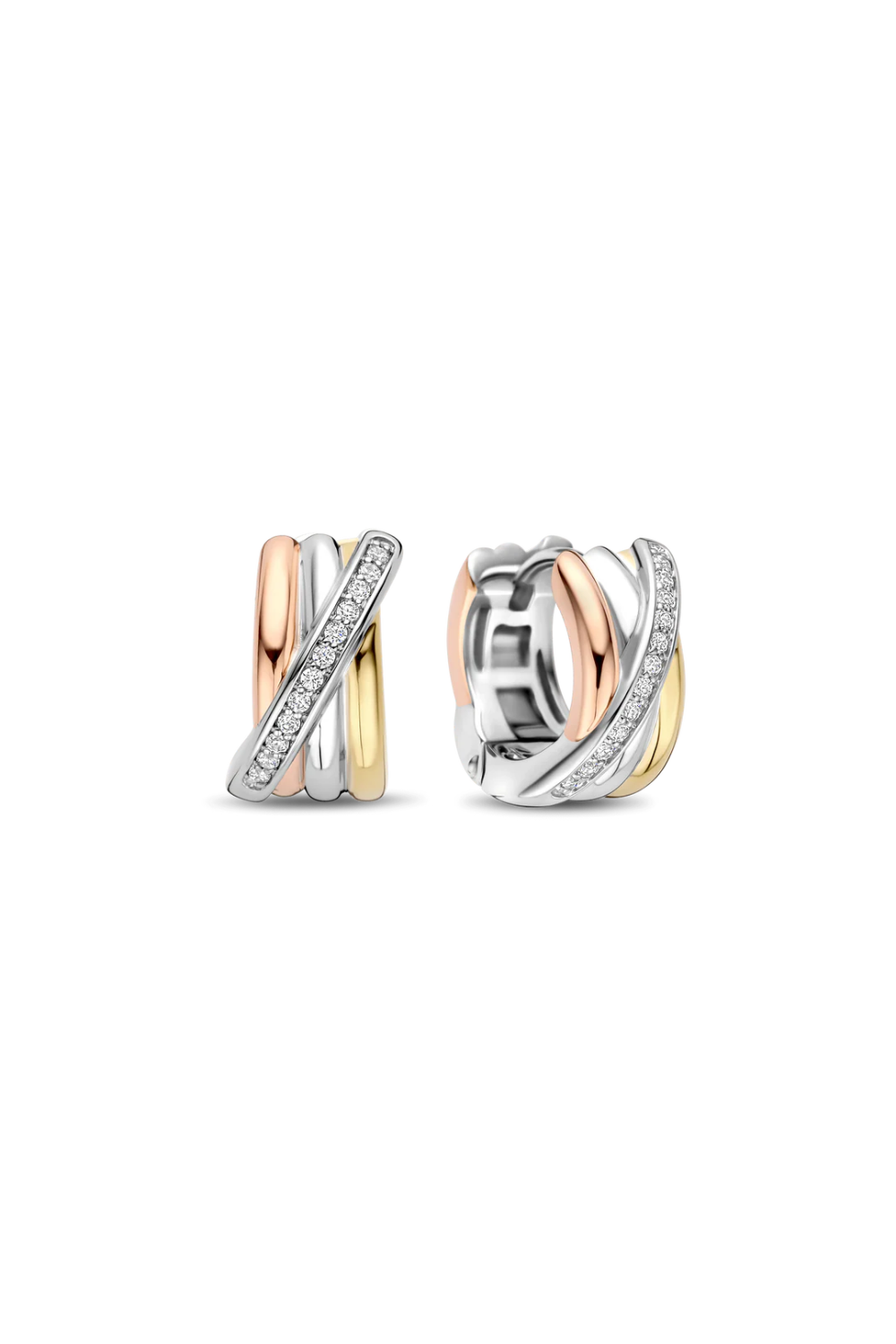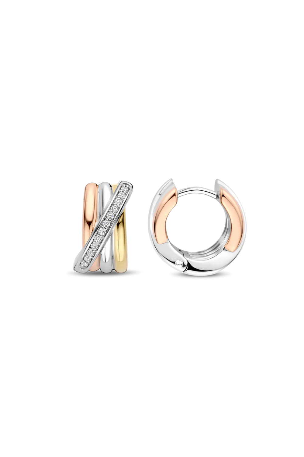 Embrace modern harmony with these TI SENTO tricolour silver Earrings 7960ZT. Crafted from 925 sterling silver, the design unites three interlocking hoops, each with its own finish: radiant yellow-gold plating, soft rose-gold plating, and cool platinum plating for enduring brilliance. A diagonal band of pavé-set white cubic zirconia slices across the trio, catching the light with every move and adding crisp sparkle to the fluid silhouette. Let the earrings stand alone for confident polish or layer them with slim huggies to curate your ear stack from day to night. Nickel-free and hypoallergenic, they promise luxurious comfort with every wear.