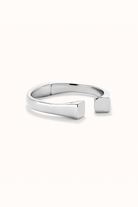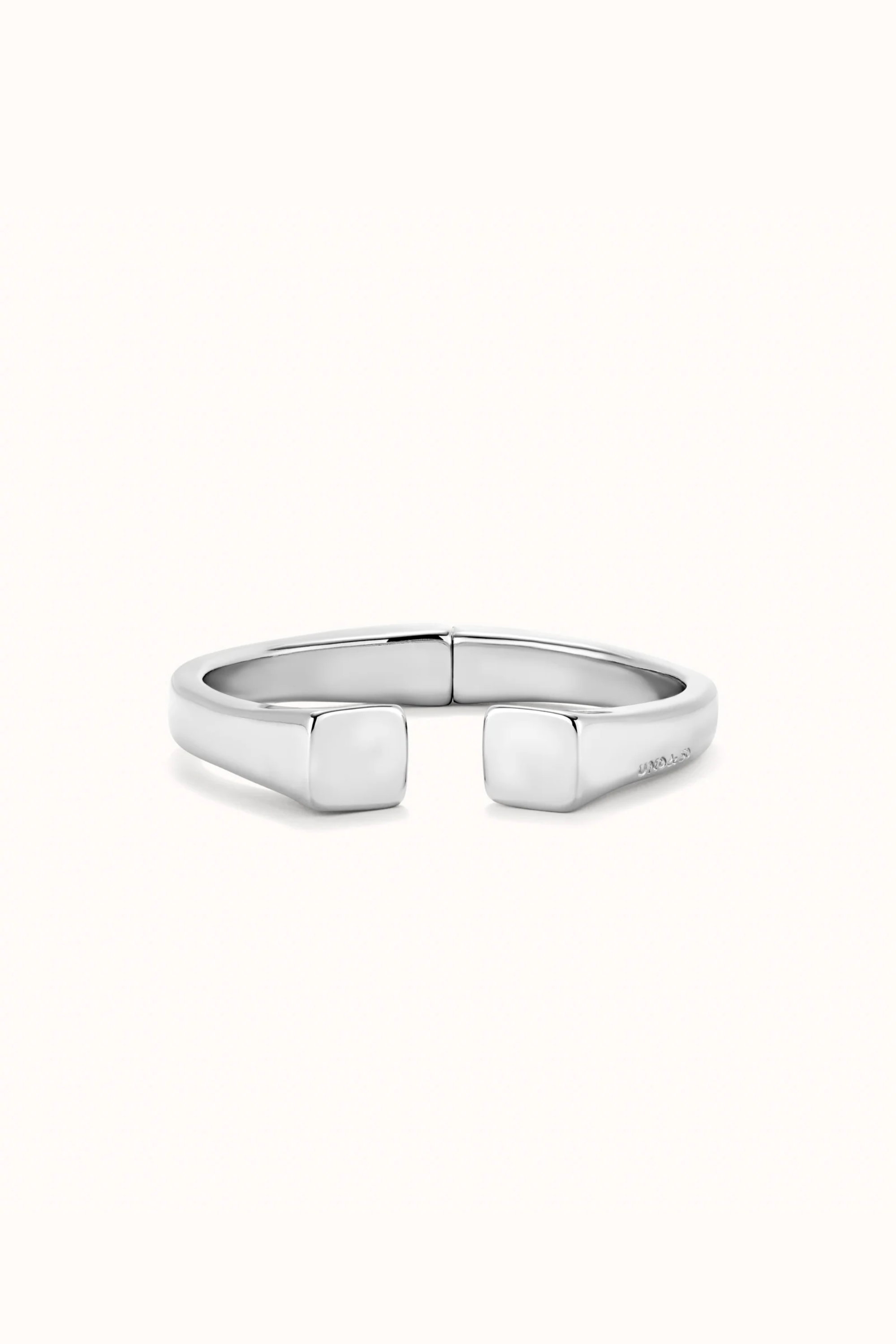Rigid sterling silver-plated inner spring bracelet. Smooth finish and square shape at the ends. Made in Spain with a 100% handmade process.Jewelry for outspoken people who want to draw attention through the geometric shapes of these pieces. A collection with a clear cubist inspiration brought to the present day. Shapes that decompose and recompose, offering endless possibilities of mix & match between silver or gold-plated and faceted black and white crystals. Discover the collection ser sin complejos.