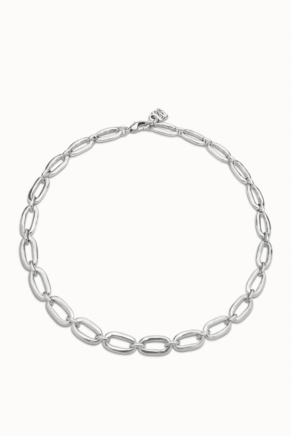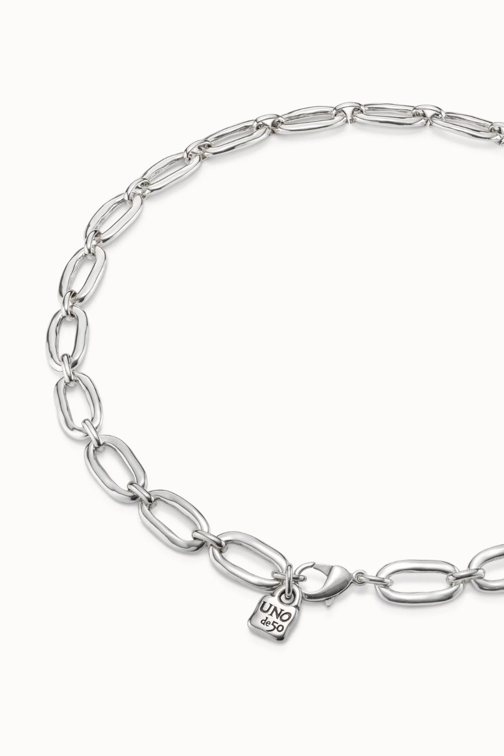 Sterling silver-plated necklace with an original link shape. Design elaborated with a long chain and a classic carabiner clasp. Made in Spain under a 100% handmade process.