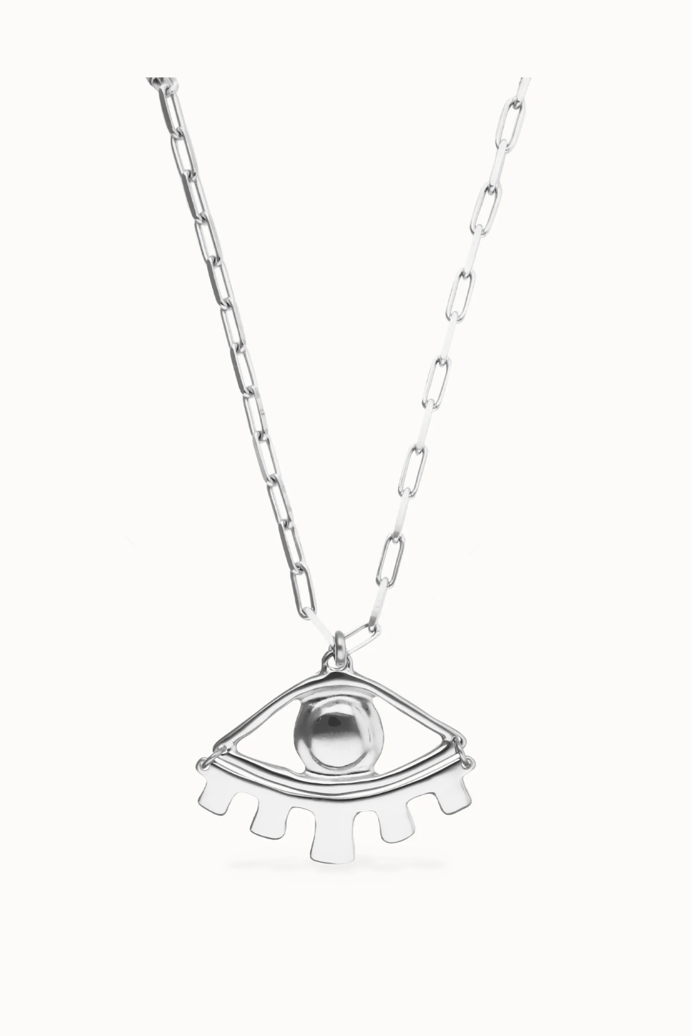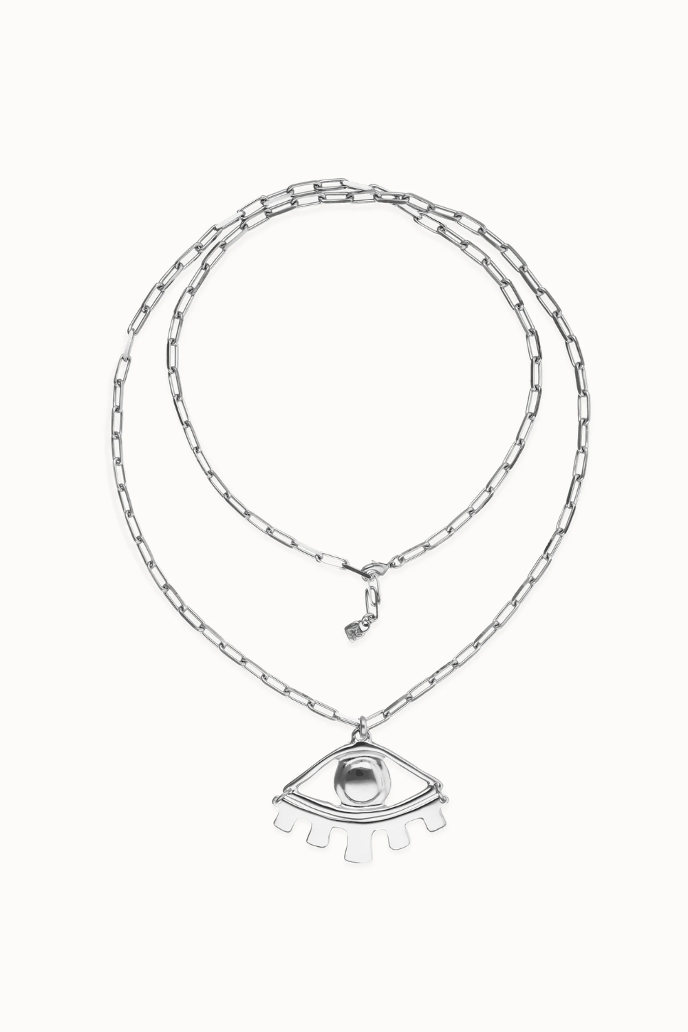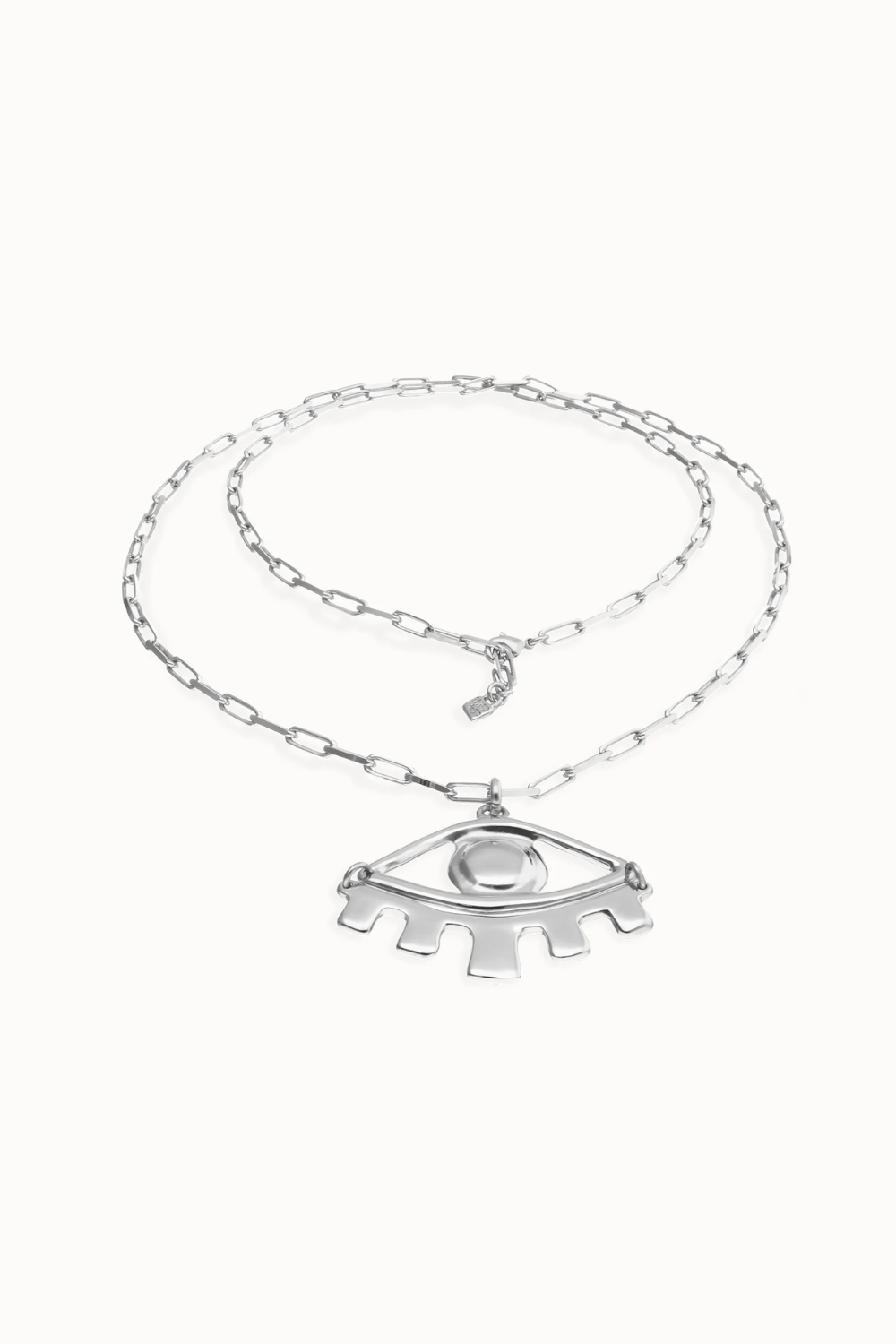 Long silver necklace with big eye. There are people who are visionary, whose intuition is their compass. Ser intuitiva takes into consideration that mystical side of us, allowing us to bring out our hidden self and show it to the world.