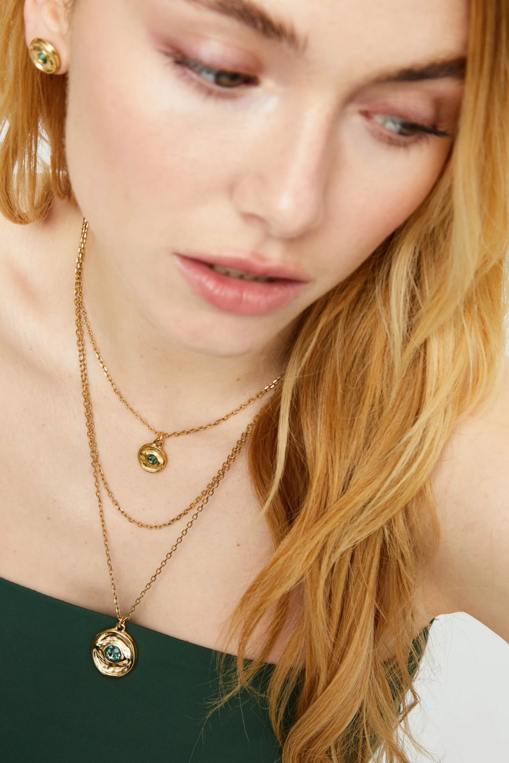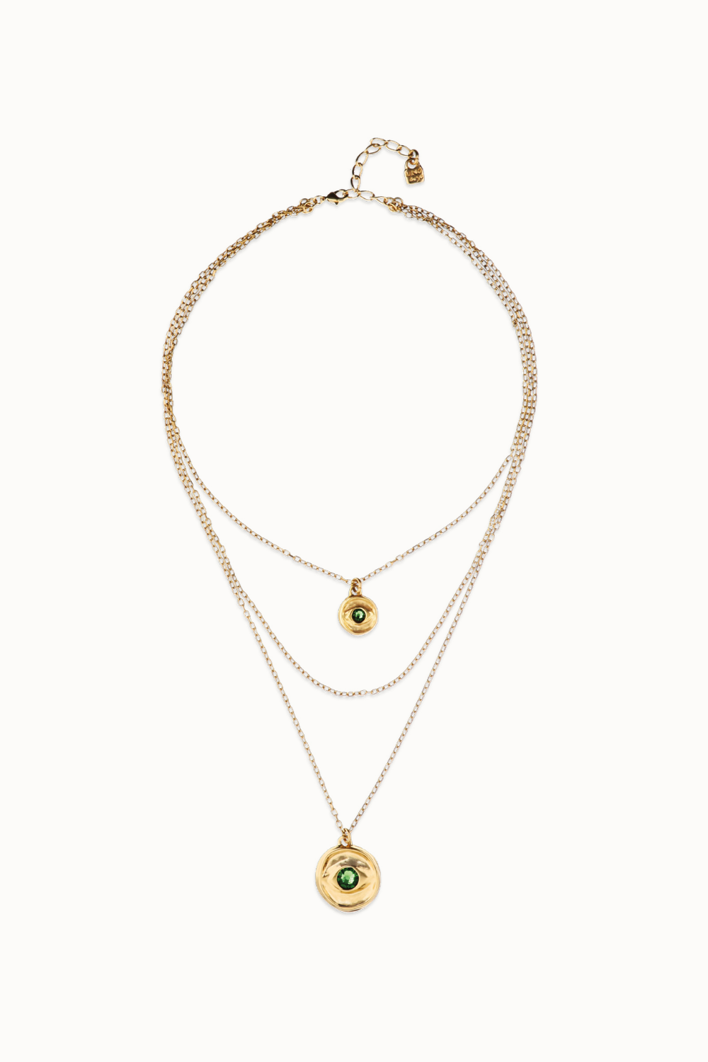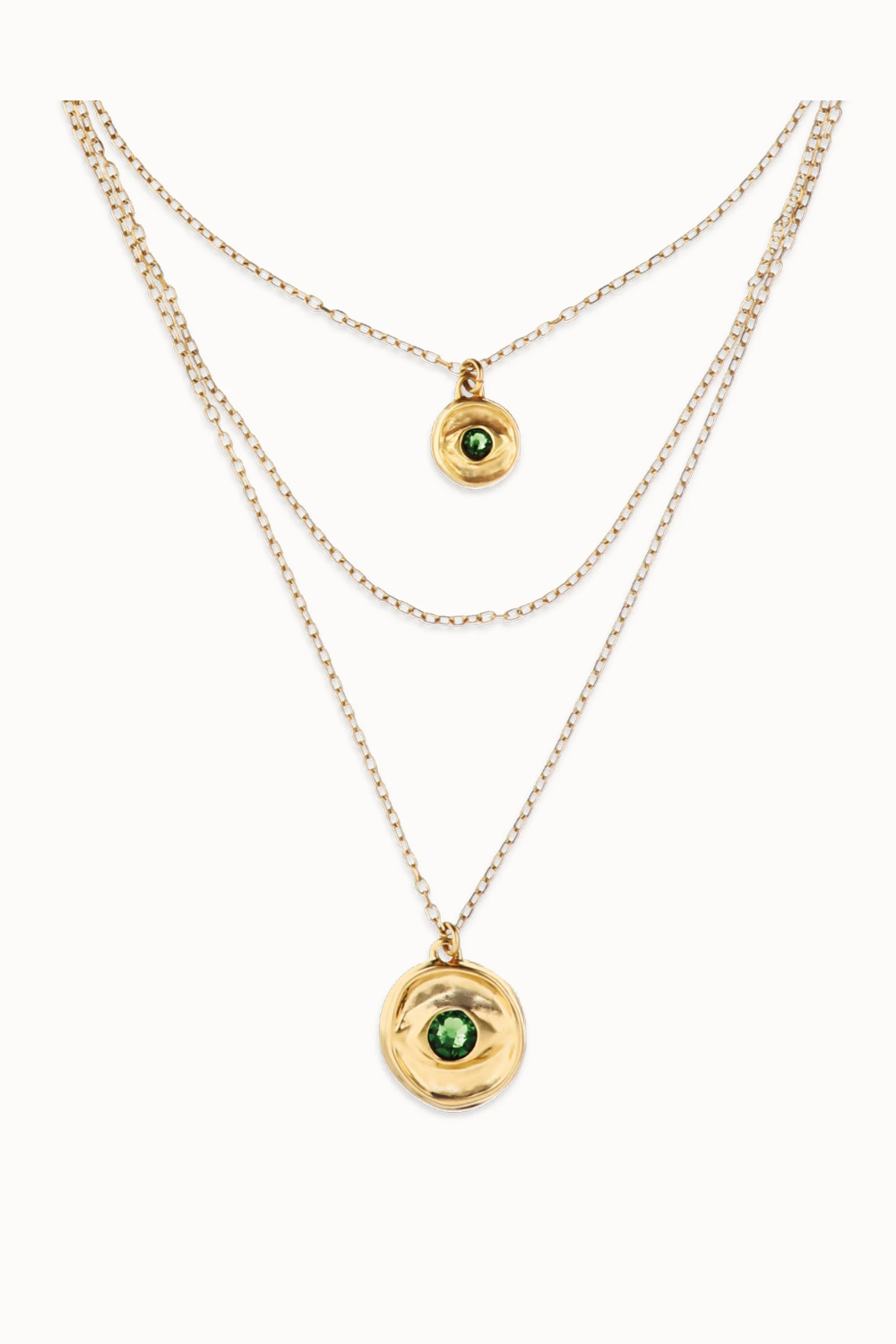 Gold triple necklace with eye charms and green faceted crystal. There are people who are visionary, whose intuition is their compass. Ser intuitiva takes into consideration that mystical side of us, allowing us to bring out our hidden self and show it to the world.