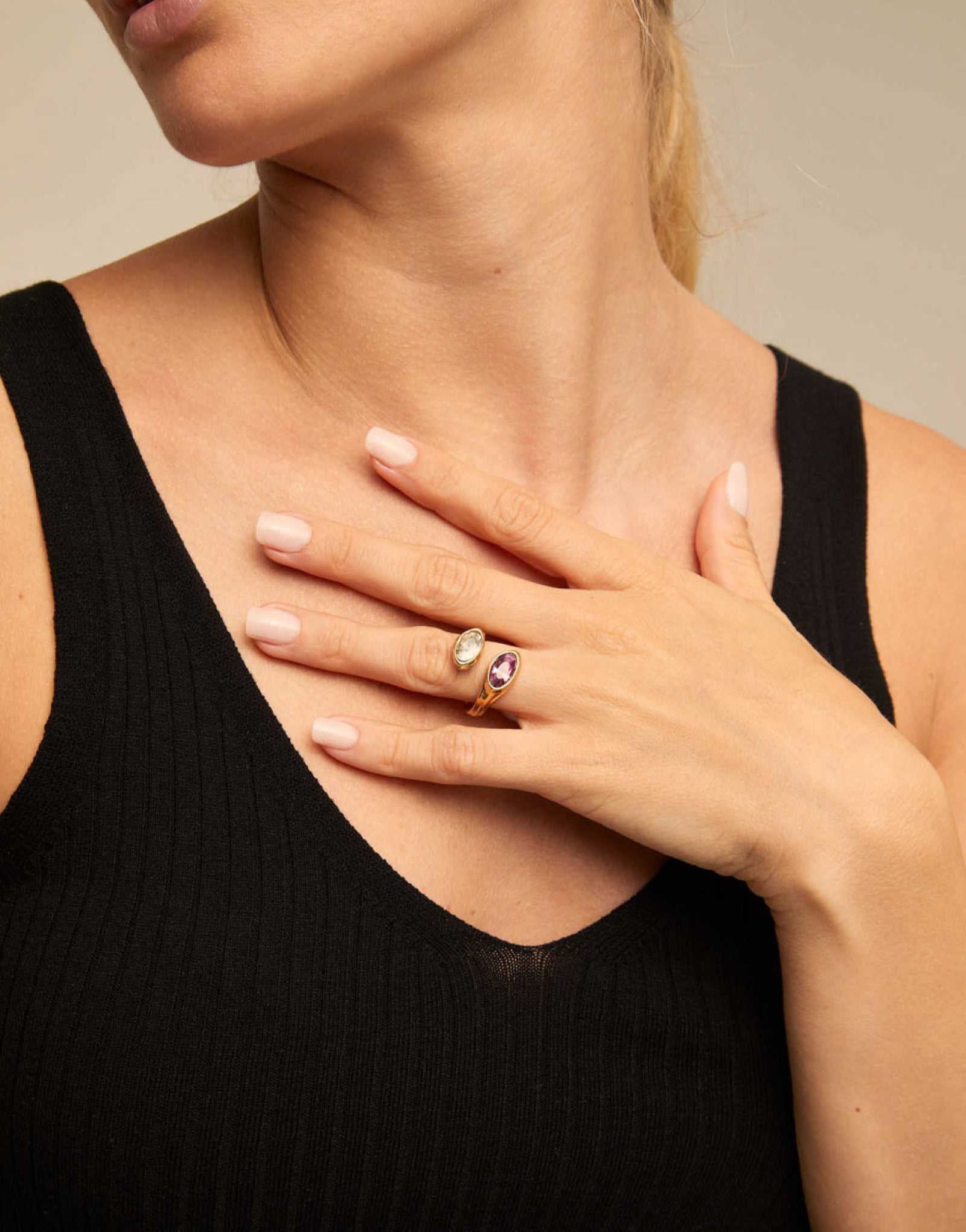 Open ring. Each end features a crystal, one wine colored and the other white. This piece of jewelry was handmade in Spain using artisan techniques on a gold-plated metal alloy. Wear it with the rest of the Radiant collection or any other UNOde50 piece.