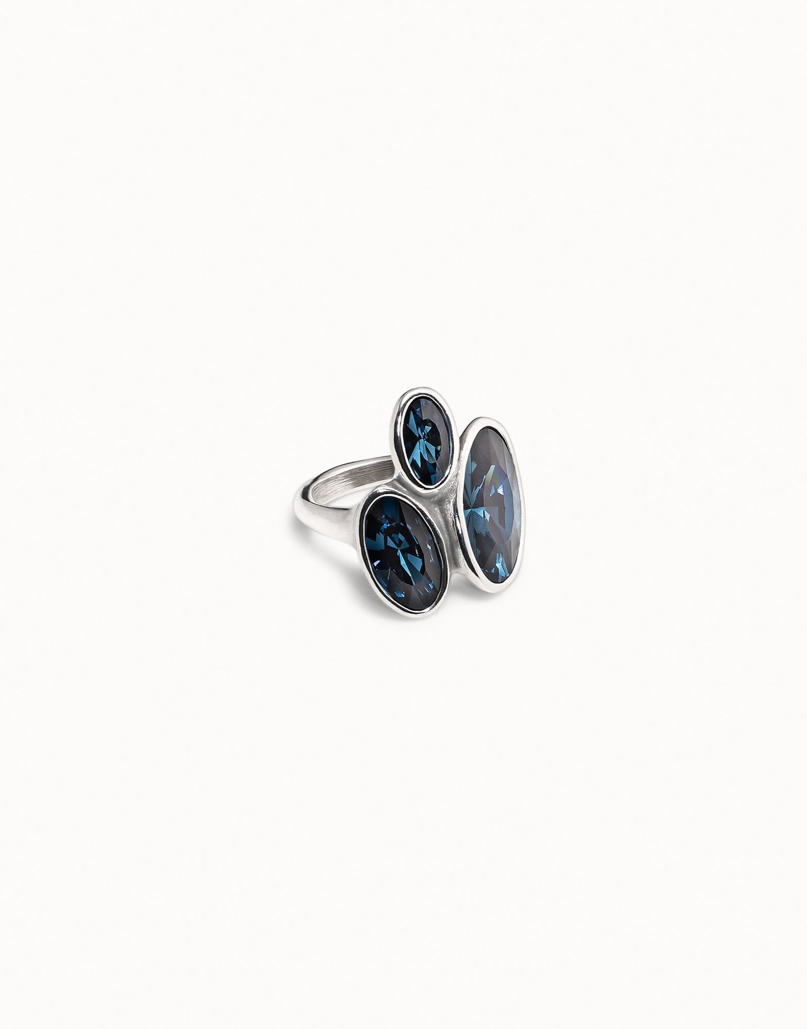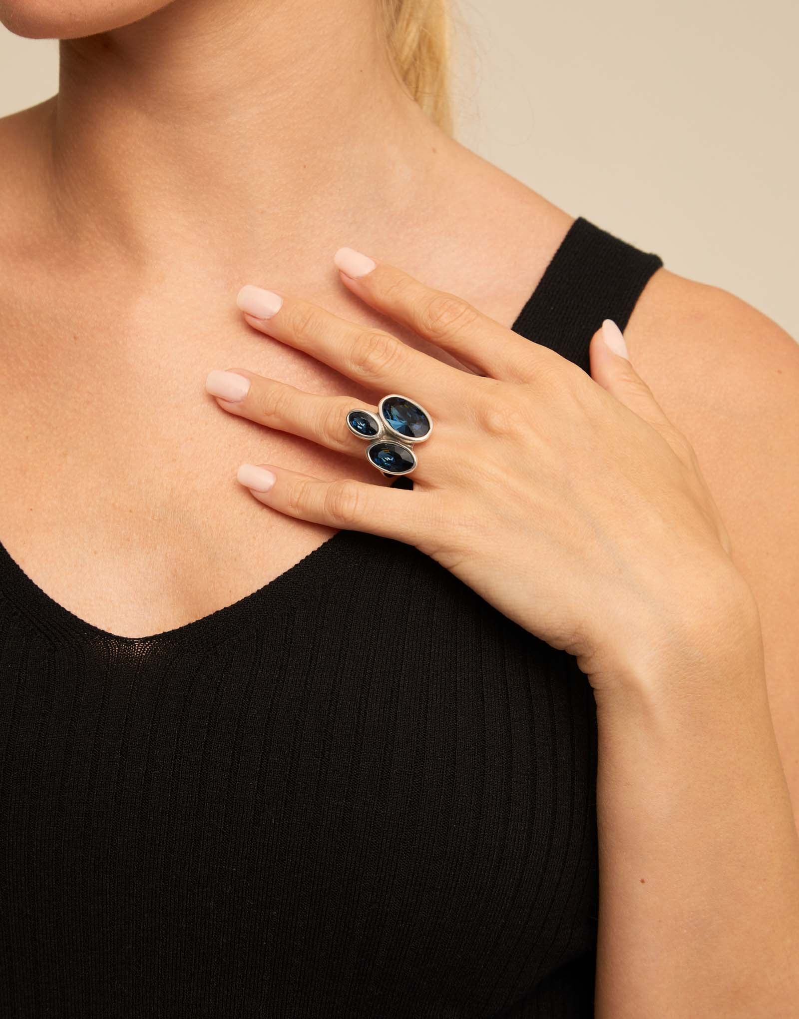 Ring featuring three oval bezel settings with blue crystals. This piece of jewelry was handmade in Spain from a silver-plated metal alloy using an entirely artisan process. Add a touch of color to any look with this unique ring.