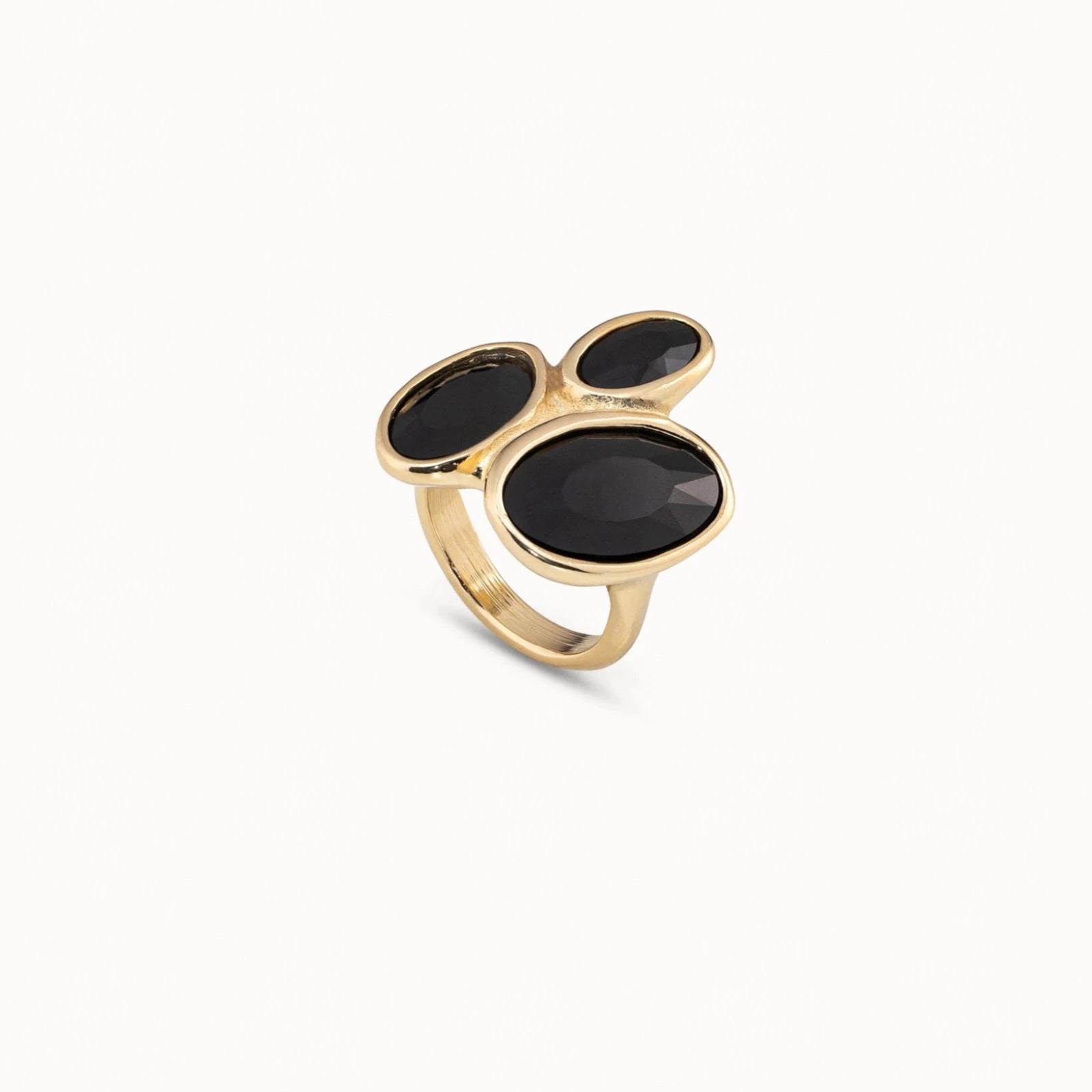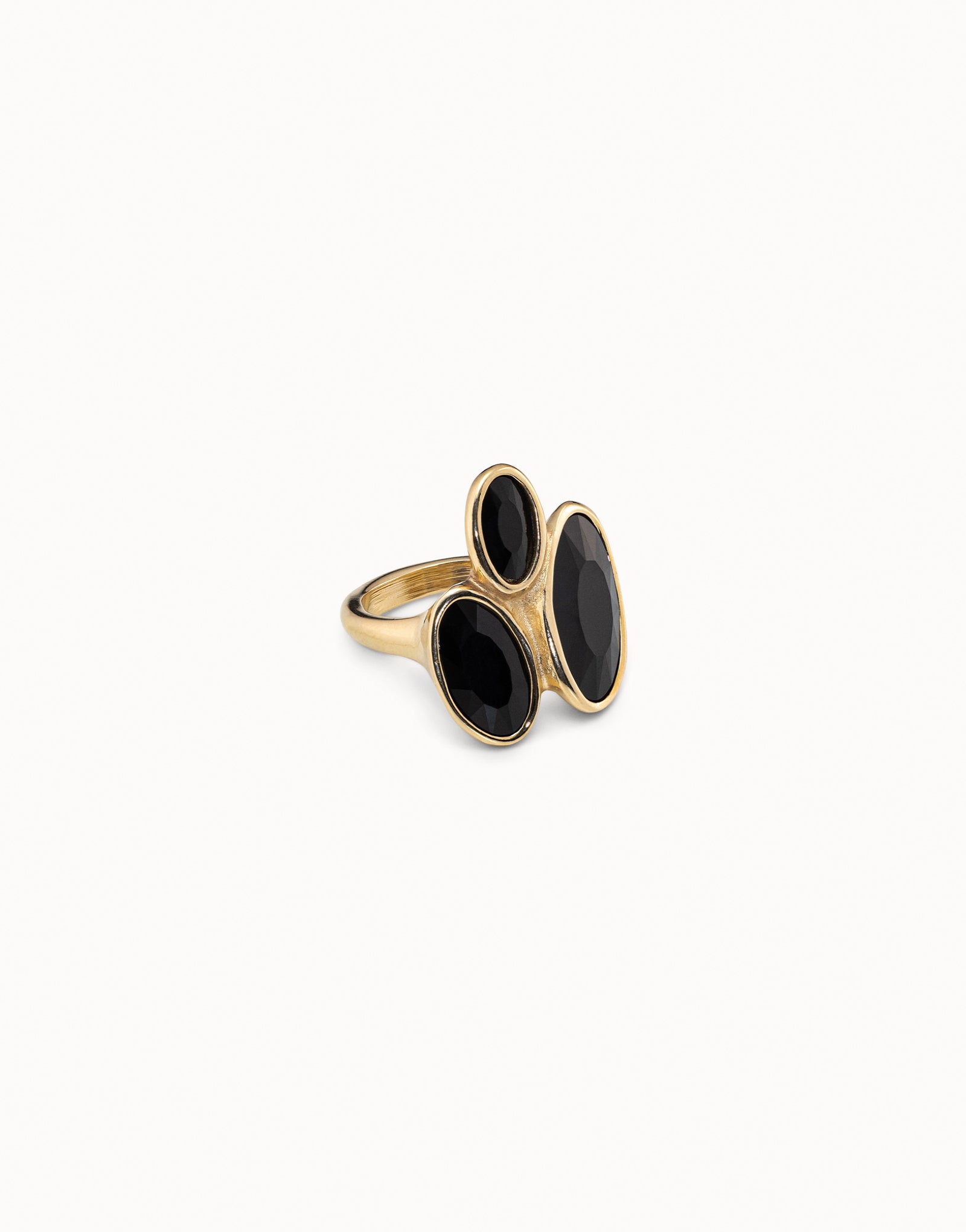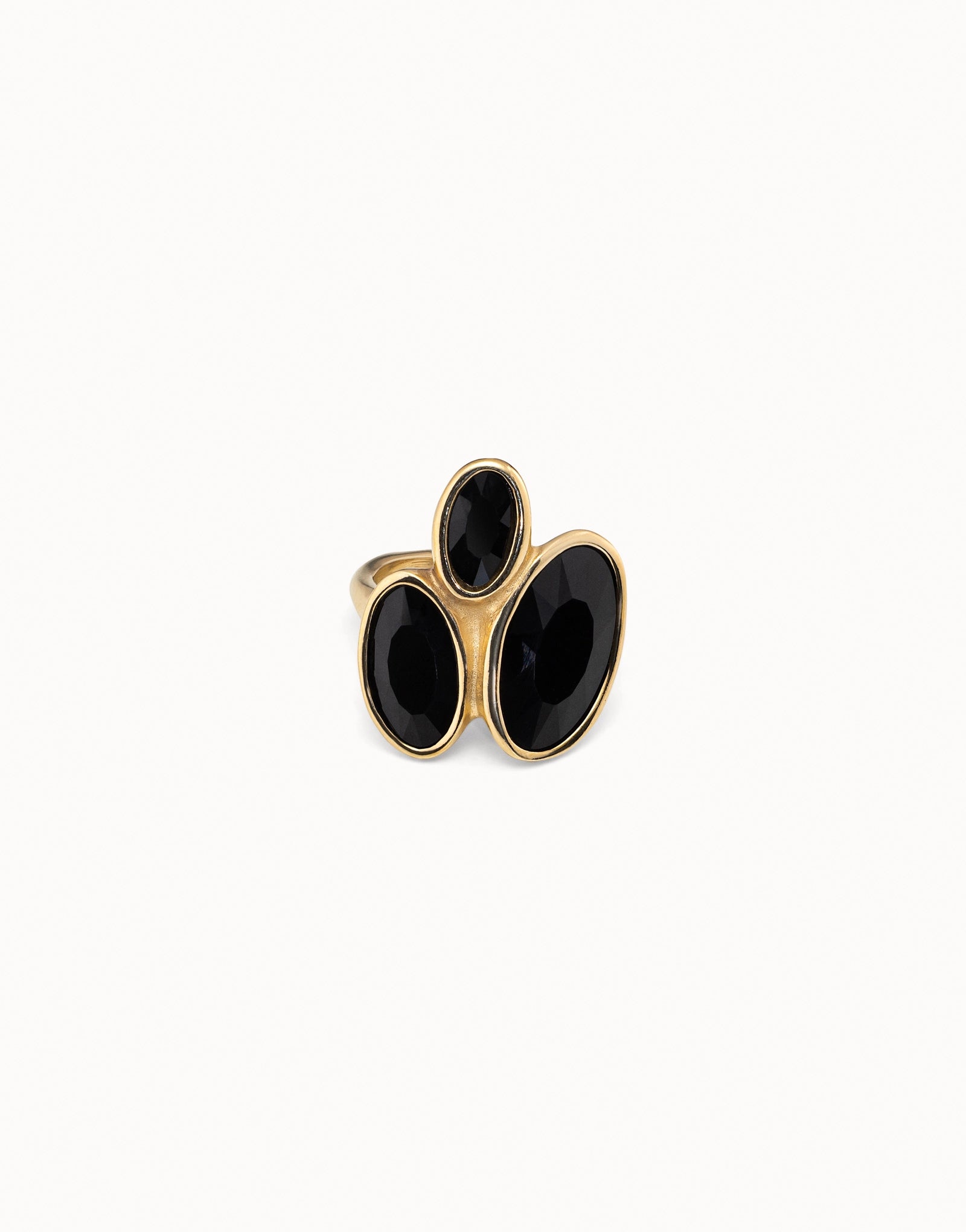 Ring featuring three oval bezel settings with black crystals. This piece of jewelry was handmade in Spain from a gold-plated metal alloy using an entirely artisan process. Treat yourself to this one-of-a-kind original design and you’ll steal the spotlight.