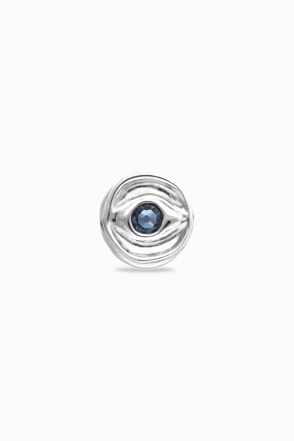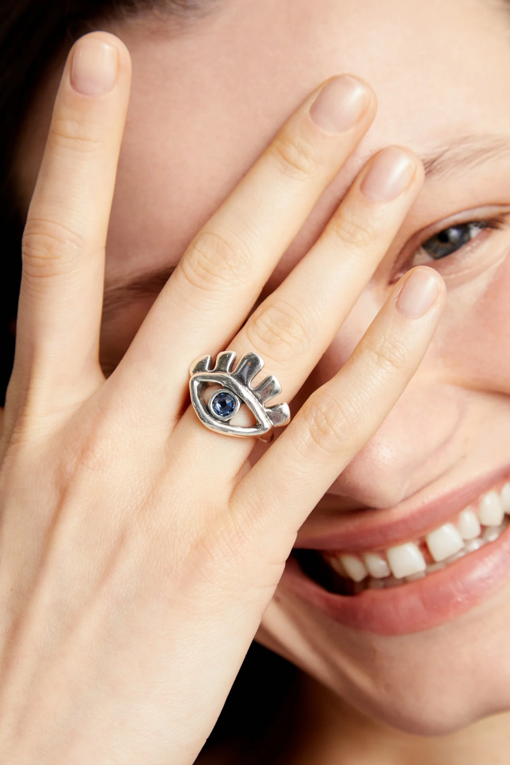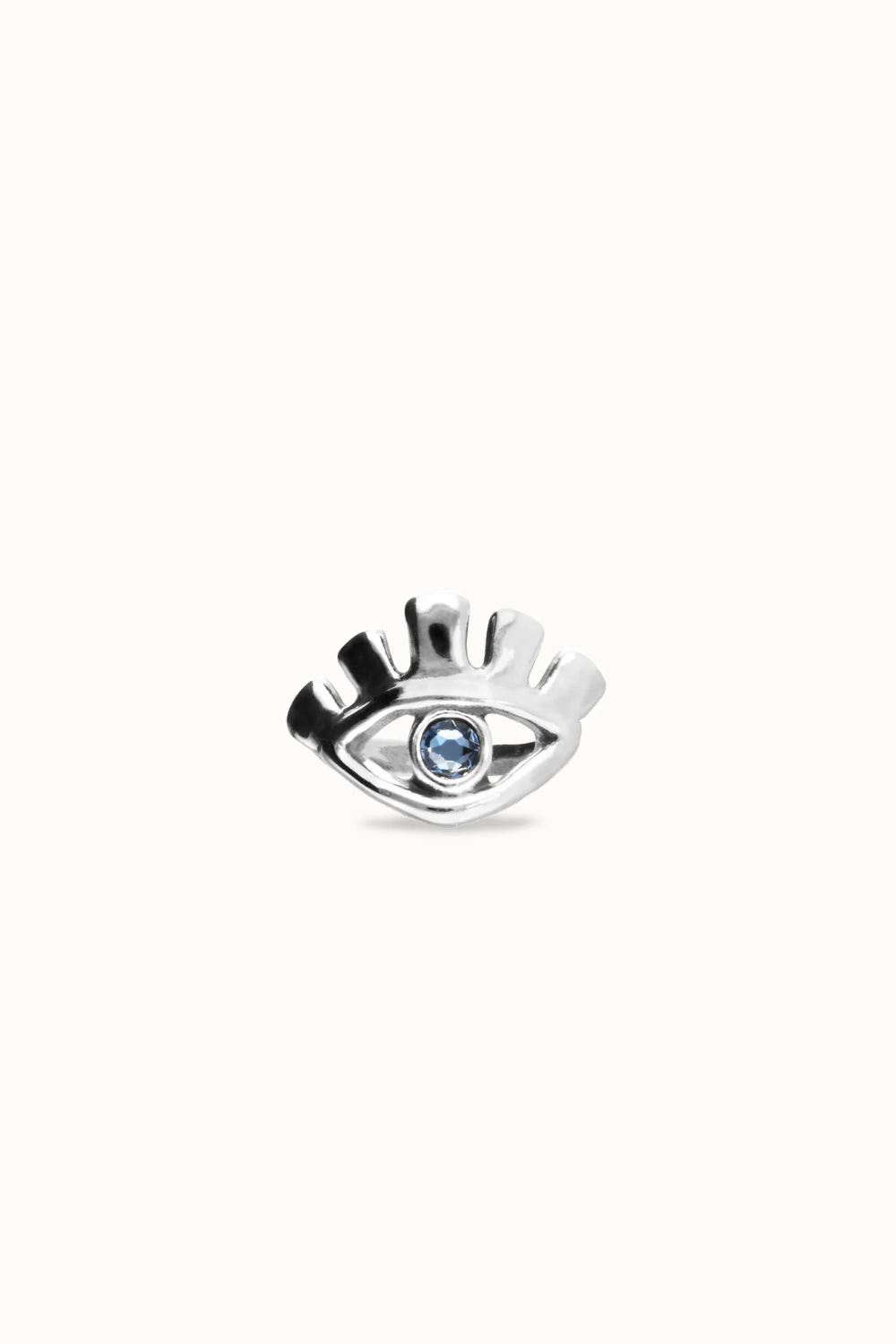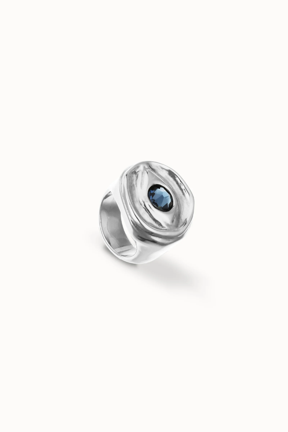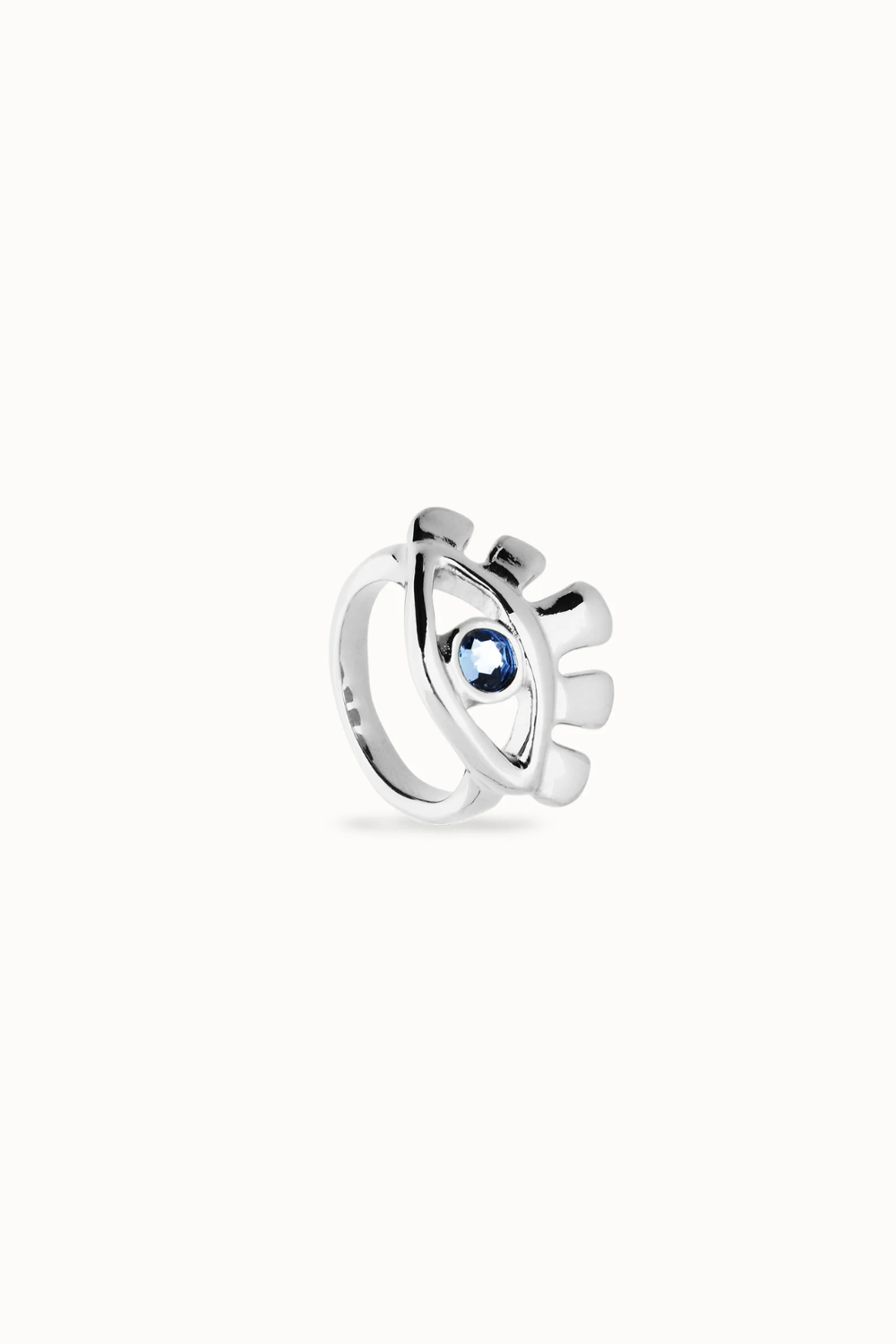 Eye-shaped ring with faceted blue crystal
