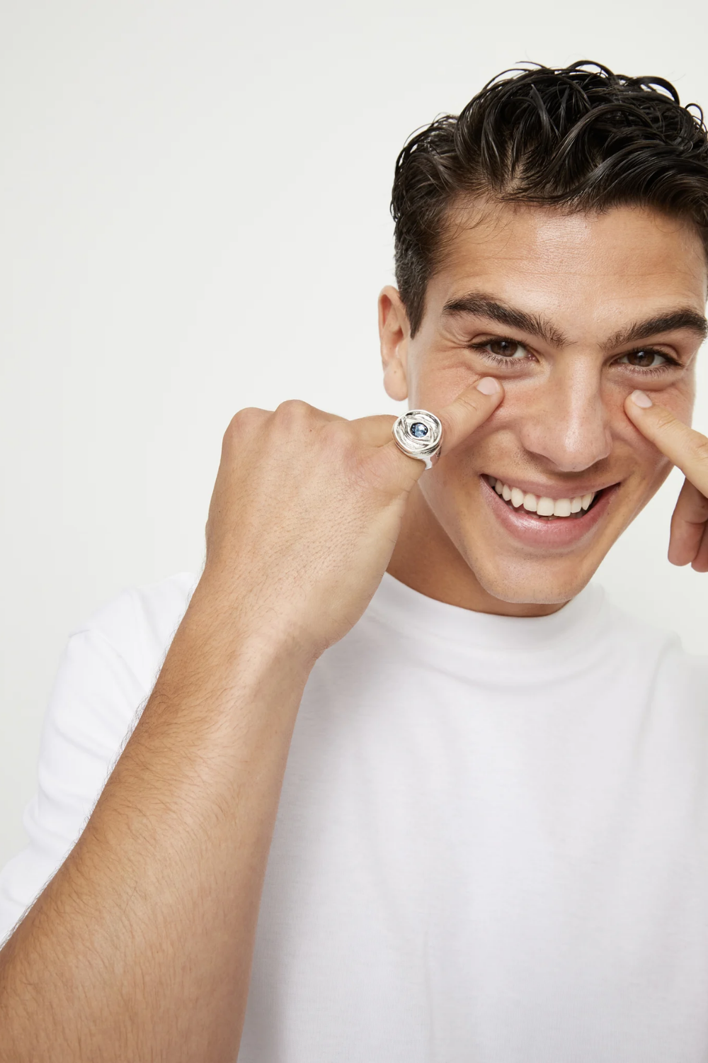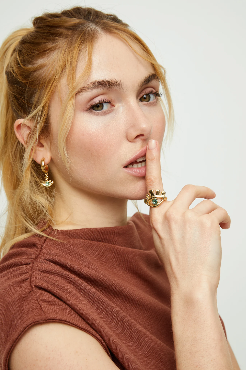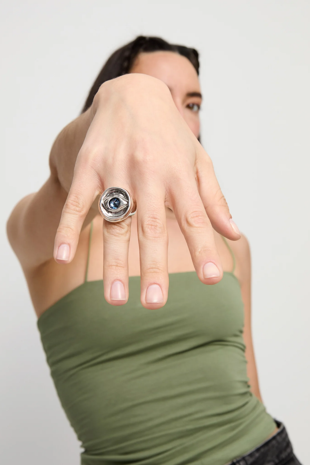 Eye-shaped ring with faceted crystal