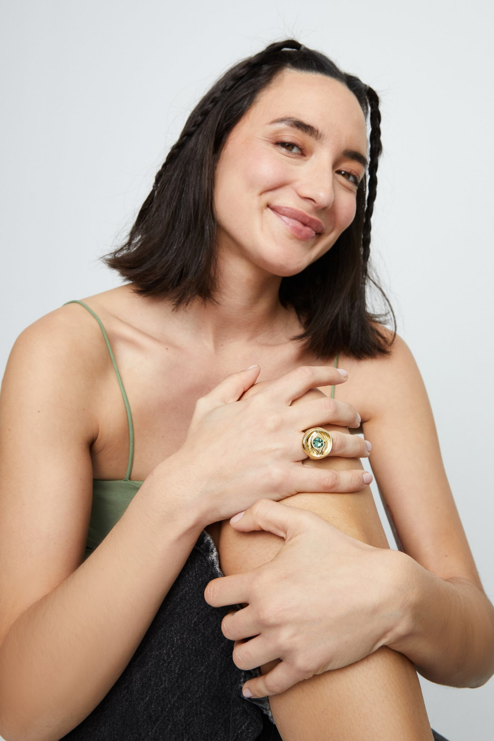 Eye-shaped signet ring with faceted green crystal