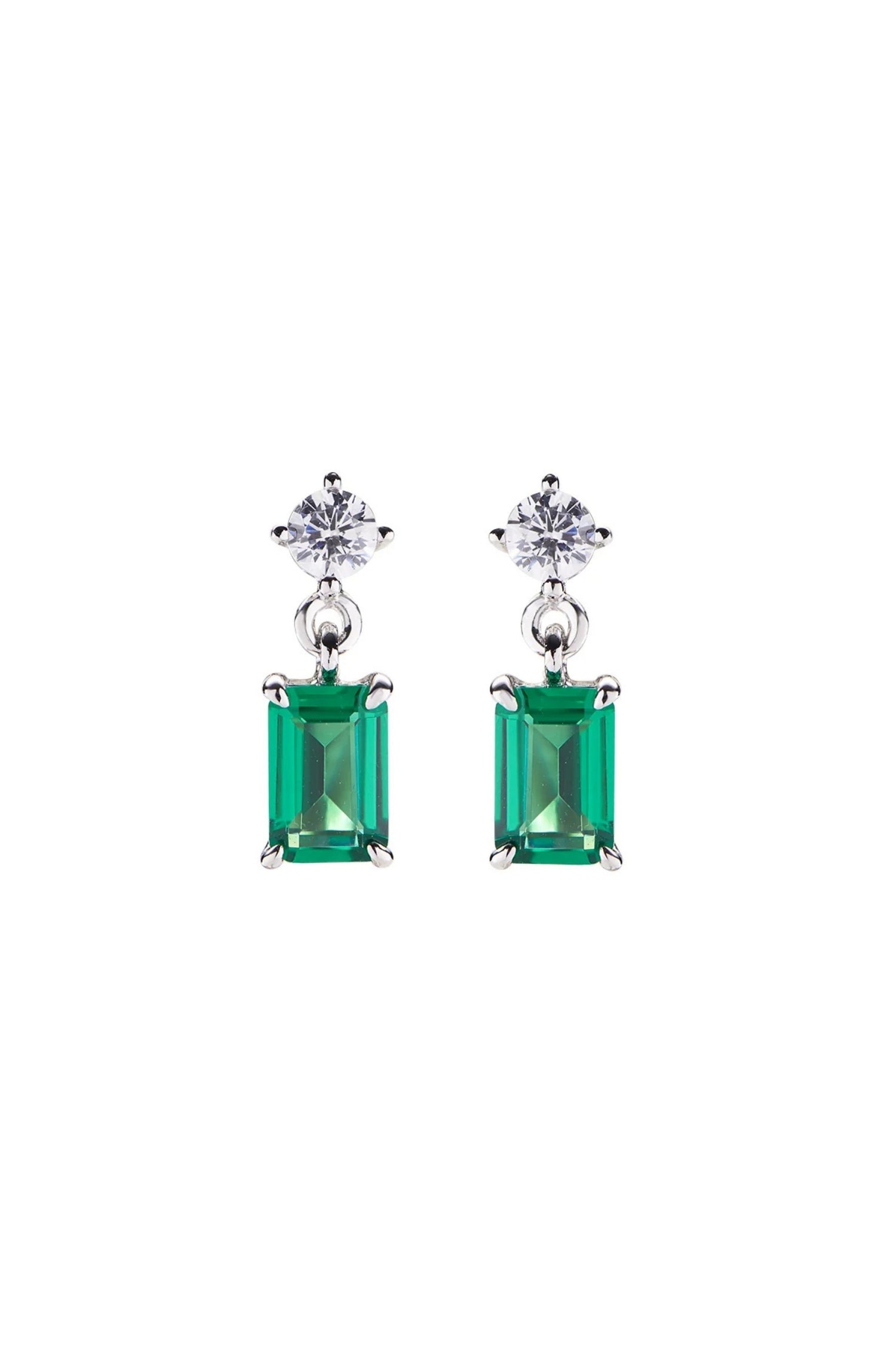 Rhodium-plated sterling silver dangle earrings with round-cut white zirconia and 4 x 6 mm rectangular-cut green zirconia pendant. Total length: approx. 1.2 cm. Butterfly backings.