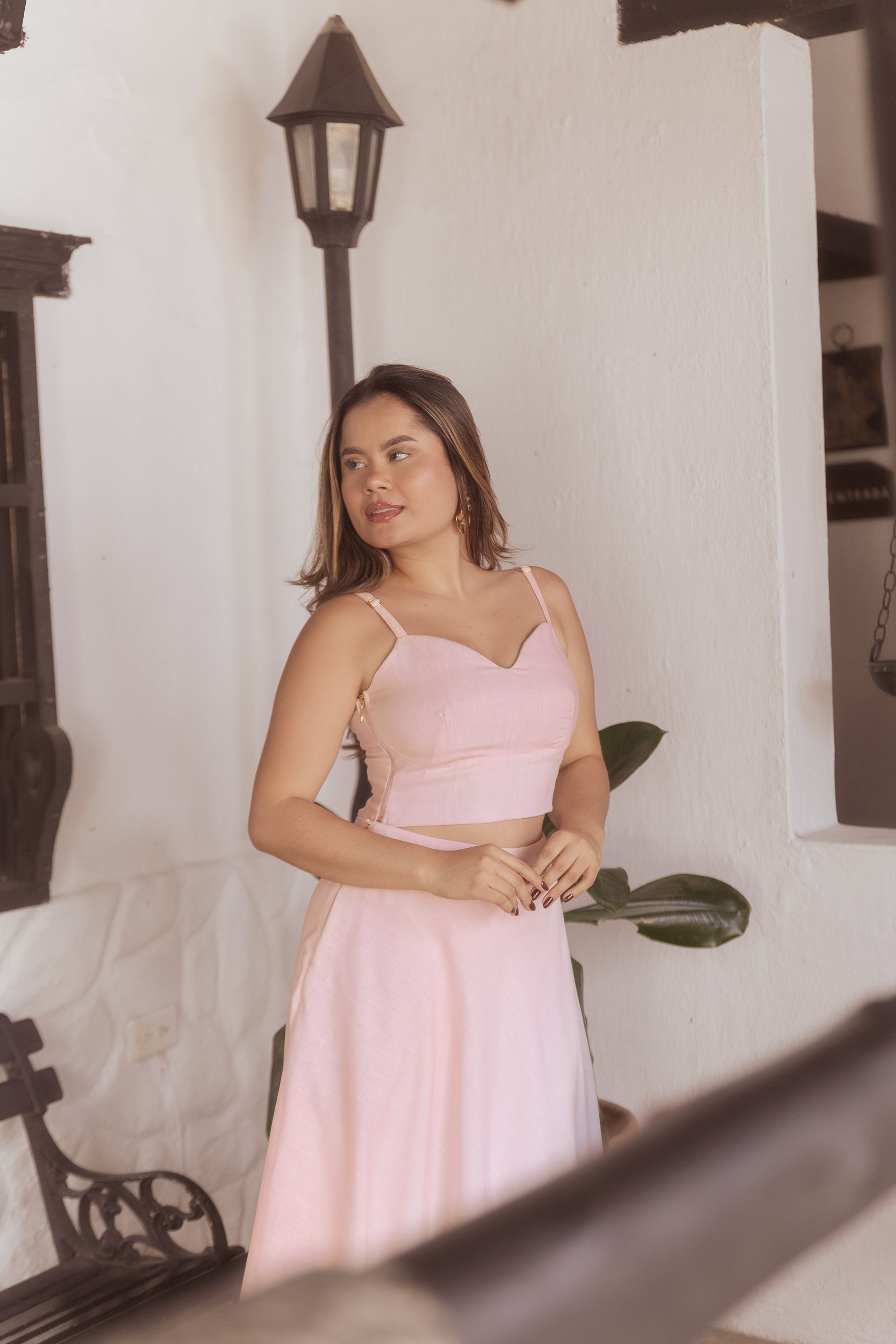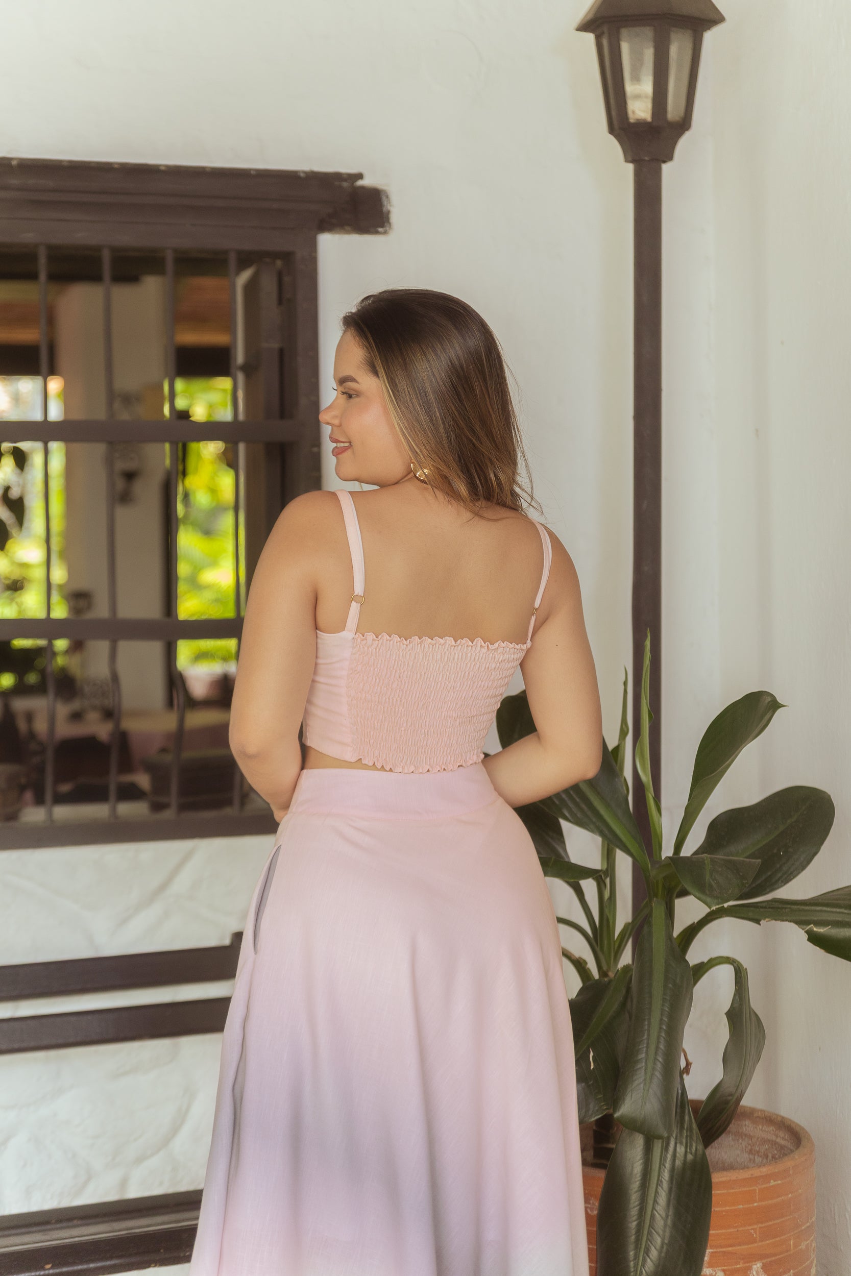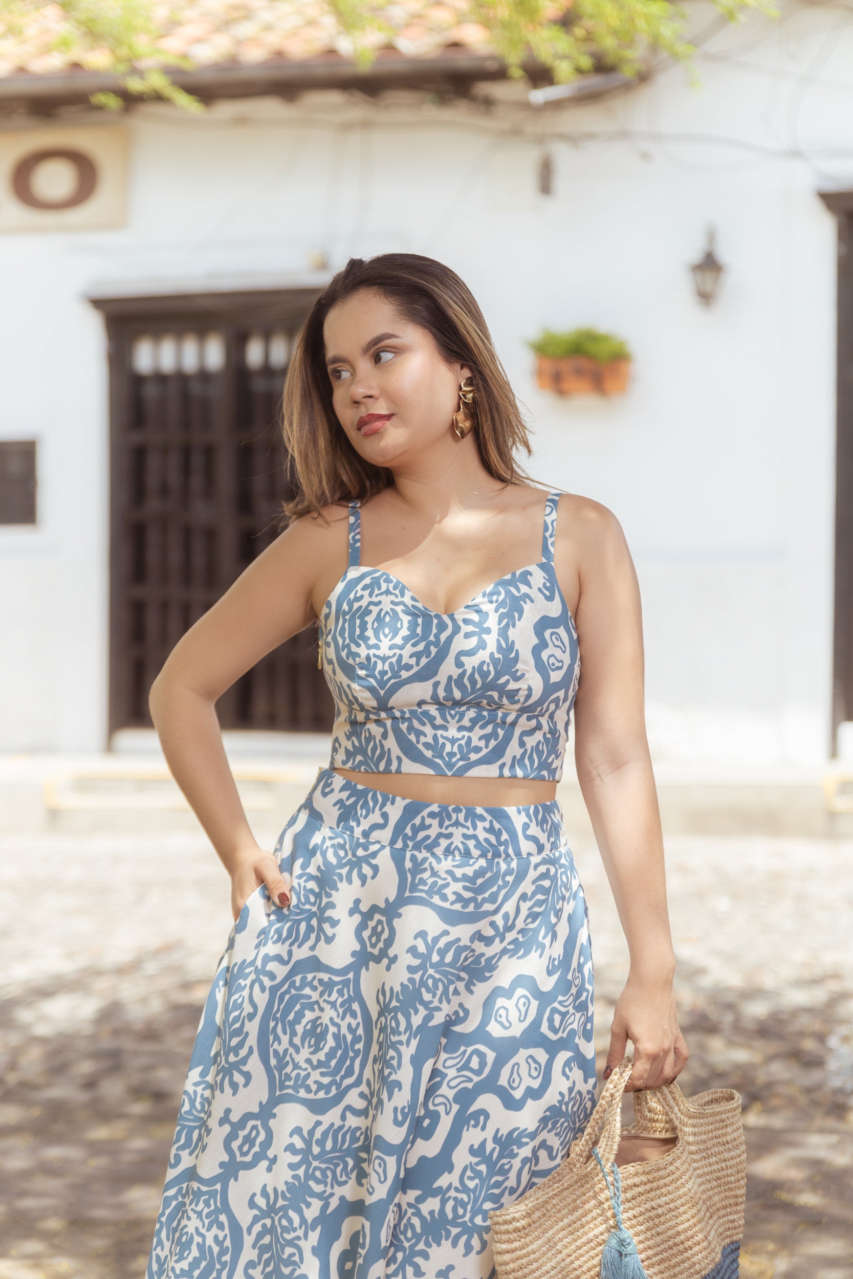 Turn heads with this vibrant two-piece set featuring a fitted crop top with adjustable straps and a flowing high-waist maxi skirt. Designed in a bold tropical print with shades of coral, fuchsia, green, and ivory, this look is perfect for warm-weather events, vacations, or casual chic outings. The flattering silhouette combines comfort and style, giving you effortless sophistication with a playful touch.