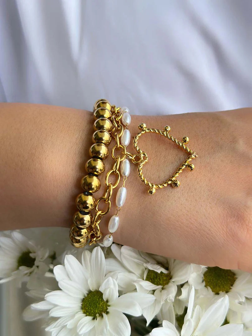 Triple bracelet crafted from shell pearls, 8mm steel beads, a steel chain and clasp, and a 24k gold-plated bronze heart.