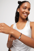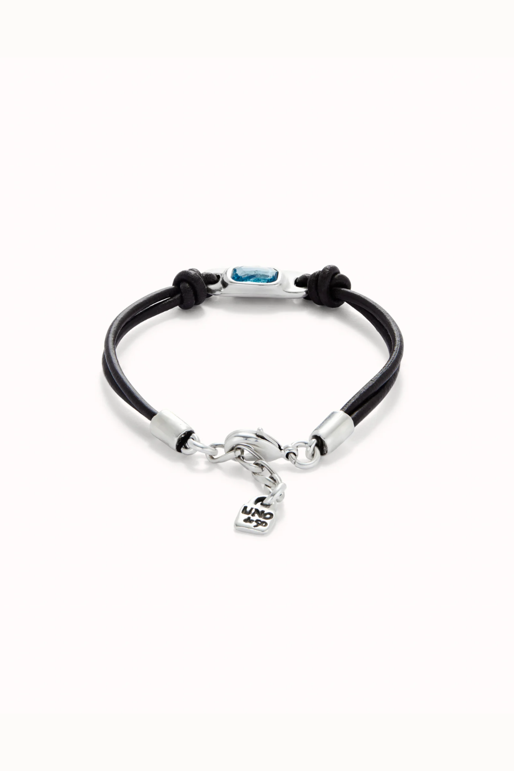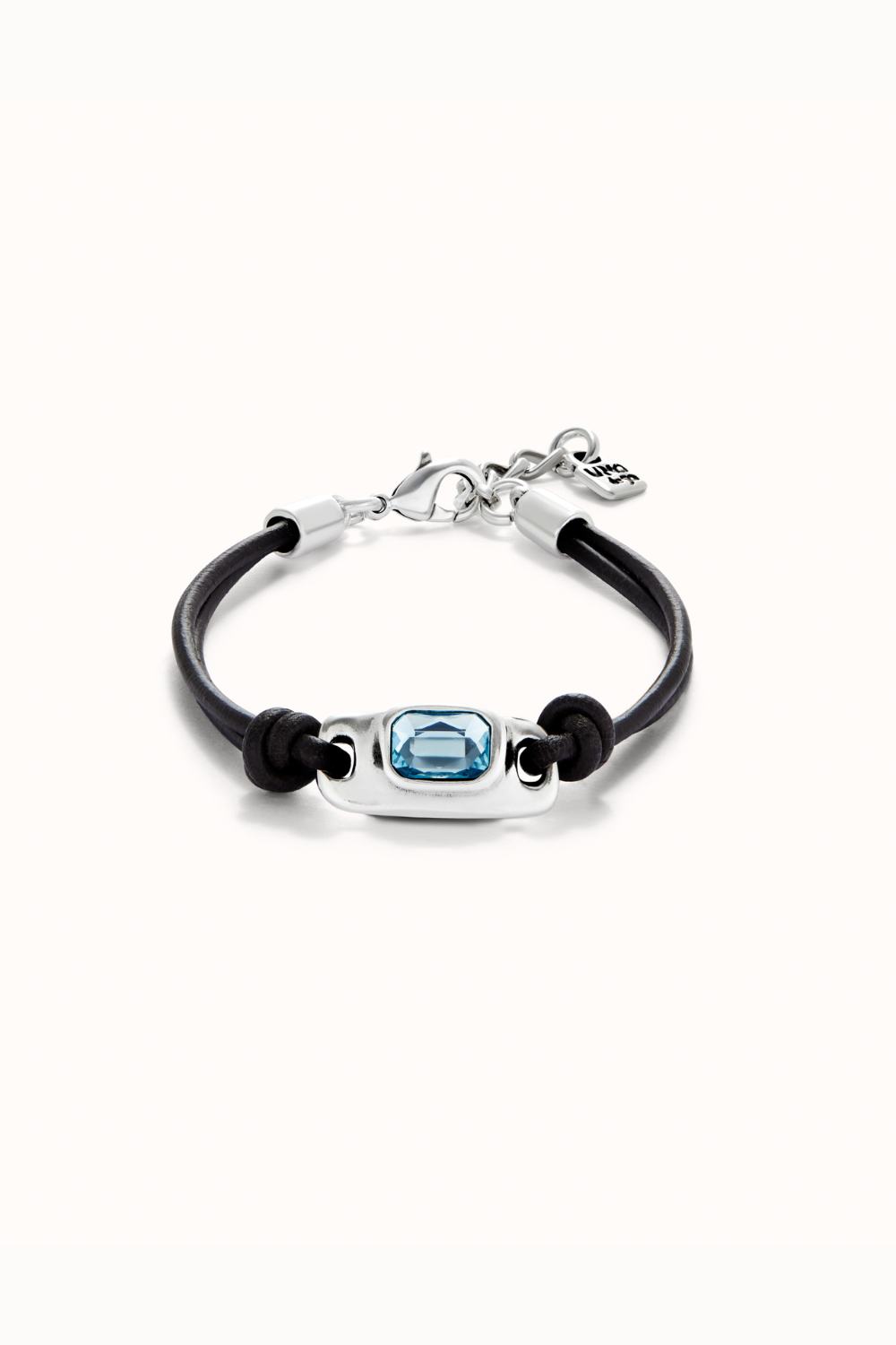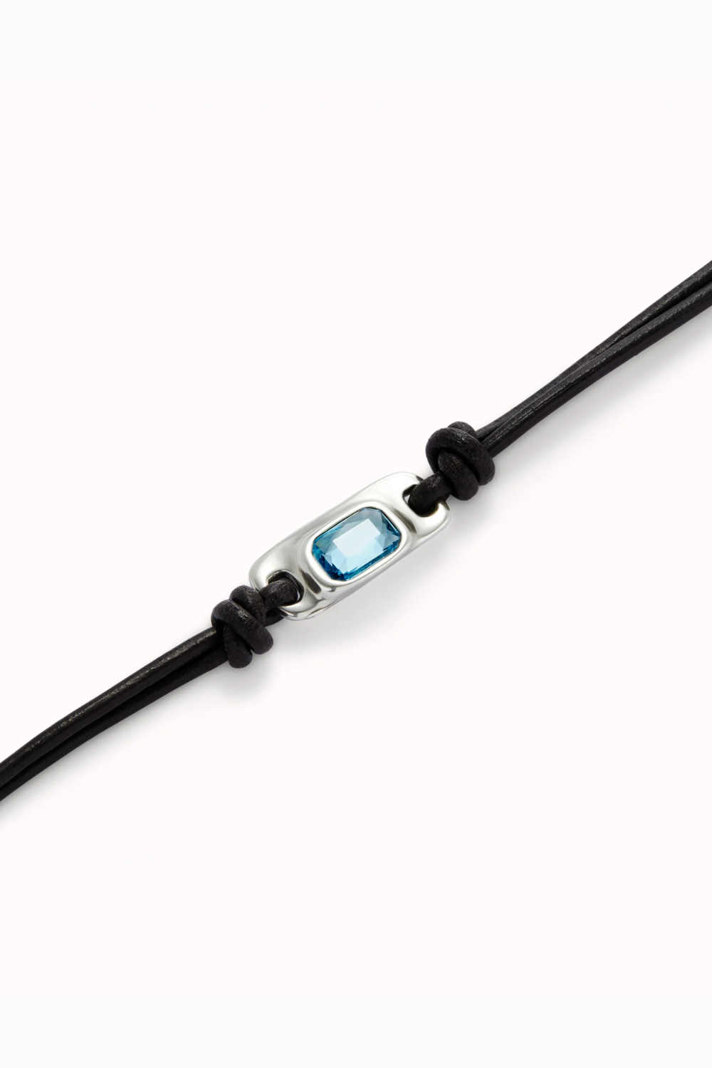 Estilo limpio, carácter moderno y un toque de luz que marca la diferencia. Esta pulsera de cuero negro incorpora una pieza central bañada en plata con un cristal azul claro talla esmeralda que aporta frescura y sofisticación.